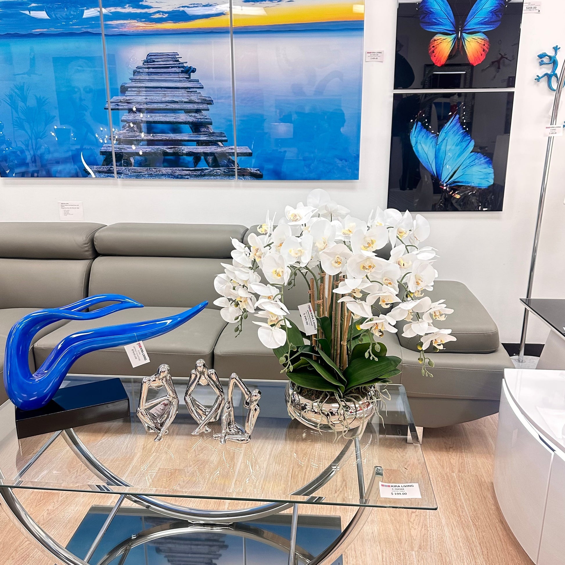 "Elevate your space with the timeless elegance of a white orchid nestled within a sleek silver vase. Each delicate bloom exudes purity and sophistication against the backdrop of the shimmering vessel. A stunning centerpiece that adds a touch of luxury to any interior."