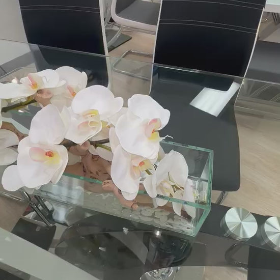 "Experience elegance with our handcrafted white orchid encased in a glass display, adorned with white stones submerged in resin. This exquisite piece brings nature's beauty into your space, evoking serenity and sophistication. Perfect for adding a touch of tranquility and style to any setting."