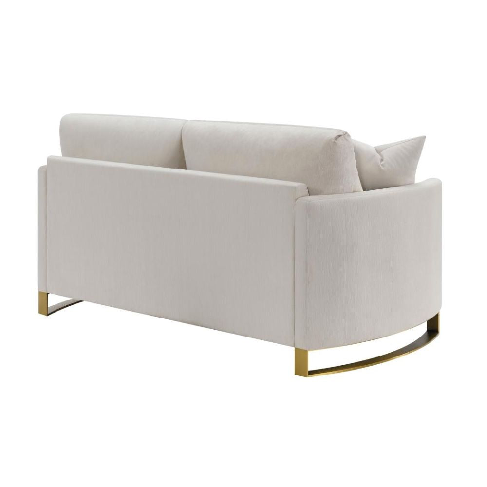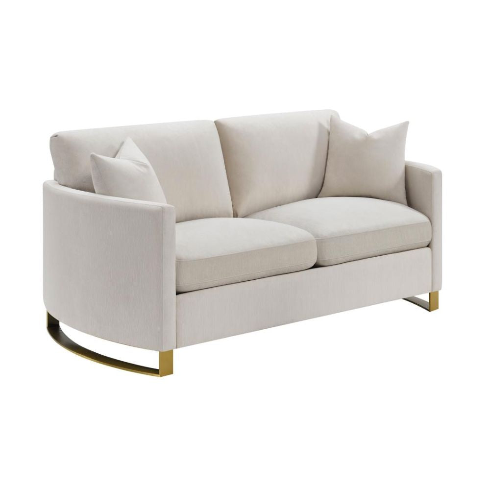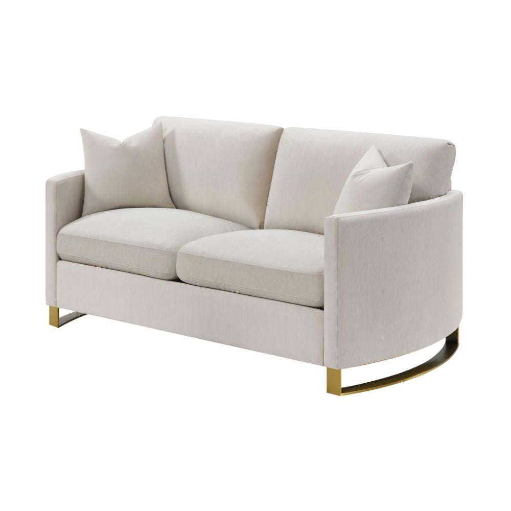 Opulent materials provide optimal comfort in this lush loveseat. It's crafted with kiln-dried solid pine wood, chenille, and foam and features accent pillows for added style and comfort. Reversible cushioned feather down blend seat backs offer soothing comfort after a long day. Elegant beige fabric upholstery stands out even more against the sturdy stainless steel legs with lustrous rose brass accents. You'll love the style and cozy comfort of this elegant loveseat in your living room or den.