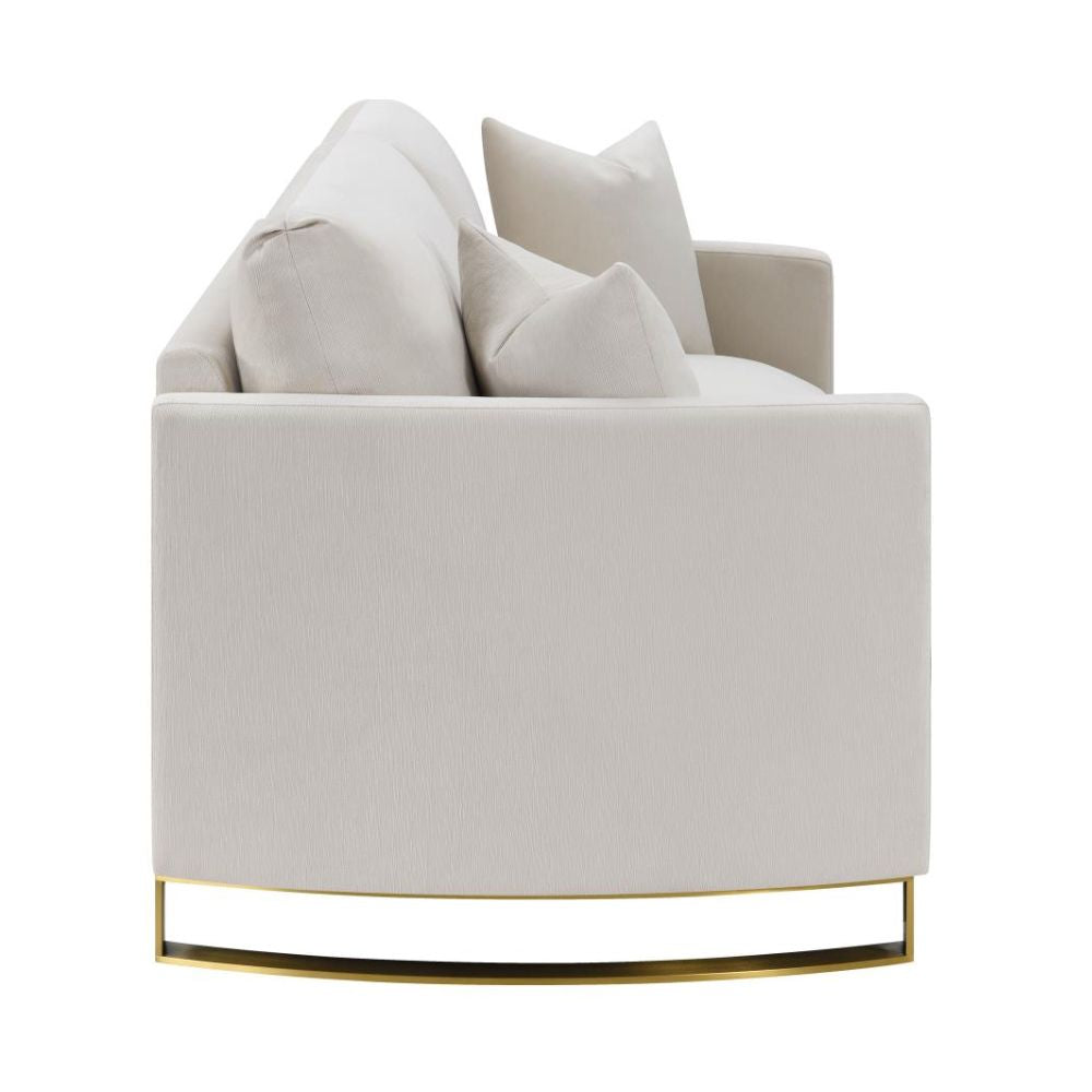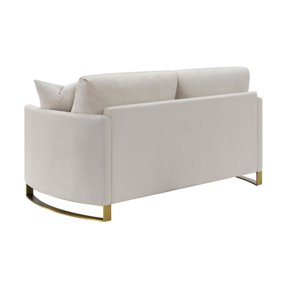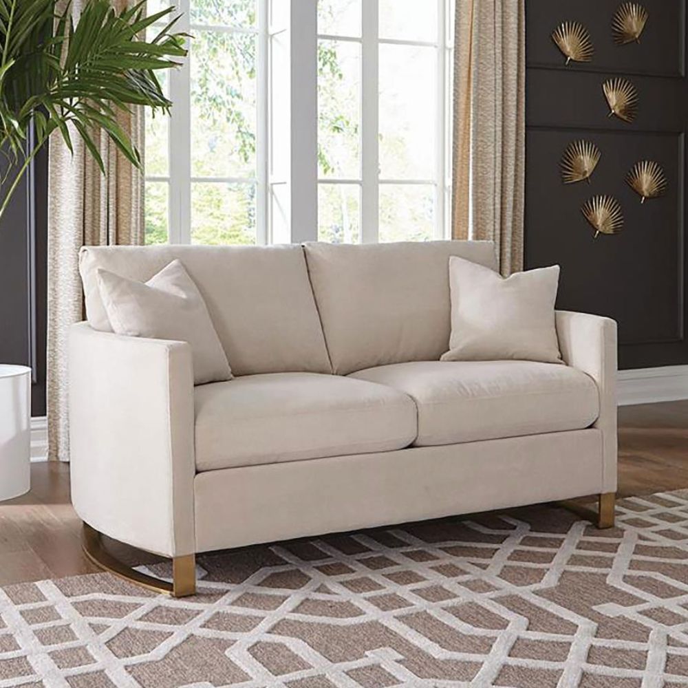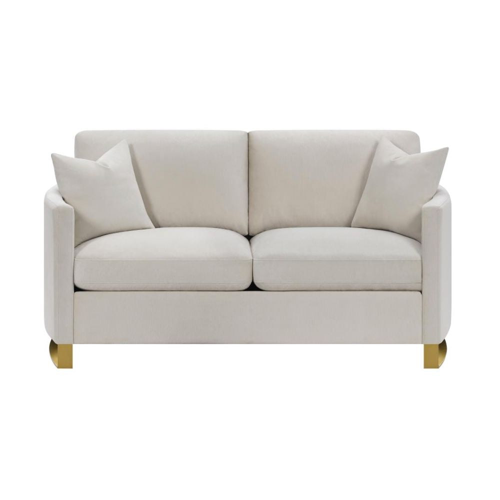 Opulent materials provide optimal comfort in this lush loveseat. It's crafted with kiln-dried solid pine wood, chenille, and foam and features accent pillows for added style and comfort. Reversible cushioned feather down blend seat backs offer soothing comfort after a long day. Elegant beige fabric upholstery stands out even more against the sturdy stainless steel legs with lustrous rose brass accents. You'll love the style and cozy comfort of this elegant loveseat in your living room or den.