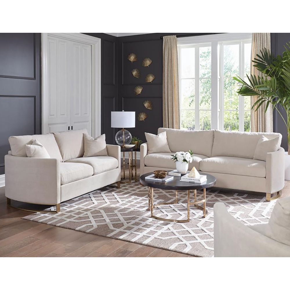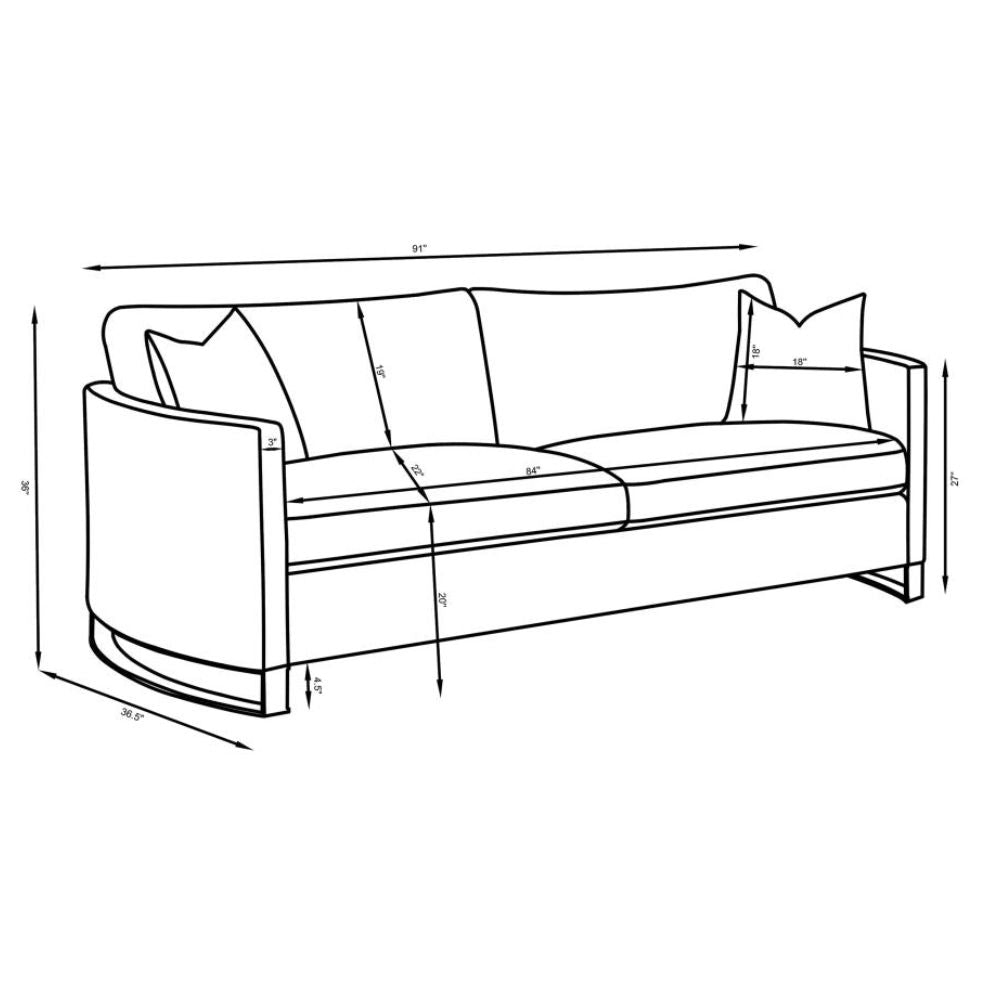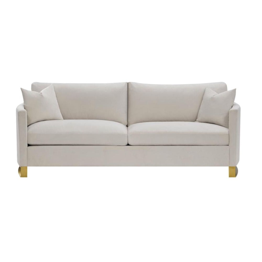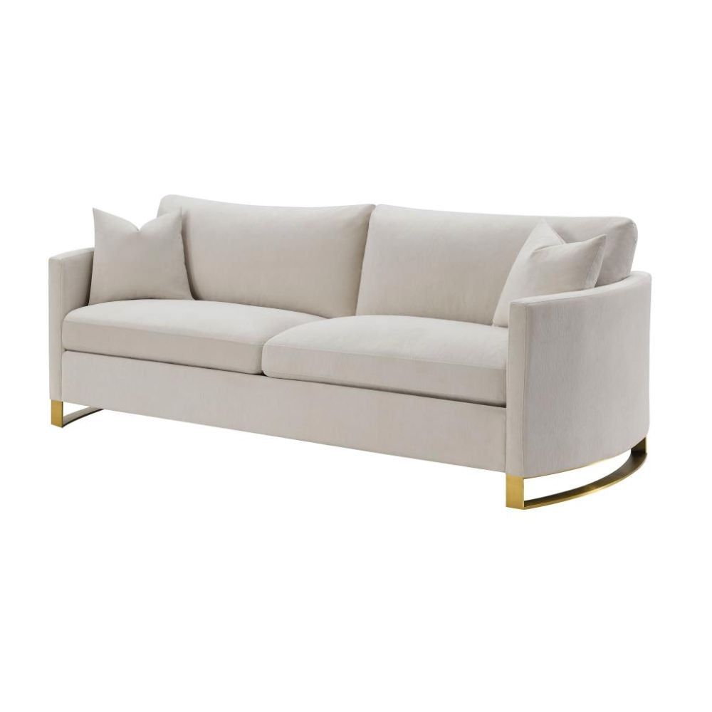 Cool opulence meets magnificent comfort in this plush sofa. It's fashioned with kiln-dried solid pine wood, chenille, and foam with accent pillows for additional style and plush comfort. Reversible feather down blend cushioned seat backs offer unsurpassed relaxation after a hard day. Stainless steel legs feature rose brass accents that make the elegant beige finish even more gorgeous. Enjoy the comforts that this elegant sofa brings to your living room or den.