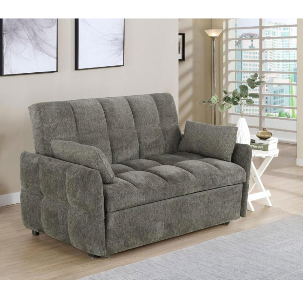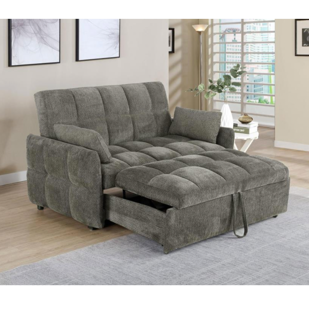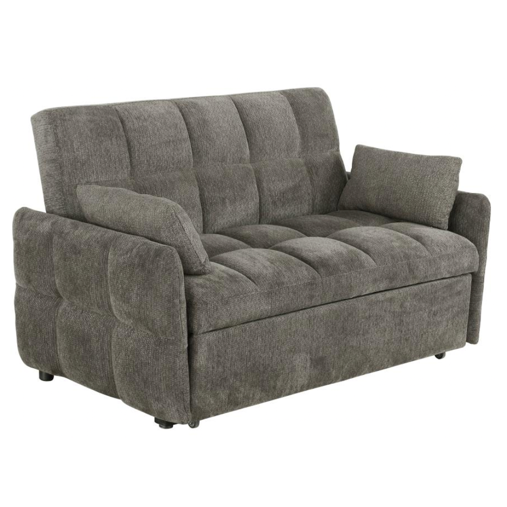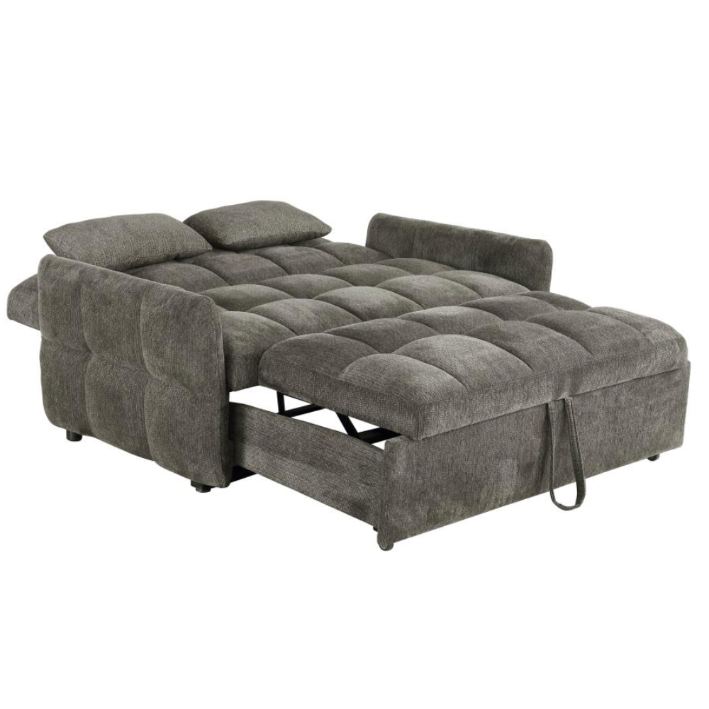 Enjoy the perfect balance of style and functionality with this sleeper sofa. Upholstered in soft chenille, it features all-over tufting for enhanced comfort and a chic, modern design. Slim arms and a rounded rectangular backrest create a contemporary silhouette, while a fold-flat backrest and pull-out sleeper mechanism provide effortless conversion into a bed. With a kiln-dried hardwood frame, durable sinuous spring decking, and a memory foam topper, this sofa ensures long-lasting support and comfort. Perfect for a living room or guest bedroom, it includes two pillows for added convenience.