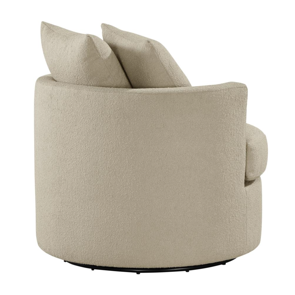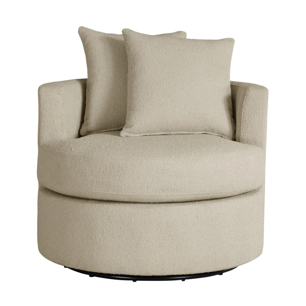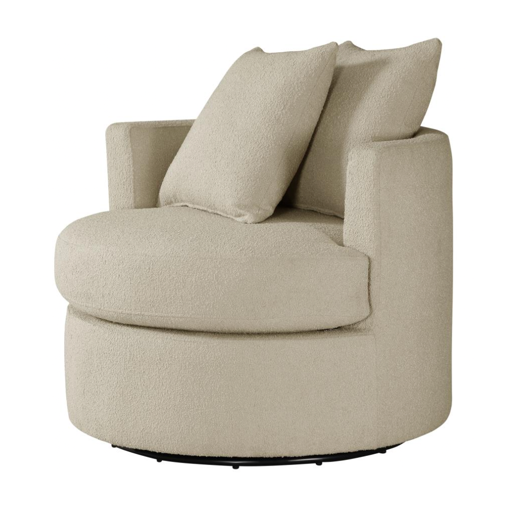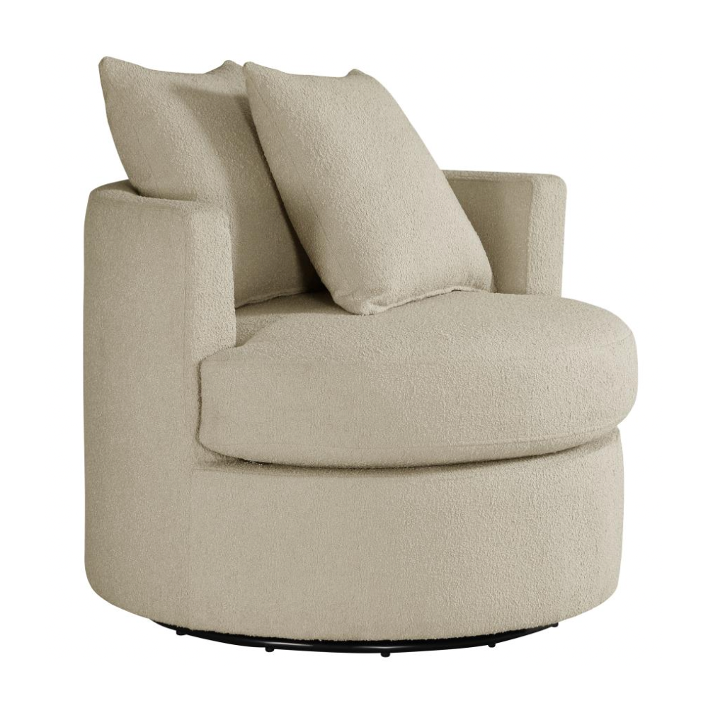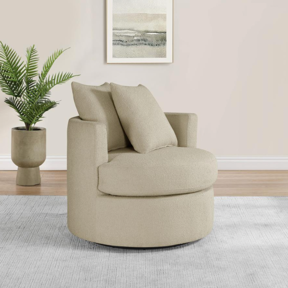 Elevate your living space with the stylish versatility of this modern swivel accent chair. Featuring a compact round frame and a swivel base, it’s perfect for cozy lounging or dynamic entertaining. Pocket coil springs and foam cushioning in the seat ensure optimal comfort, while the rounded backrest and included pillows add a touch of softness. Warm upholstery complements any decor, making this chair a chic and functional addition to your den or living room.