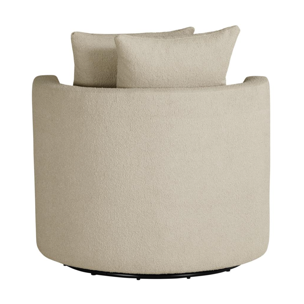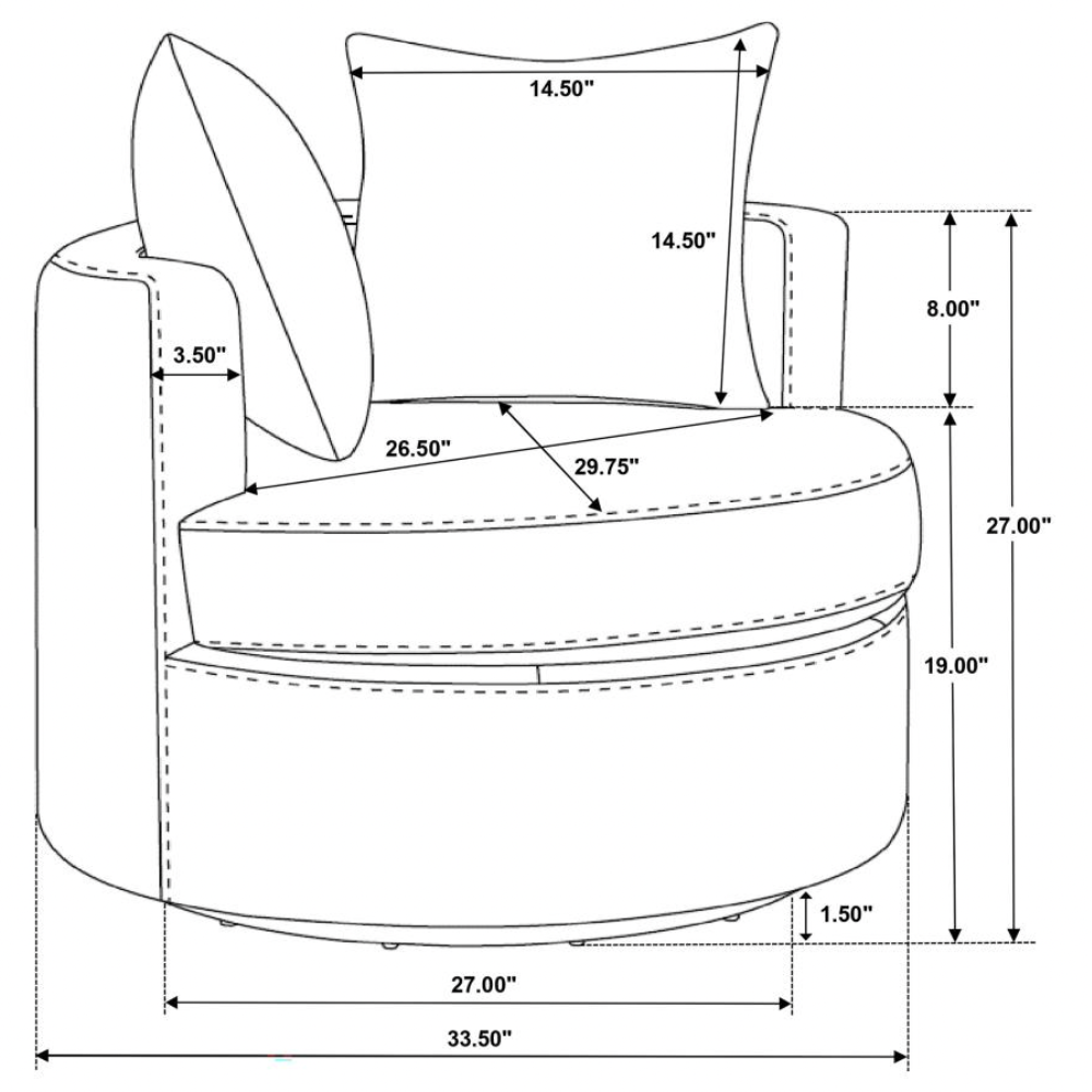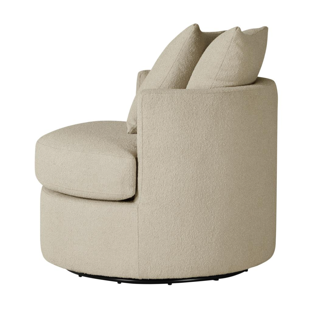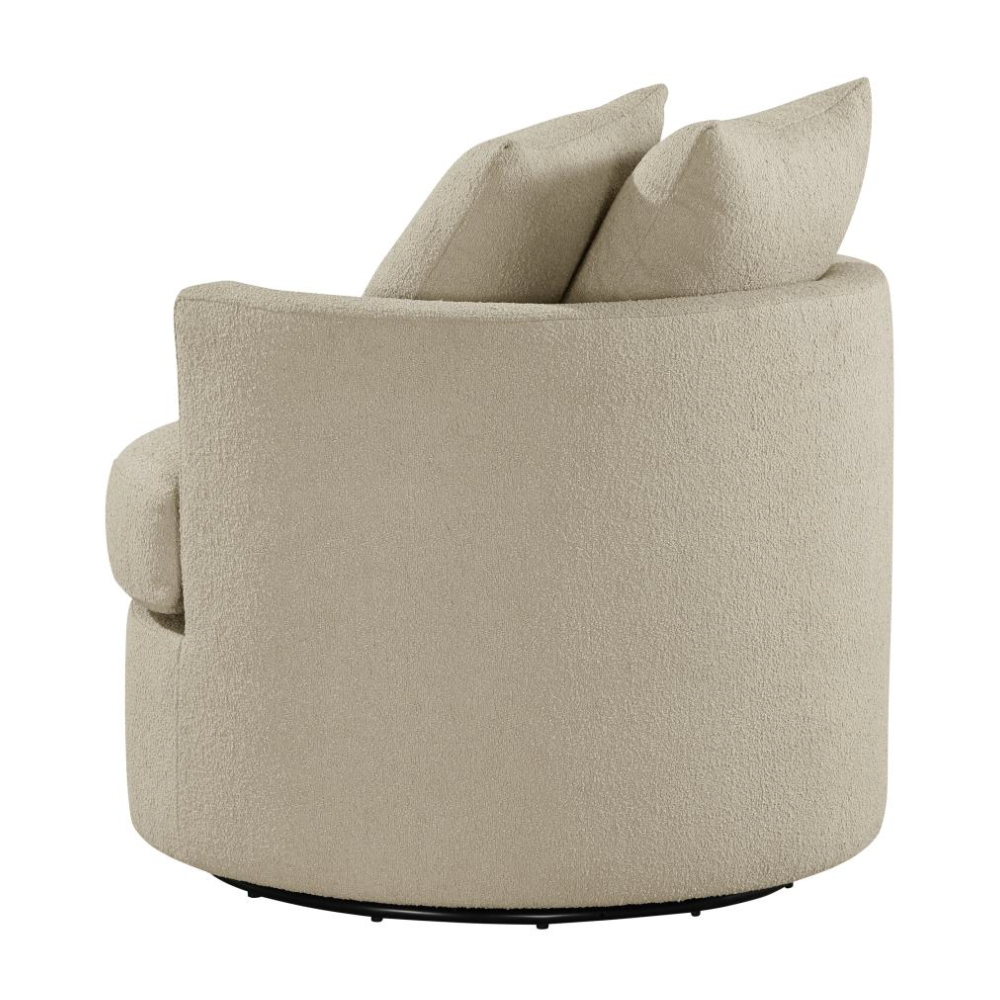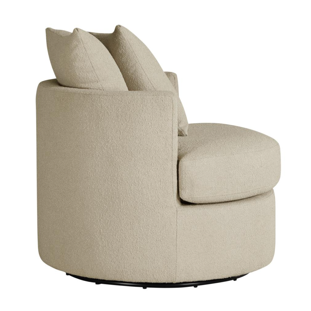 Elevate your living space with the stylish versatility of this modern swivel accent chair. Featuring a compact round frame and a swivel base, it’s perfect for cozy lounging or dynamic entertaining. Pocket coil springs and foam cushioning in the seat ensure optimal comfort, while the rounded backrest and included pillows add a touch of softness. Warm upholstery complements any decor, making this chair a chic and functional addition to your den or living room.