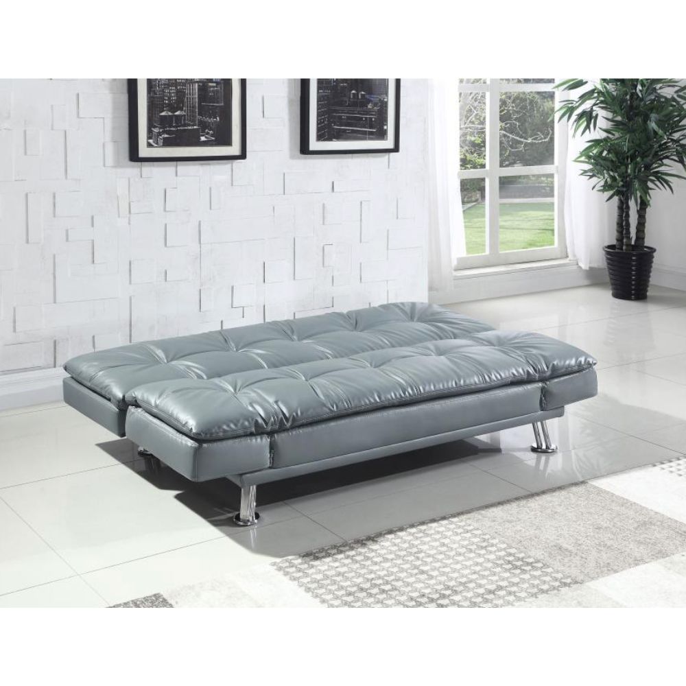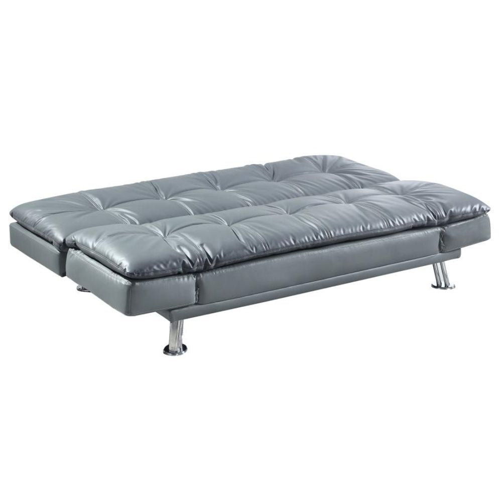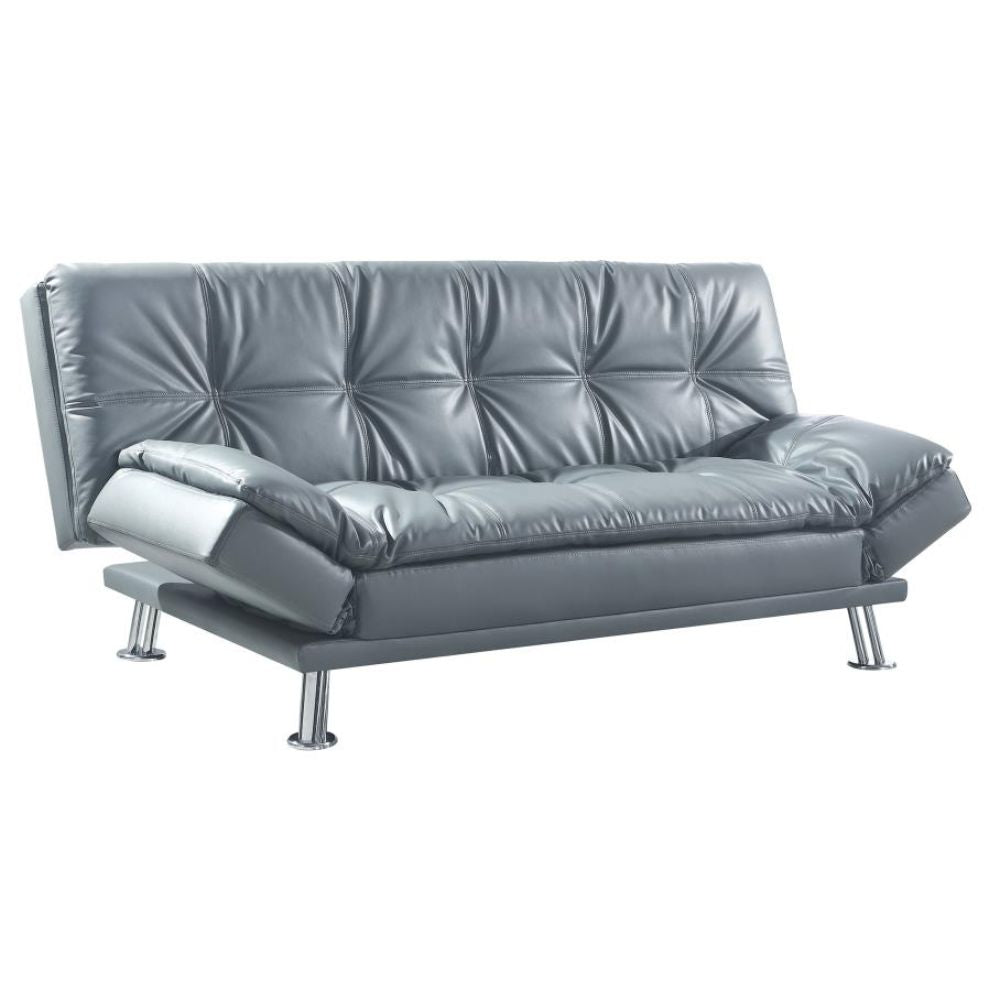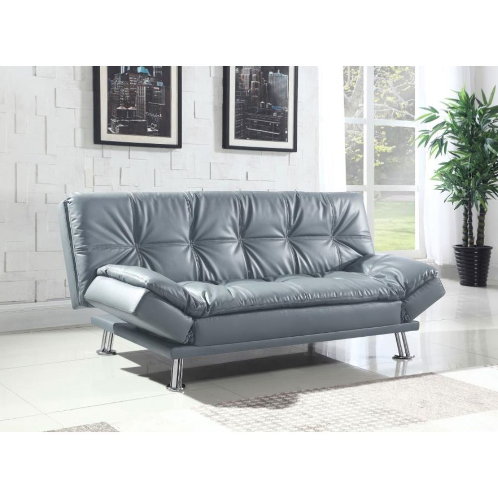 The contemporary Dilleston collection presents this sofa bed and futon that adds distinctive style and function to a family room or living room. It's upholstered in dashing grey leatherette that matches any decor. Plush pillow-top seating simply enwraps you in comfort. Adjustable armrests hold your arms or head, depending on your mood.