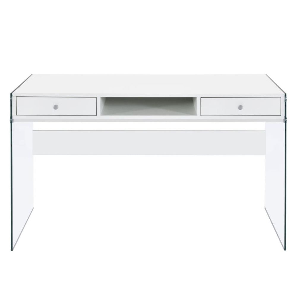 Blending mid-century modern with contemporary design, this writing desk offers a fun and updated aesthetic for any space. Its slender and minimalist design provides just enough room to work and store essentials. The top desk unit features two drawers with full extension drawer glides and an open center compartment for compact storage of books and media. The desk combines a weathered grey finish with thick clear tempered glass side panels, creating an intriguing mix of materials and a fashion-forward look.