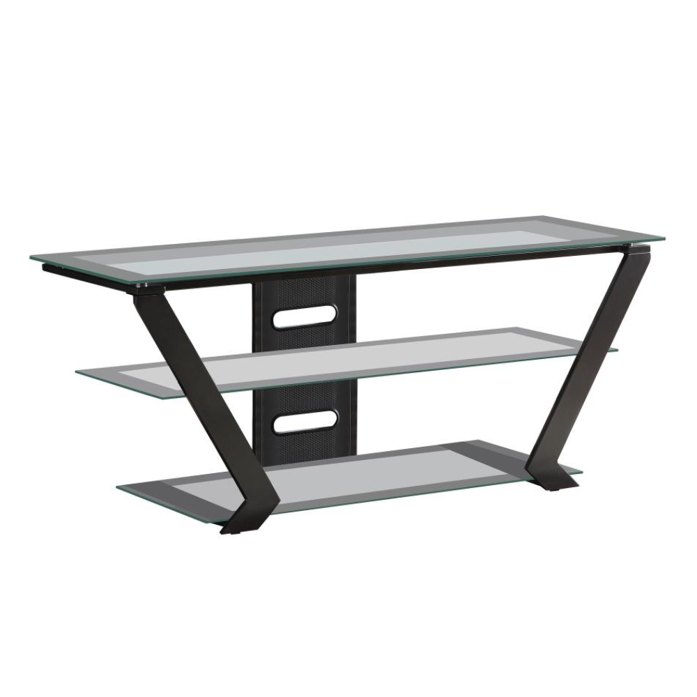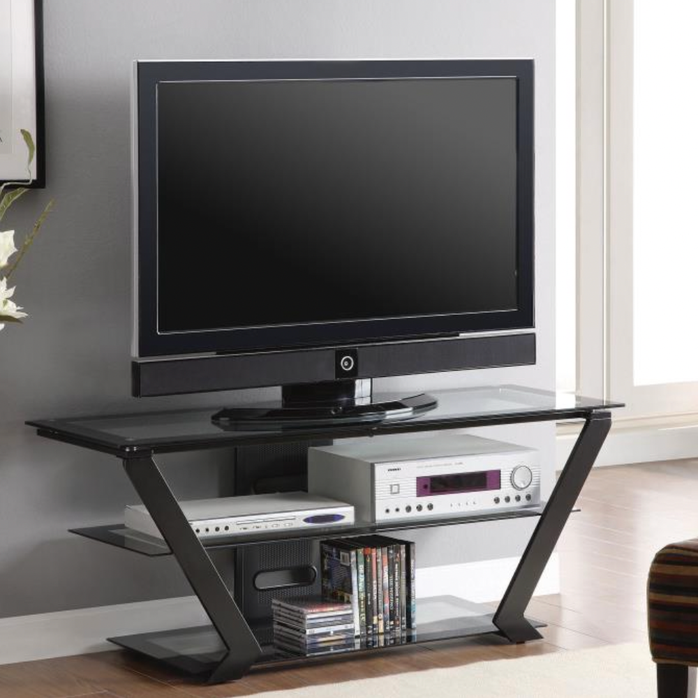Entertain in style with the sleek, modern appeal of this contemporary TV console. Its bold black steel frame and flared silhouette create a striking visual, while clear tempered glass shelves provide both durability and an airy aesthetic. With two graduated tiers for ample storage, this console blends form and function effortlessly, perfect for any modern media setup.