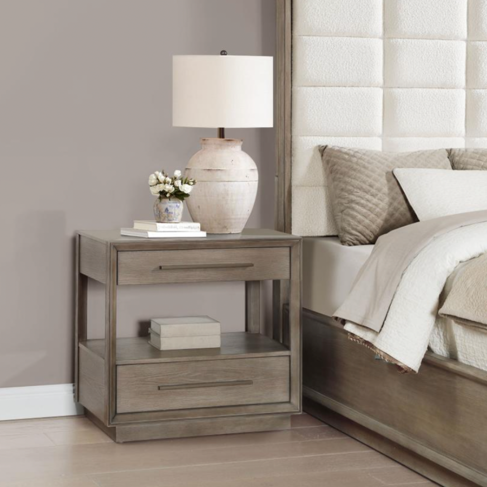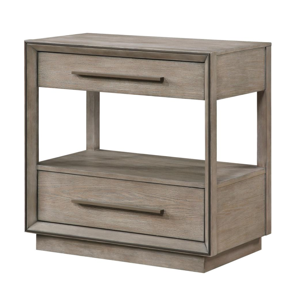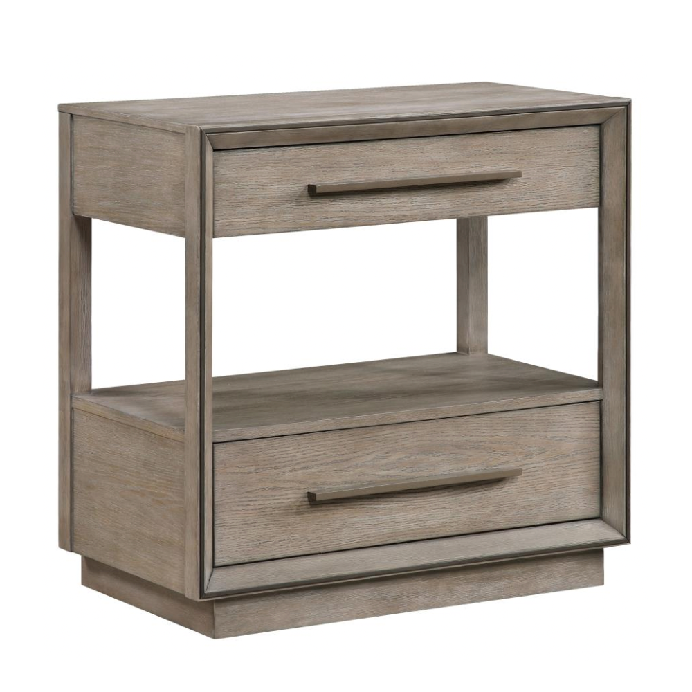 Elevate your bedroom with the understated elegance of this modern two-drawer nightstand. A warm taupe oak finish sets a soothing tone, enhanced by the natural wood grain for a grounded, organic feel. Designed with both style and function in mind, the nightstand offers two spacious drawers for bedside essentials and an open shelf ideal for displaying your favorite reads or a cozy candle. Mitered trim on the drawer case adds subtle dimension, while extra-long bar pulls introduce architectural structure. A recessed pedestal base completes the look with a modern touch, and a built-in tip-over restraint ensures added safety.