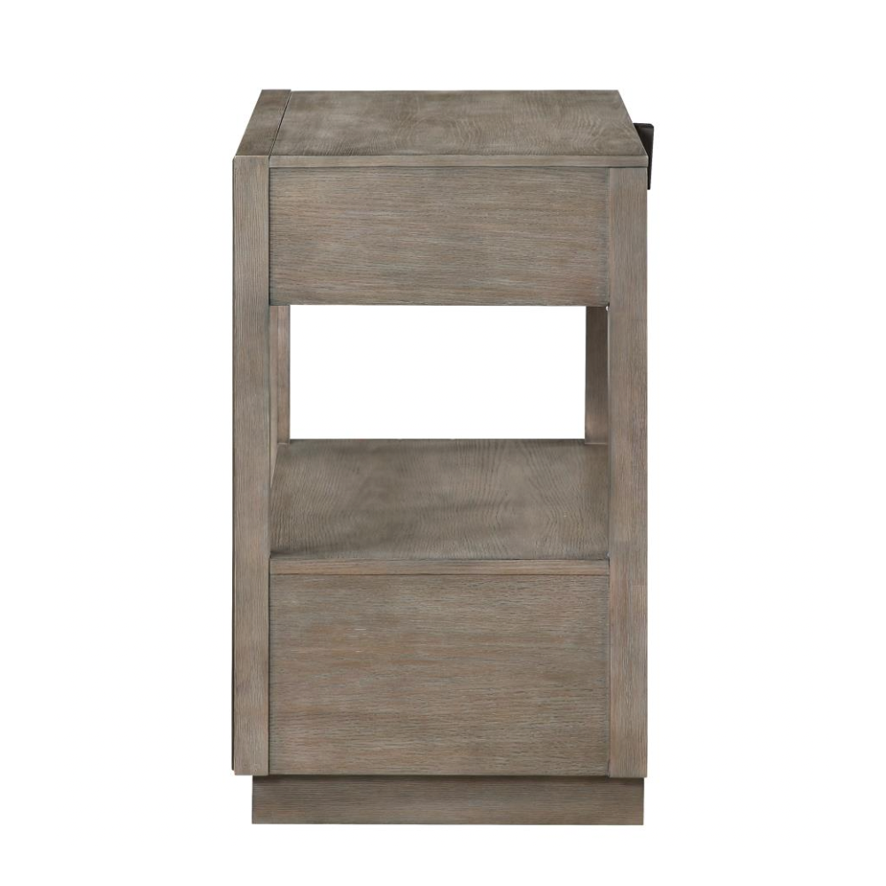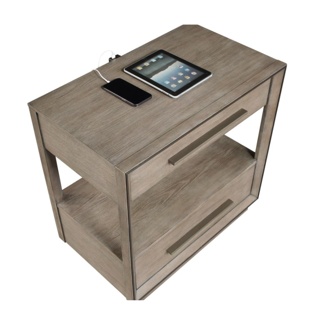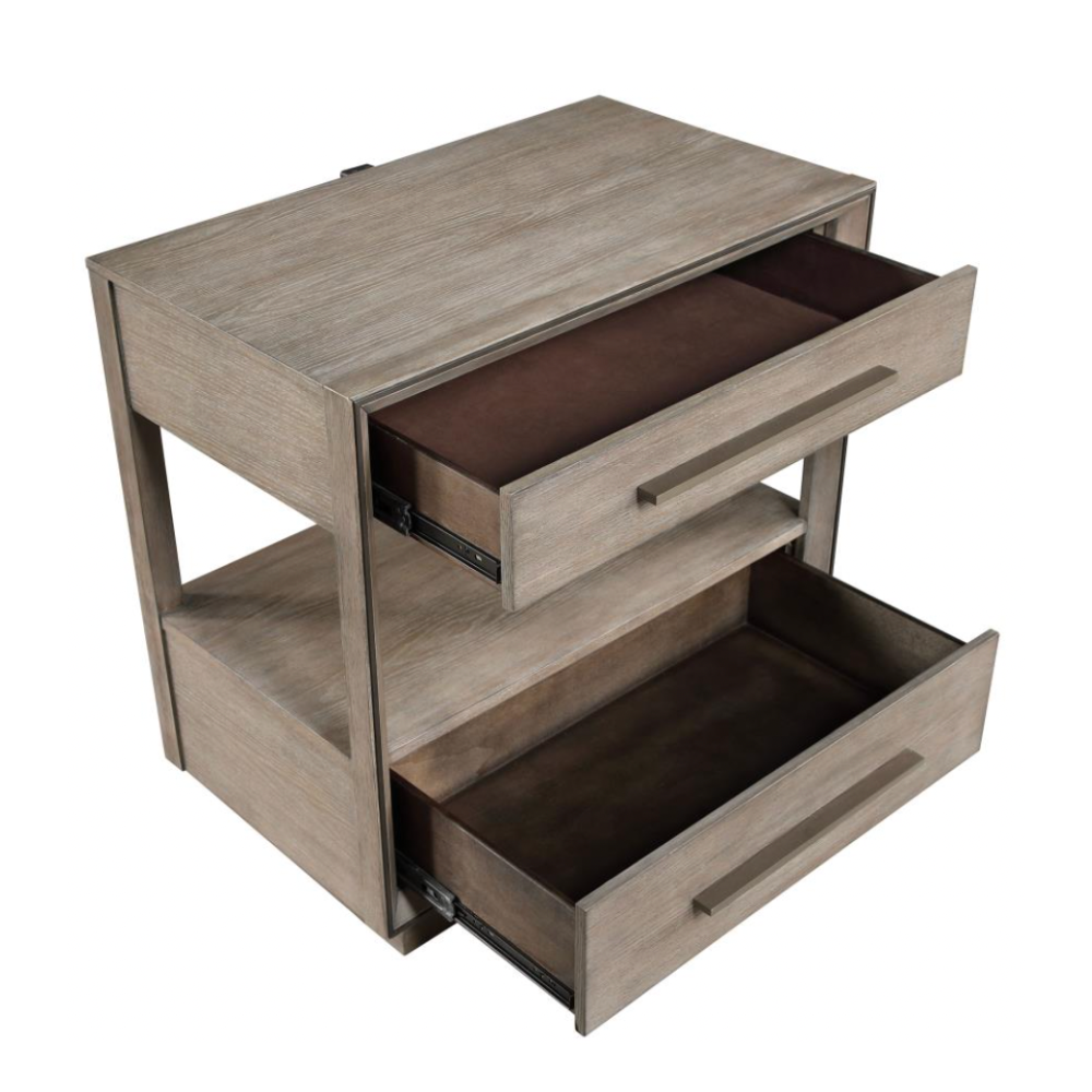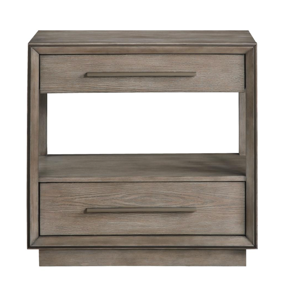 Elevate your bedroom with the understated elegance of this modern two-drawer nightstand. A warm taupe oak finish sets a soothing tone, enhanced by the natural wood grain for a grounded, organic feel. Designed with both style and function in mind, the nightstand offers two spacious drawers for bedside essentials and an open shelf ideal for displaying your favorite reads or a cozy candle. Mitered trim on the drawer case adds subtle dimension, while extra-long bar pulls introduce architectural structure. A recessed pedestal base completes the look with a modern touch, and a built-in tip-over restraint ensures added safety.