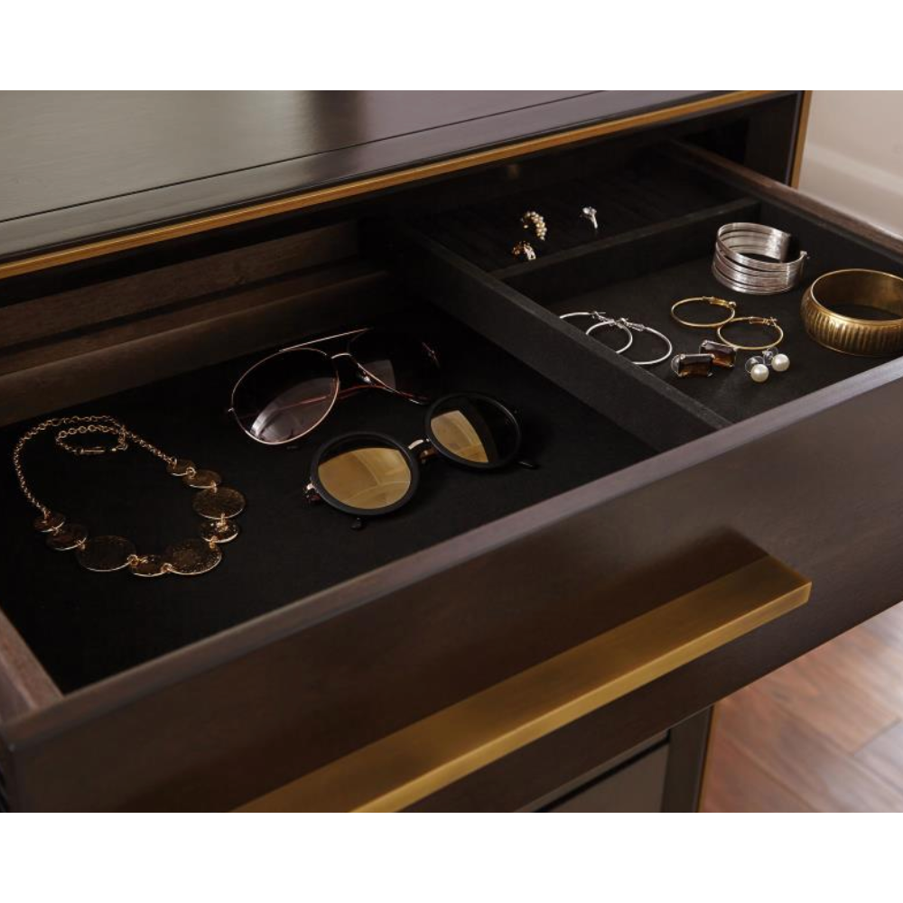 - Sleek Metallic Pulls: Features elongated metallic drawer pulls for a sleek look.