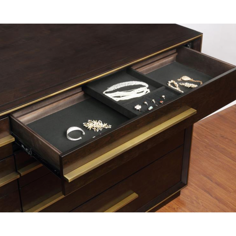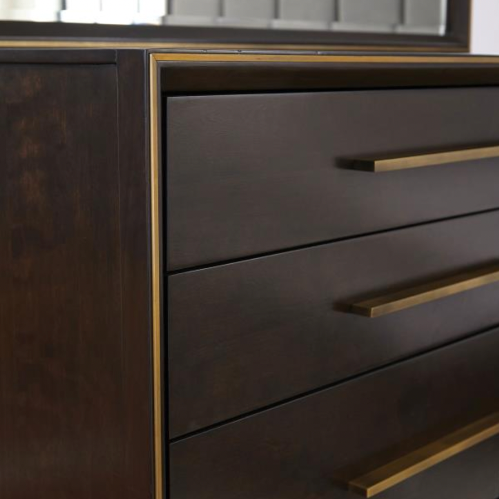 Embrace a retro feel in a modern bedroom with this stunning nine-drawer dresser. Elongated metallic drawer pulls protrude from flat drawer fronts, inspiring a sleek look. In a rich and warm smoke peppercorn finish, the deep hues and interesting silhouette create a bold visual. Its simple and smooth profile creates a structured aesthetic, complete with a smooth base that reaches toward the floor. Enhance with a chic perfume collection or a delightful sculptural piece.