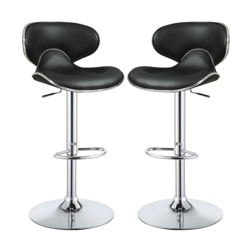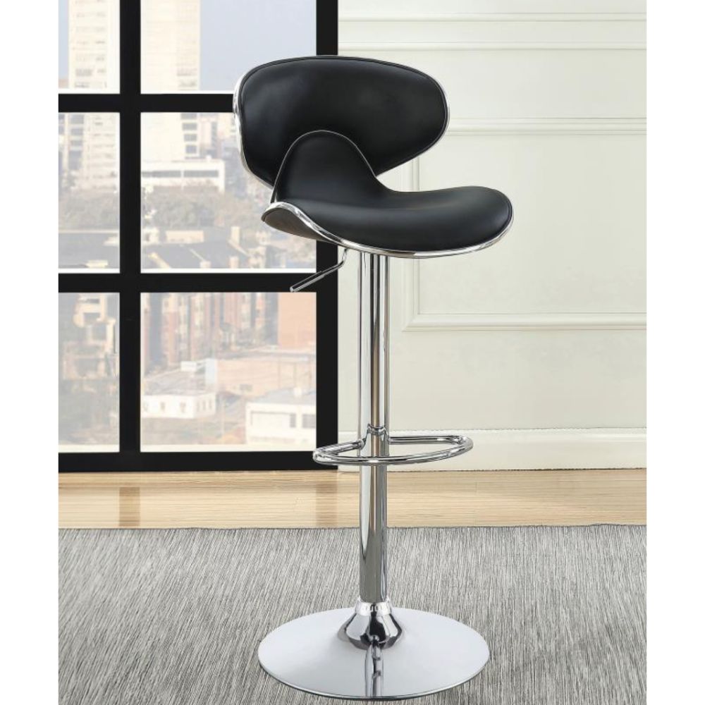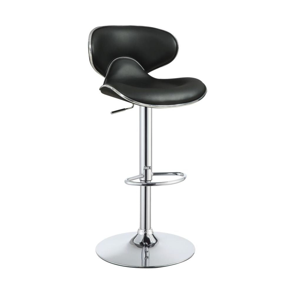 Graceful curves perfectly accentuate the contemporary profile of this adjustable barstool. Boasting a height adjustable seat, the stool swivels for easy conversation. A chic silhouette features a curved back and seat that cradle the body in comfort. Black upholstery perfectly contrasts a chrome finish pedestal base. A rounded foot and footrest provide a lovely finishing touch to a modern design.