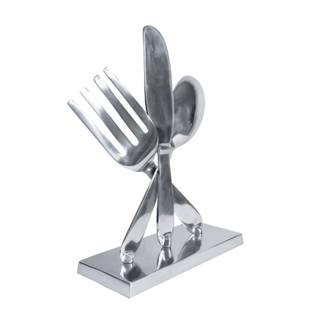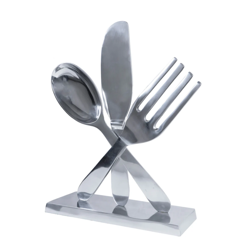 Elevate your kitchen or dining room decor with this charming aluminum utensil sculpture set. Comprised of a standing fork, spoon, and knife, each piece is meticulously crafted from lustrous silver aluminum and polished to a gleaming finish. This sculpture offers a playful yet refined accent, perfect for adding a stylish touch to any culinary-themed space.