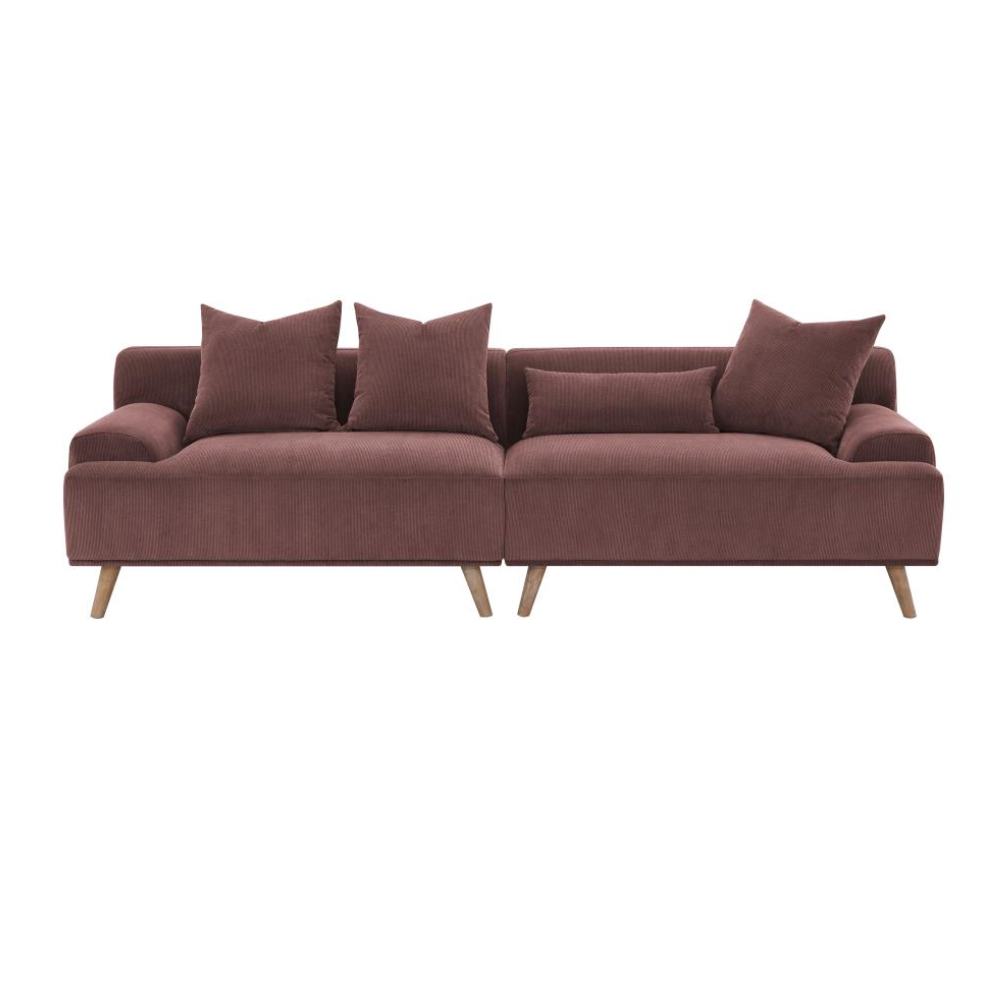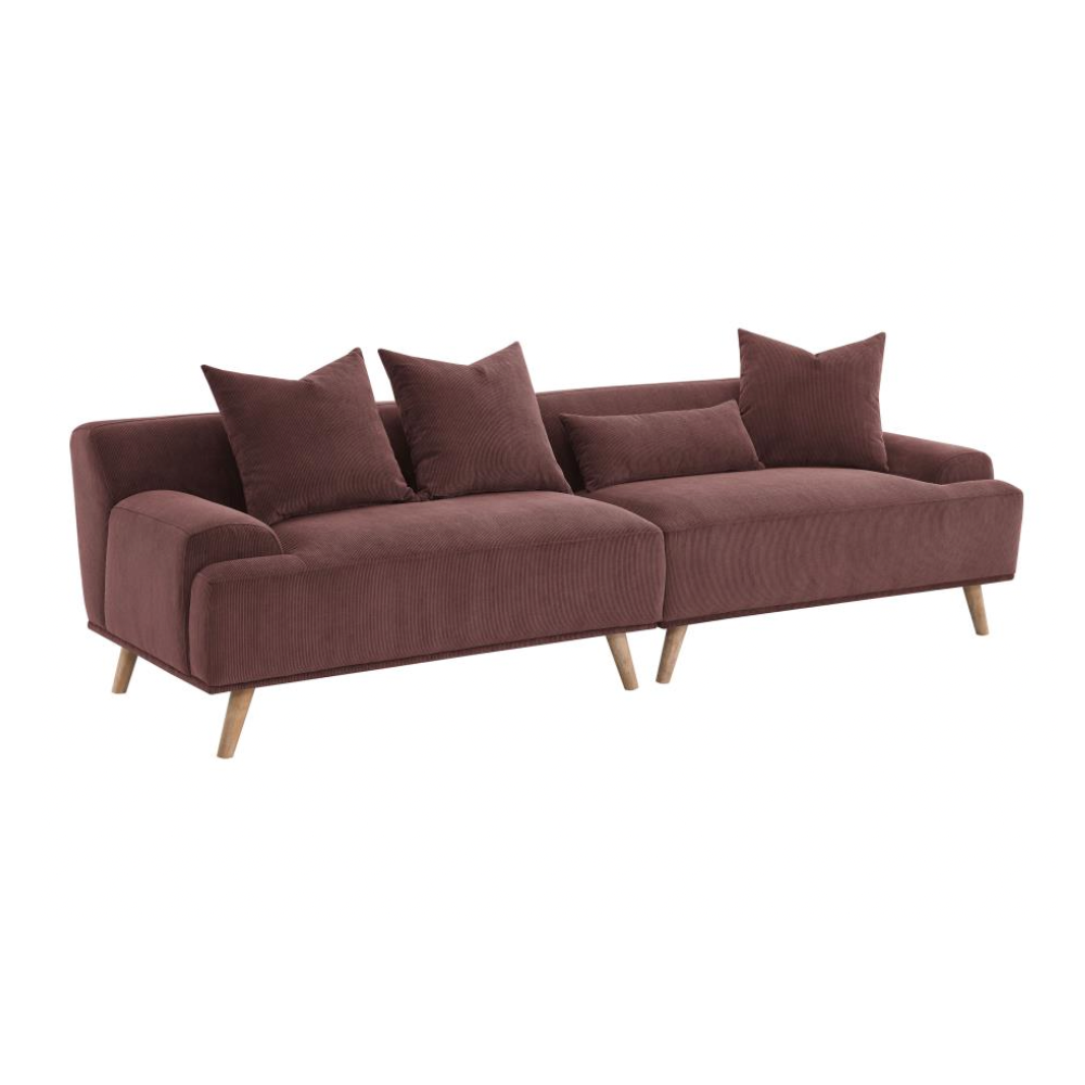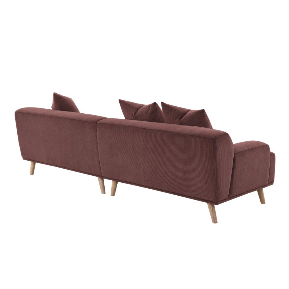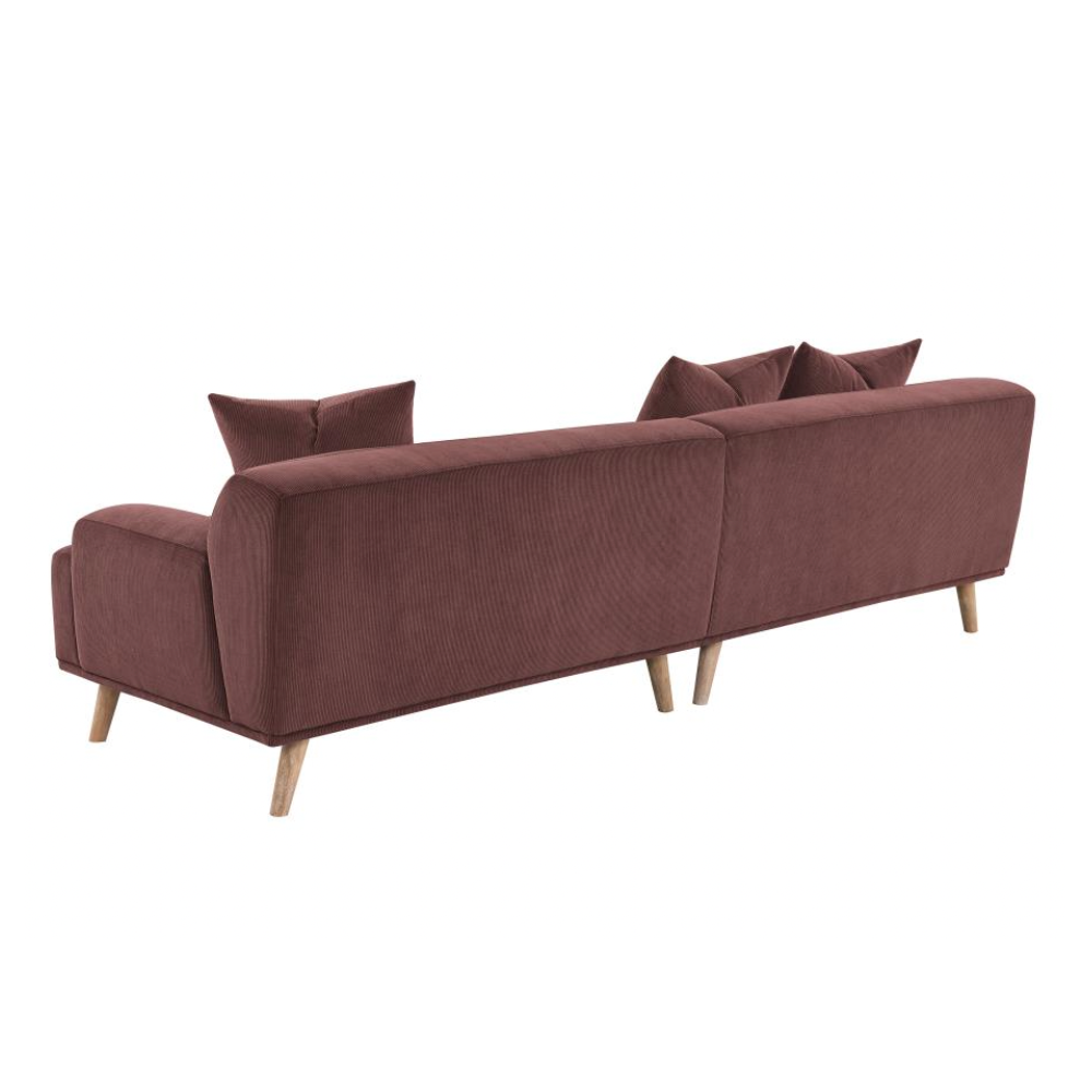 Transform your living room into a cozy and stylish retreat with this mid-century modern extra-long sectional sofa. Upholstered in a luxurious wine red thin pinstripe corduroy, this sofa combines timeless design with plush comfort. Wide, curved arms and foam cushions invite relaxation, while the spacious low-profile frame provides ample room for lounging or hosting. Matching accent pillows with premium down-like fill ensure lasting support and a coordinated look. Solid tapered wood feet in a natural beige finish splay outward, adding vintage charm and an airy touch to your modern space.