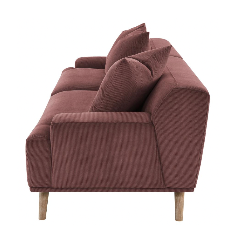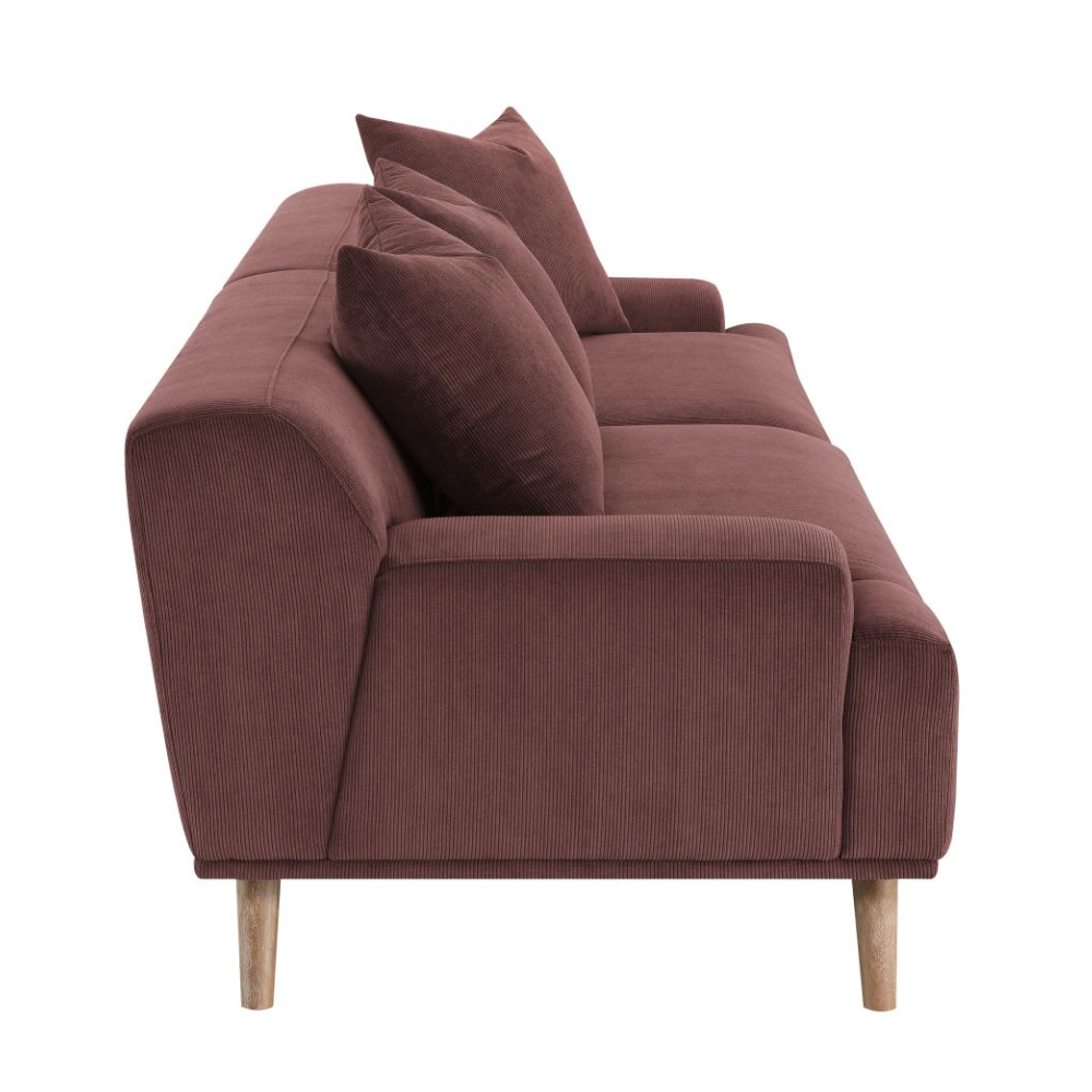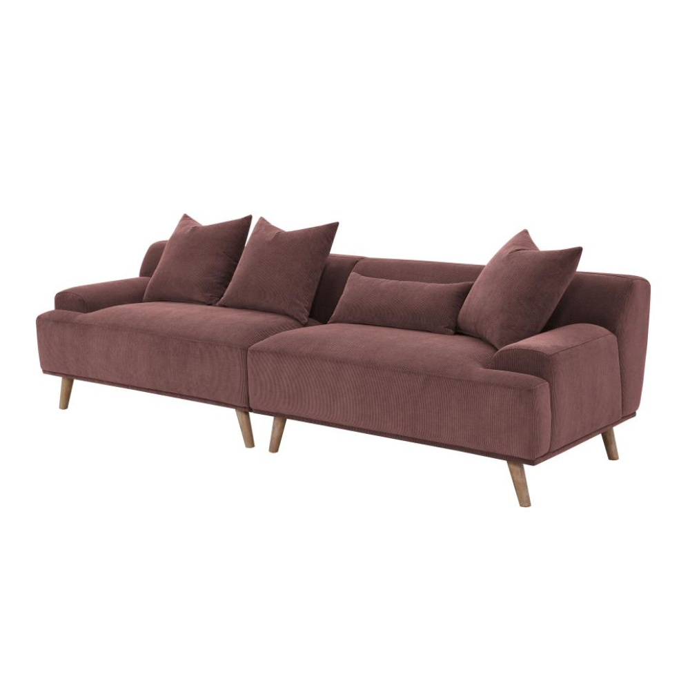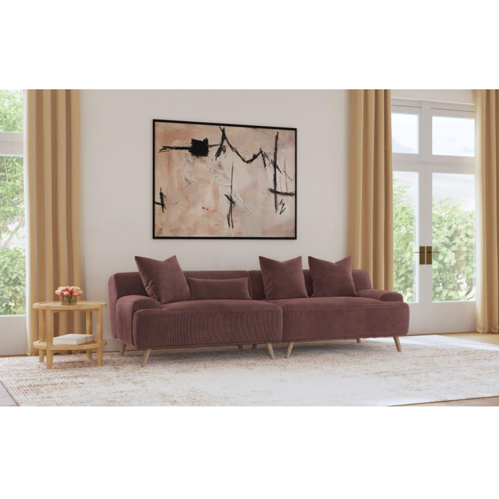 Transform your living room into a cozy and stylish retreat with this mid-century modern extra-long sectional sofa. Upholstered in a luxurious wine red thin pinstripe corduroy, this sofa combines timeless design with plush comfort. Wide, curved arms and foam cushions invite relaxation, while the spacious low-profile frame provides ample room for lounging or hosting. Matching accent pillows with premium down-like fill ensure lasting support and a coordinated look. Solid tapered wood feet in a natural beige finish splay outward, adding vintage charm and an airy touch to your modern space.