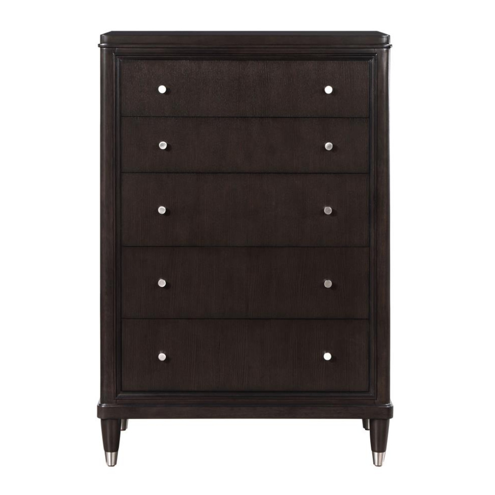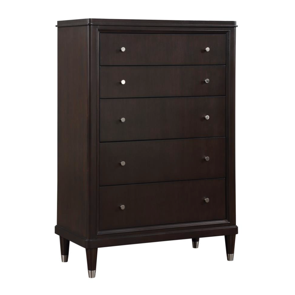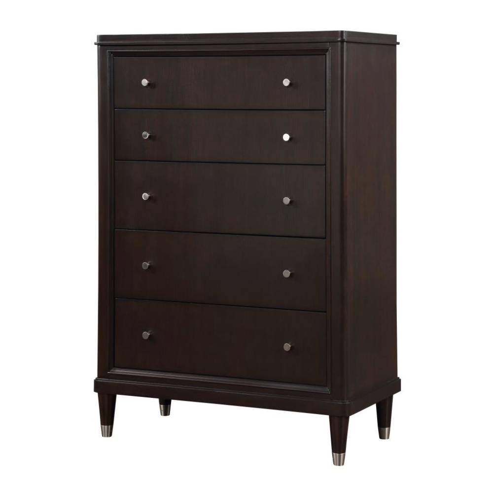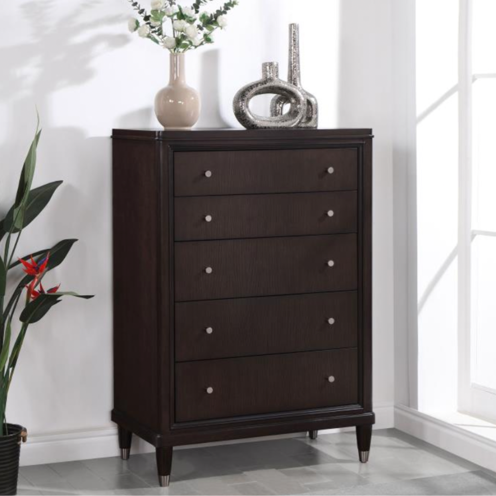Gleaming knobs and foot caps add contrast and character to a modern five-drawer chest. Its deep brown finish is sleek and refined, perfect for a stylish bedroom with a sophisticated presence. Its five drawers offer abundant storage. The top drawer includes felt lining and the bottom drawer is lined in cedar for additional protection for delicate items like jewelry and seasonal sweaters. The top of the chest is perfect for decor, offering a spot for a personal touch in your bedroom.
