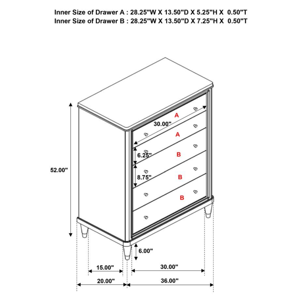 - A contemporary five-drawer chest offers stylish clothing and accessory storage and a refined look