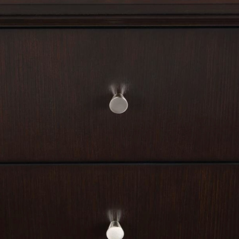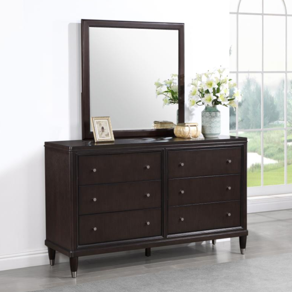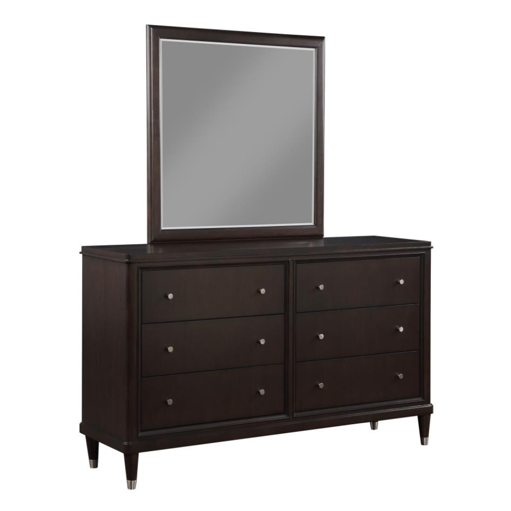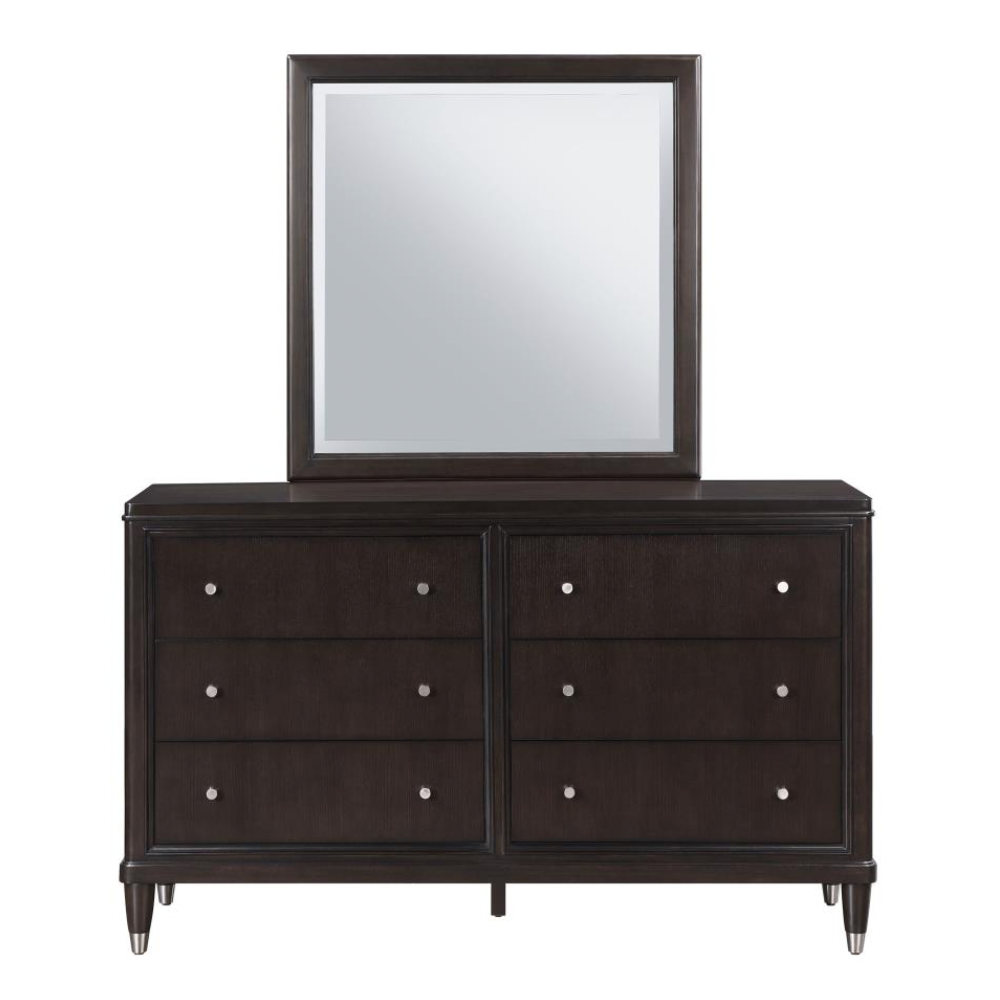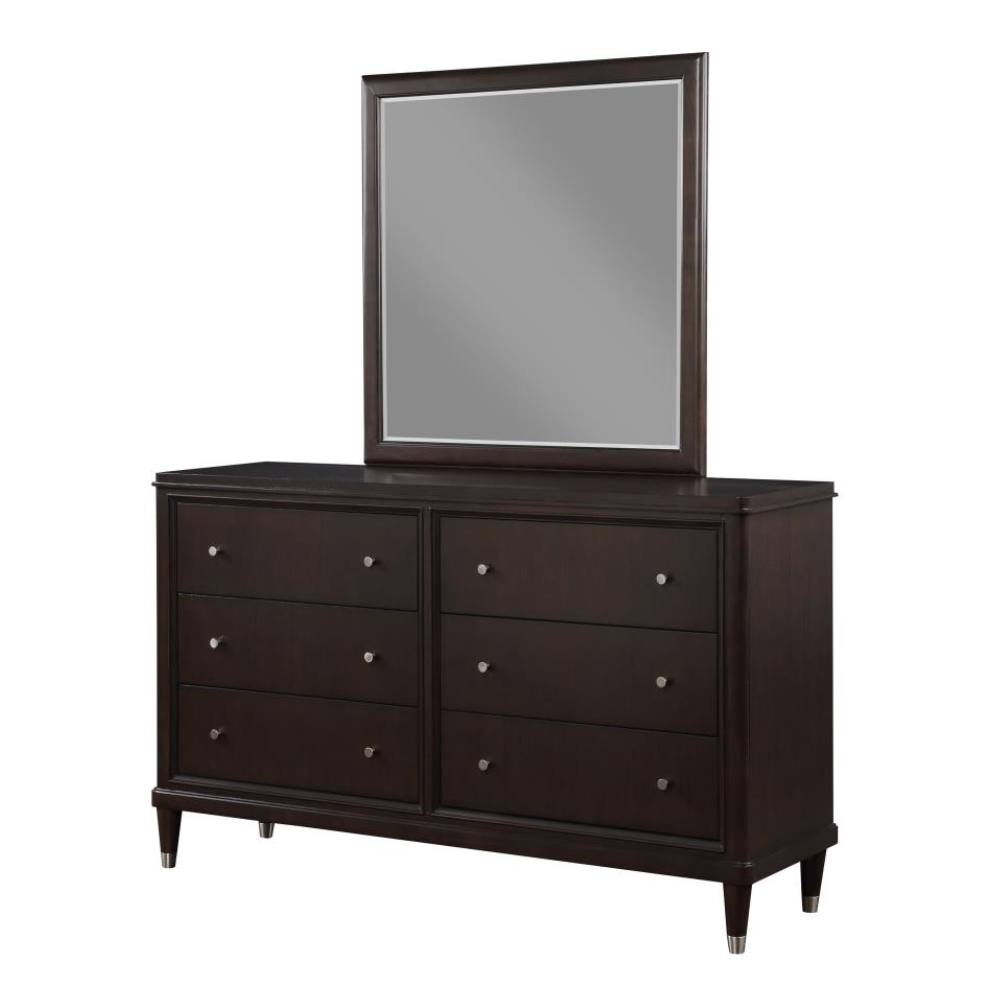 Bring stylish flair and plentiful storage to your bedroom with a modern six-drawer dresser and mirror. It showcases a dark brown wood finish, paired with silver-toned round knobs and ferrules on its legs that add gleaming contrast and depth. Six drawers provide ample storage and organization for clothing and accessories, with a red-brown velvet lined jewelry tray included that's ideal for protecting pieces you wear regularly. The mirror on top of the dresser creates a vanity like space, and is framed for a finished look and feel. This stylish dresser is the perfect addition to your existing bedroom ensemble.