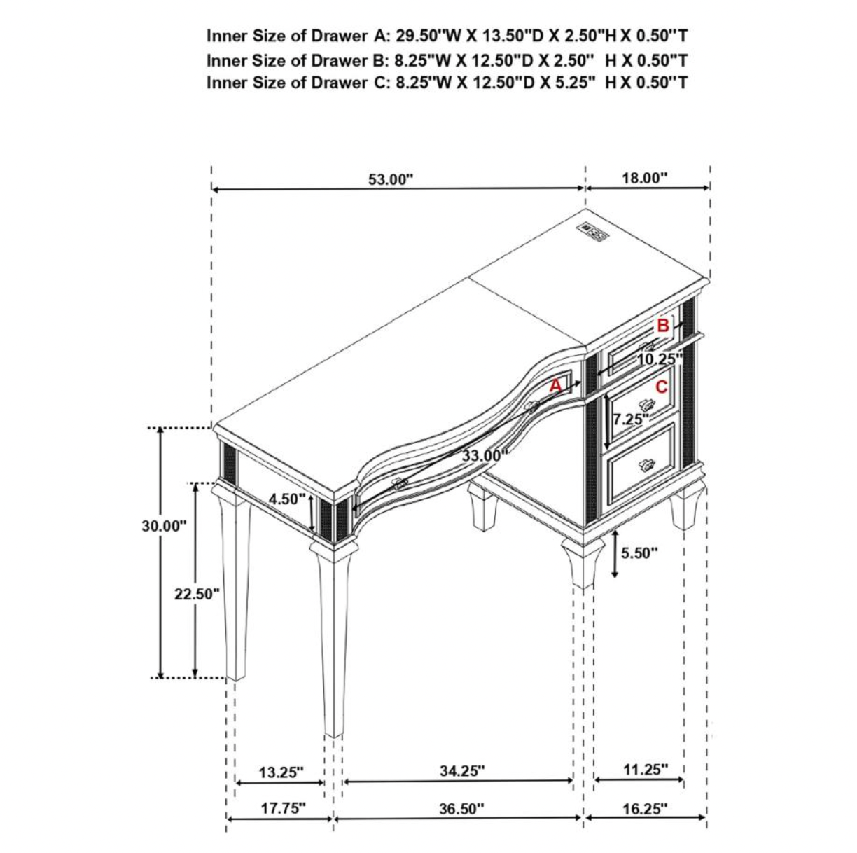 - Vanity Table Size: W53.25" x D19.00" x H30.25"