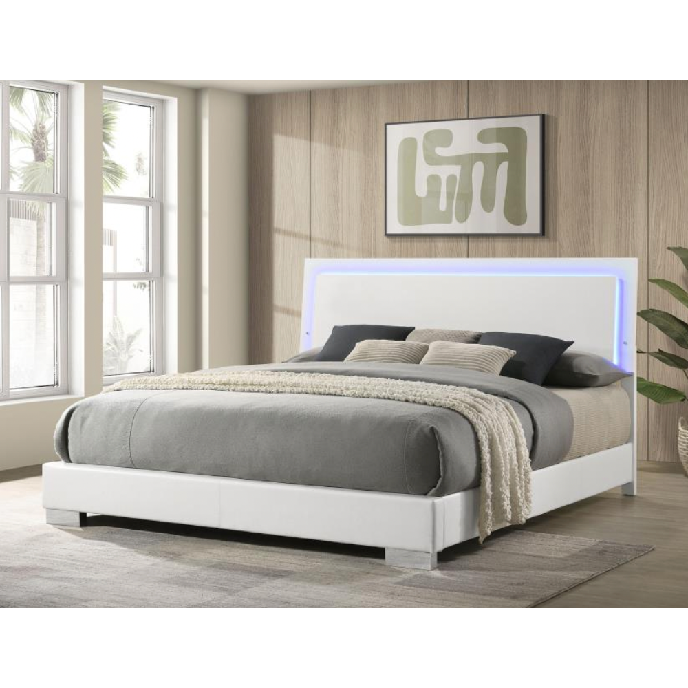Elevate your bedroom with this sleek and modern bedroom set, where high-gloss finishes meet ambient lighting for a striking contemporary aesthetic. The bed features an integrated blue LED-lit headboard, activated by a touch switch, while the faux leather-upholstered frame enhances the luxurious feel. With chrome-finished accents and smooth-gliding storage drawers, this set balances style and functionality, making it the perfect choice for a modern retreat.