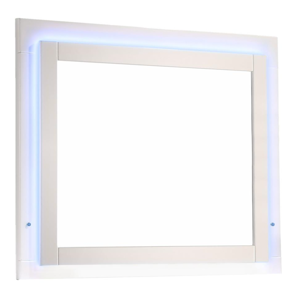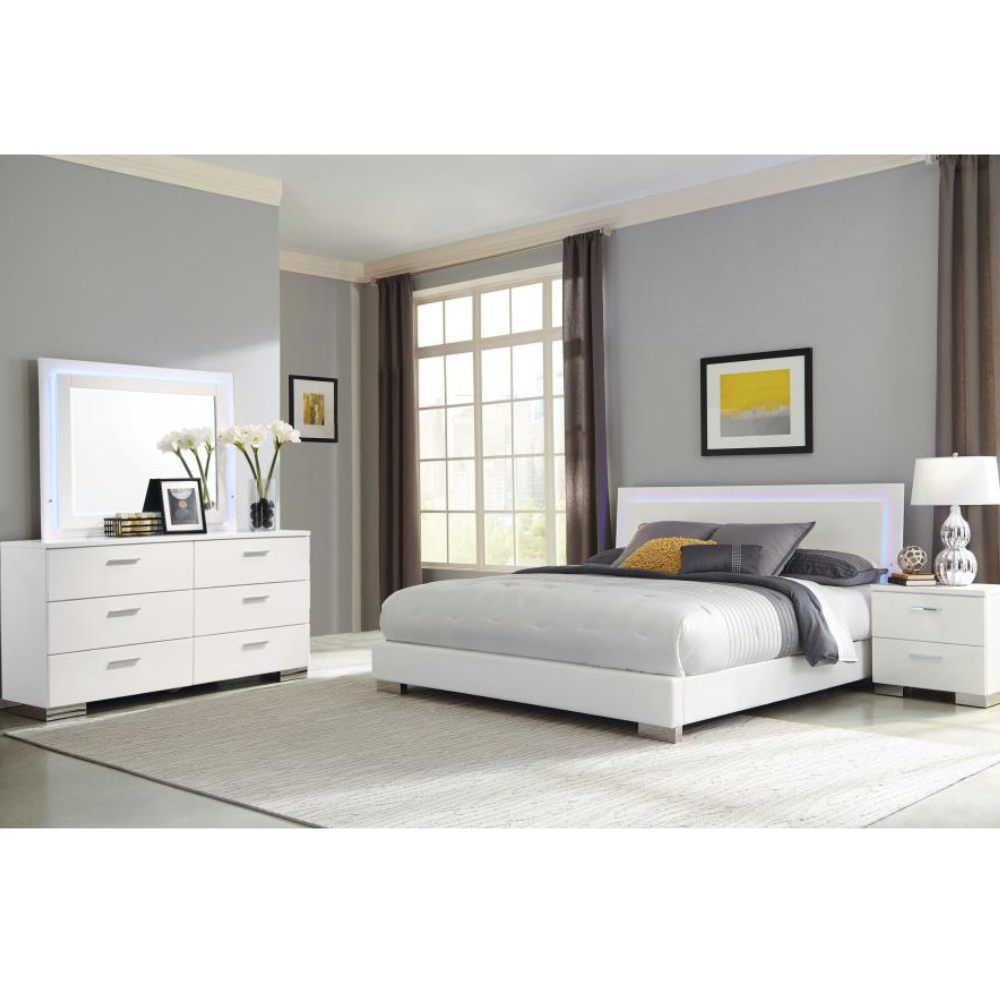 Sleek lines and integrated LED lighting define this modern bedroom set. The LED panel bed features a white high gloss headboard with touch-activated blue LED lighting and a faux leather-upholstered frame for a refined touch. The coordinating LED dresser mirror includes perimeter lighting with a touch sensor, blending functionality with contemporary design. Chrome hardware and smooth-gliding drawers complete the polished aesthetic.