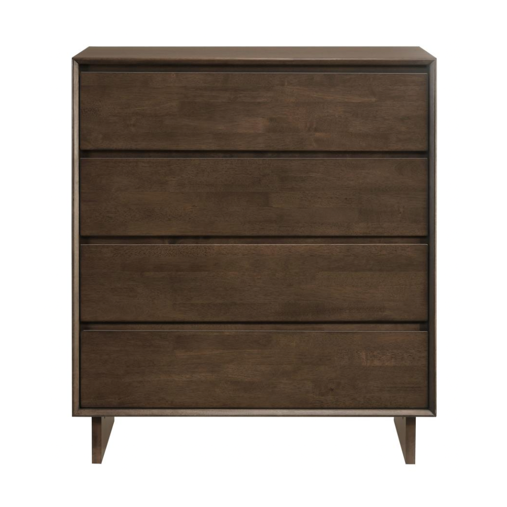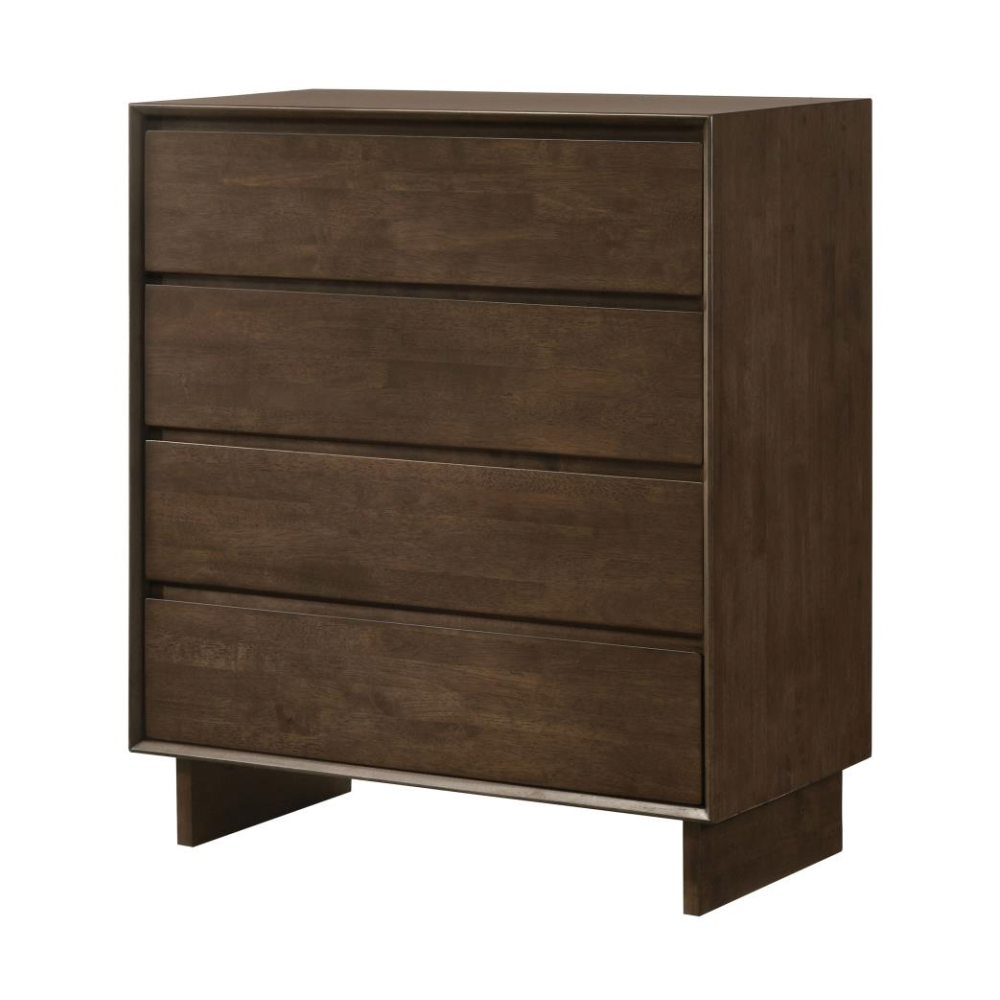 This modern four-drawer chest offers stylish storage with a compact design, perfect for any bedroom. A warm brown wood finish, mitered trim, and fingertip pulls create a sleek, contemporary look. The top drawer features a felt lining, adding protection for delicate items.