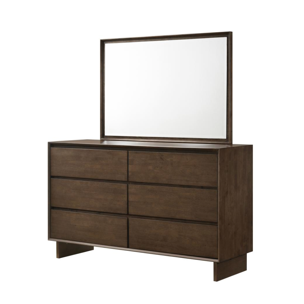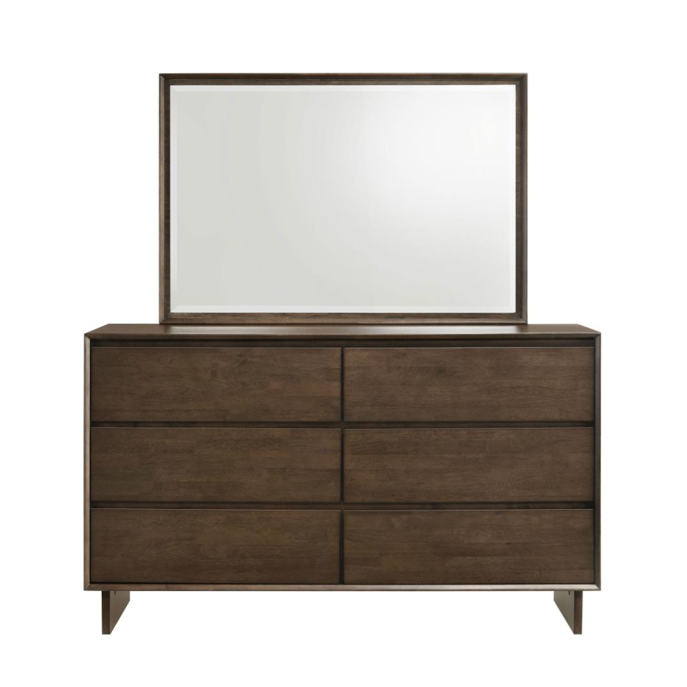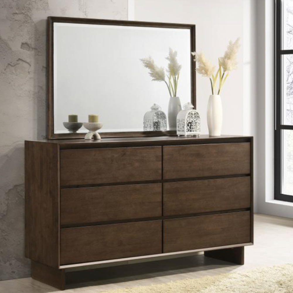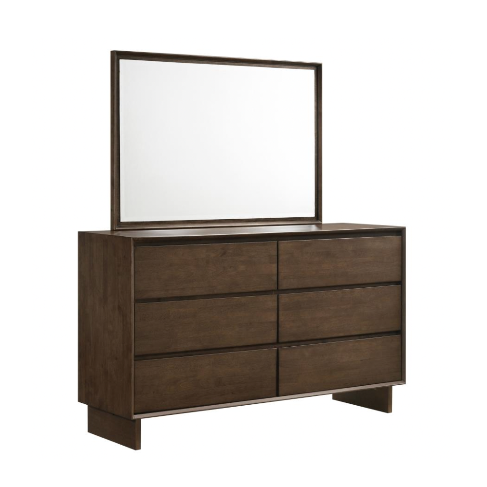 Complete your bedroom with this modern six-drawer dresser and framed mirror set, designed for both style and function. A warm brown wood grain finish highlights its clean lines, while felt-lined top drawers protect delicate items. Mitered trim and beveled glass on the mirror enhance the refined, contemporary look.