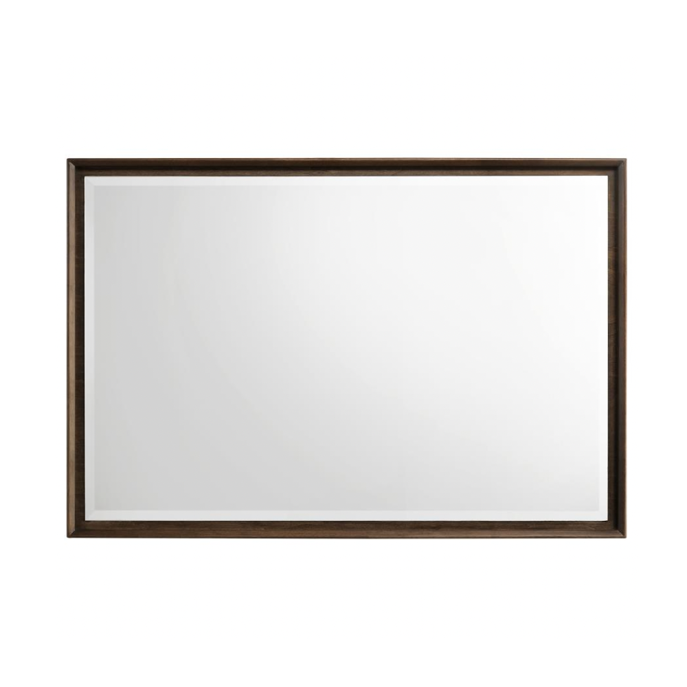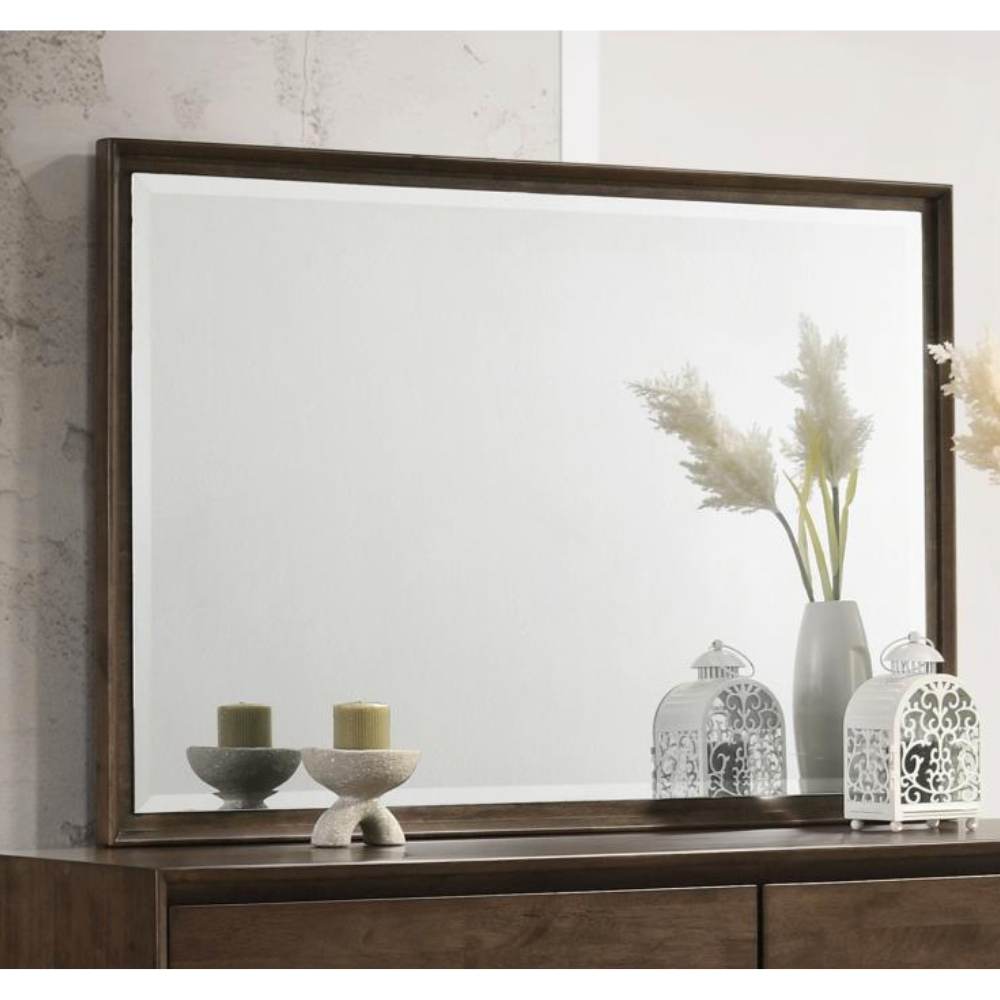 Enhance your dresser with this modern framed mirror, designed to add depth and reflectivity to your space. A warm brown wood finish and beveled glass create a sleek, sophisticated look. The slim mitered trim frame provides a refined touch, making it a perfect finishing piece for your bedroom.