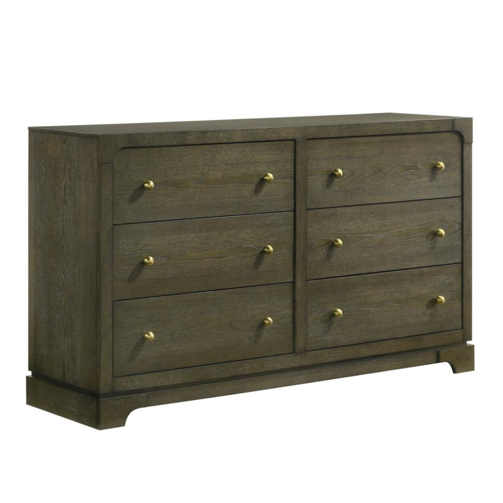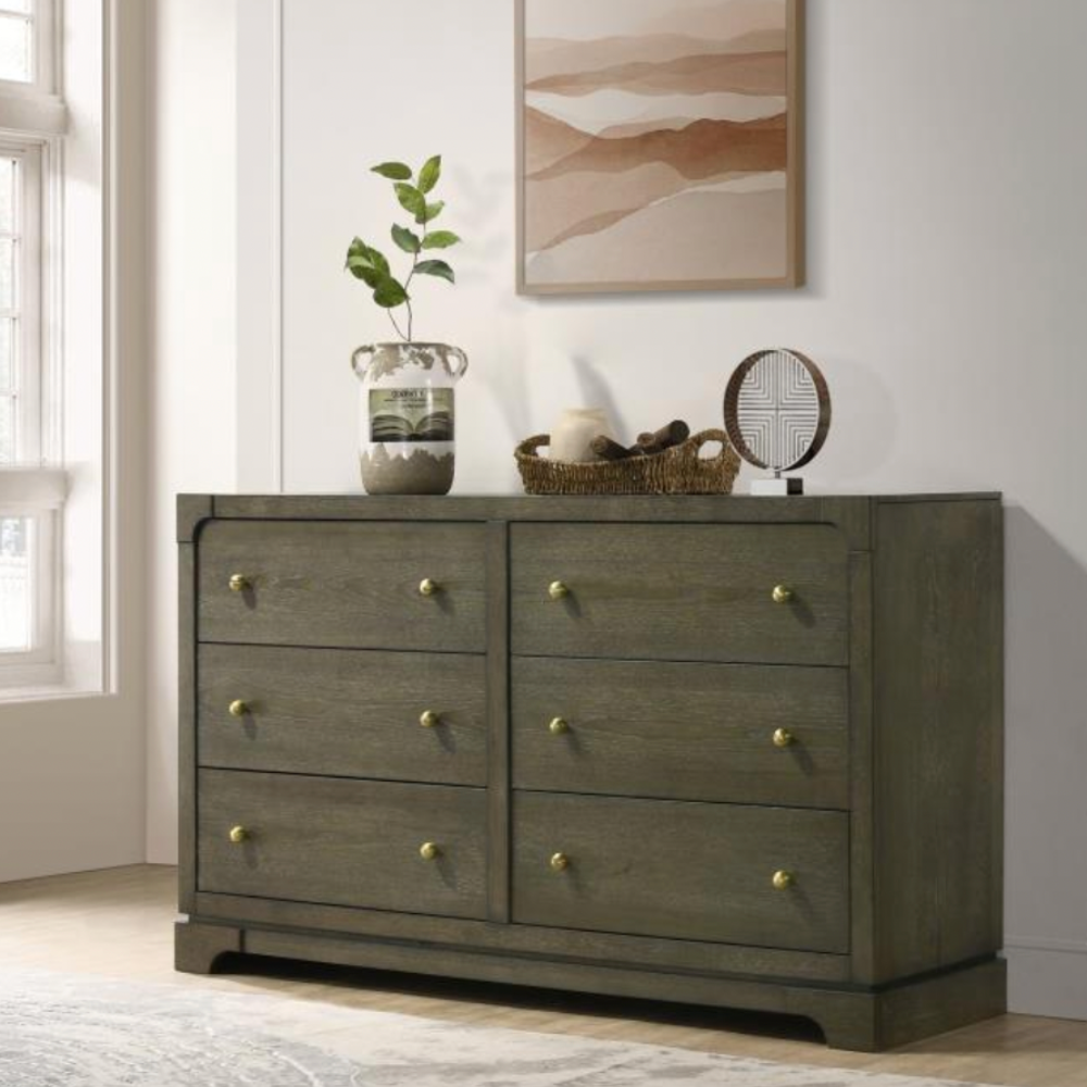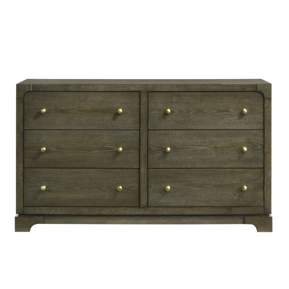 Add a touch of refined elegance to your bedroom with this spacious 6-drawer dresser, designed in a timeless transitional style. Rounded corners and trending design elements soften the silhouette, while the rich dark cocoa finish and brass knobs offer classic sophistication. Crafted with solid hardwood, ash veneer, and MDF, this dresser promises lasting durability. Solid wood drawer boxes with English dovetail joinery and 45mm metal ball-bearing glides ensure smooth, long-term functionality. Felt-lined top drawers add a luxurious touch, perfect for delicate items and upscale organization.