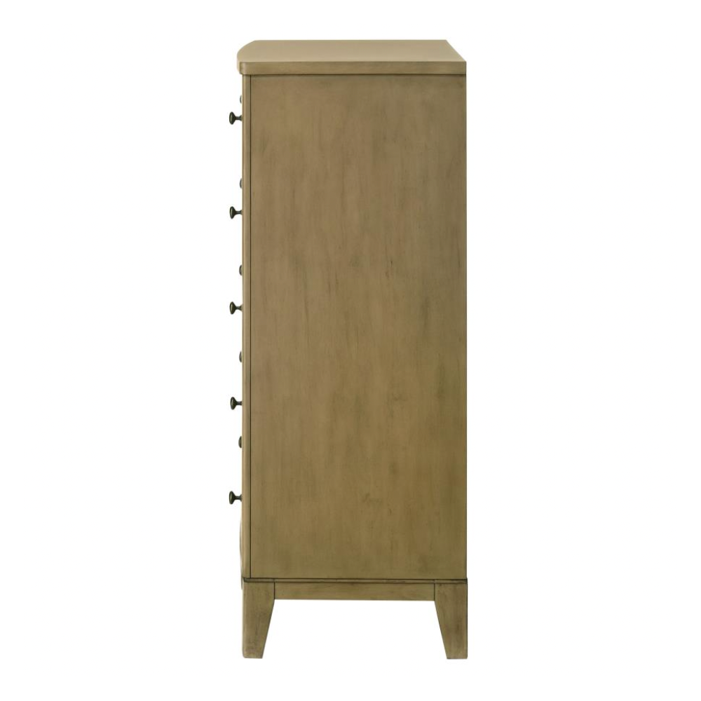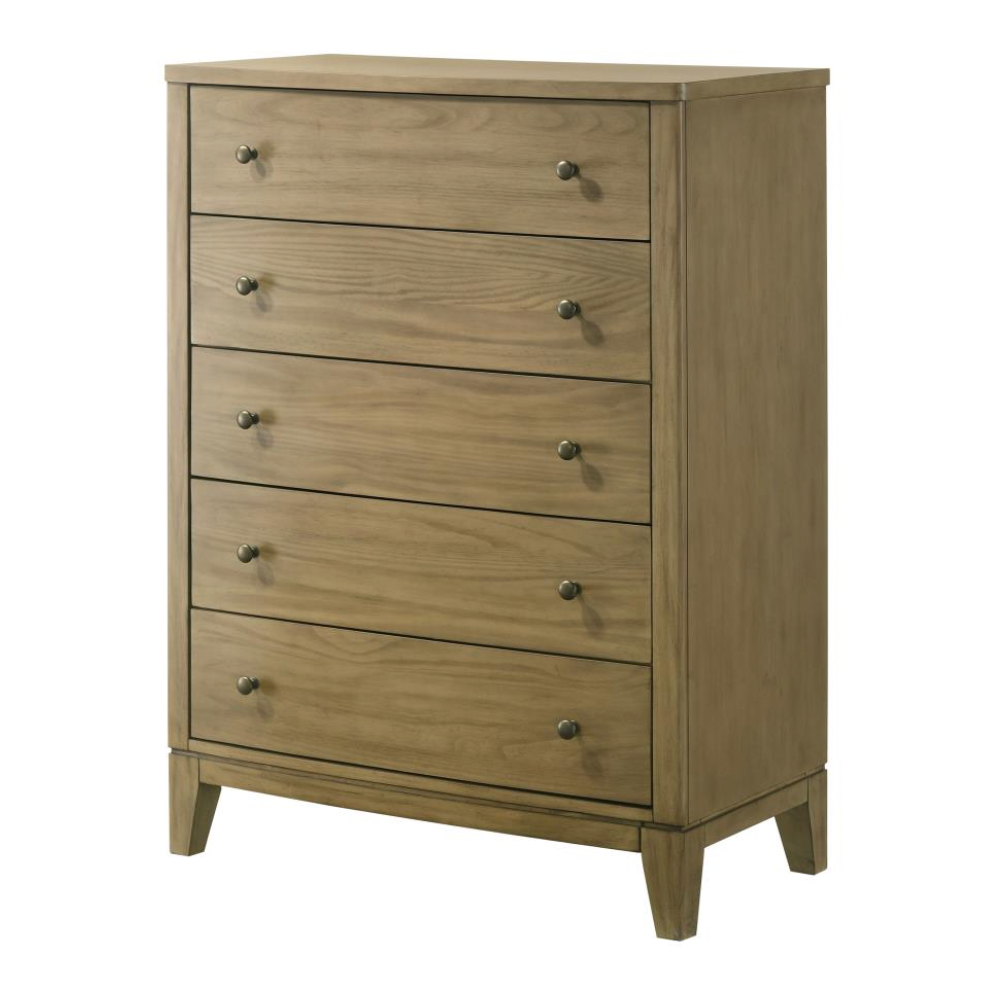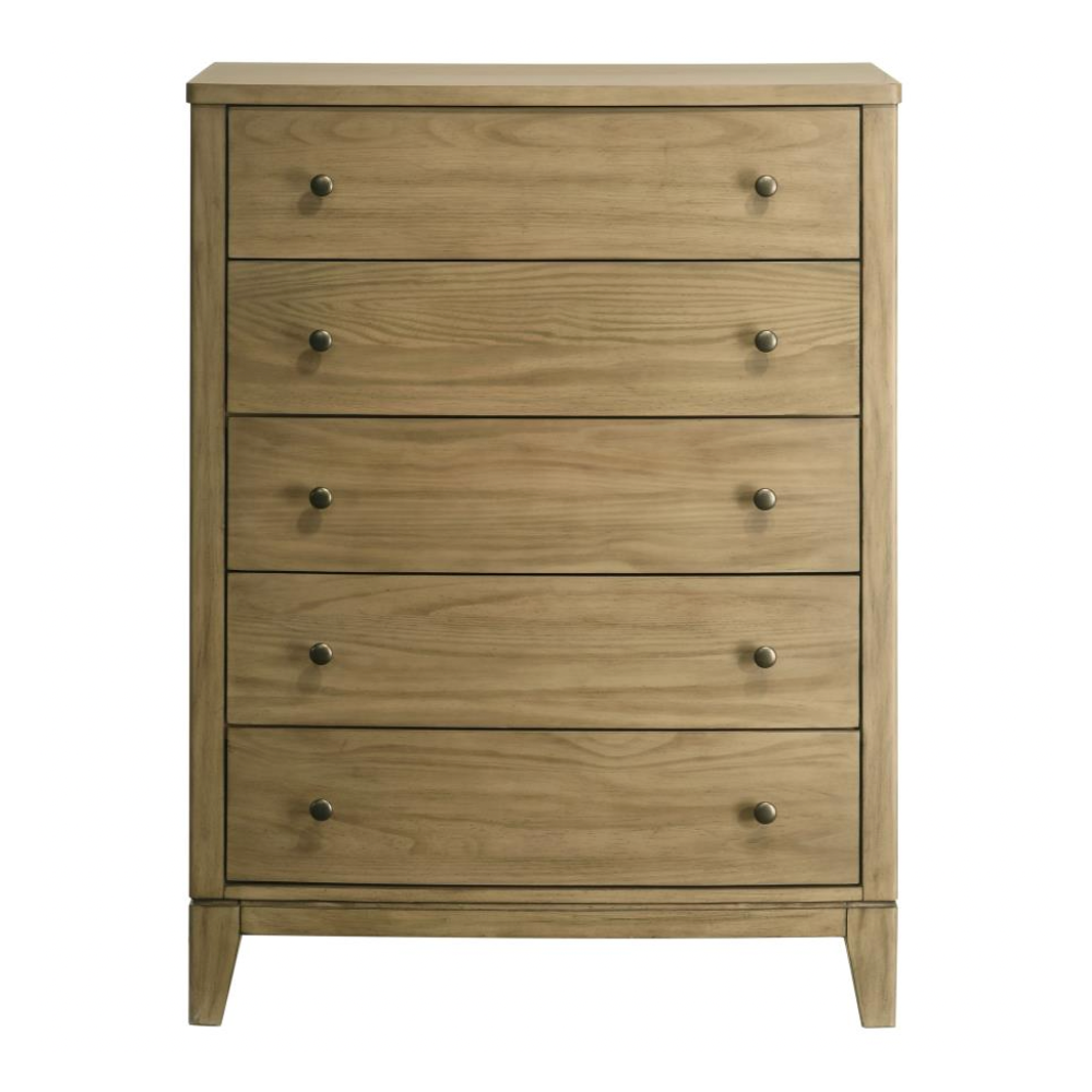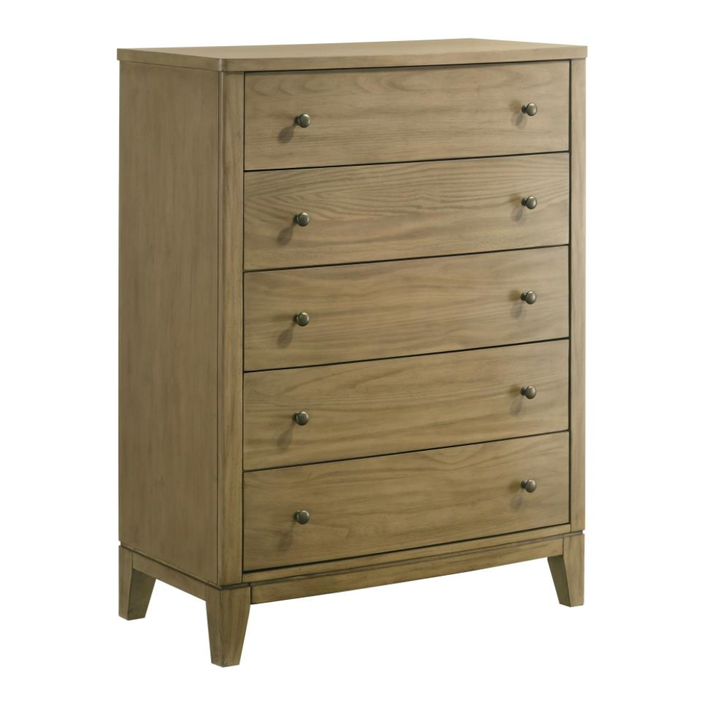 Maximize bedroom storage with this elegant 5-drawer chest, crafted in a natural pine finish that showcases its solid wood construction. Softly curved fronts, square tapered legs, and antique nickel hardware bring timeless charm to its functional design. Smooth-gliding drawers with felt-lined tops offer both convenience and a touch of luxury.