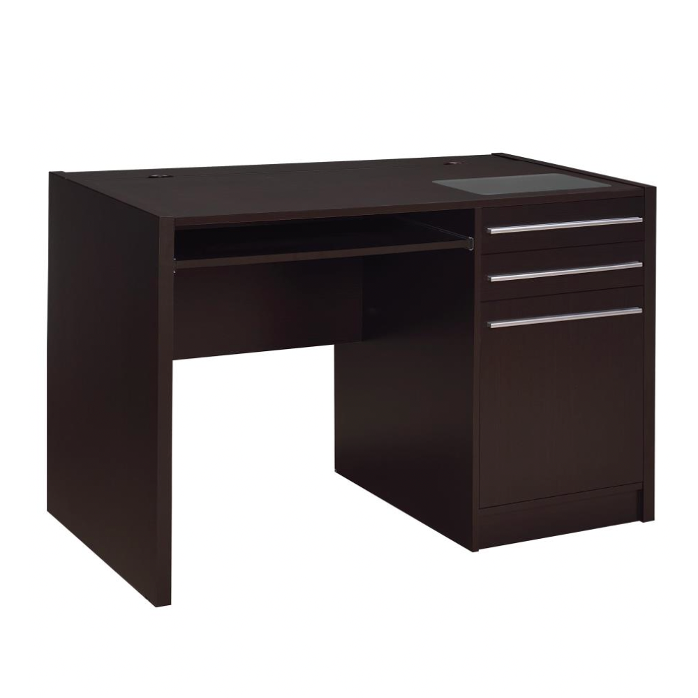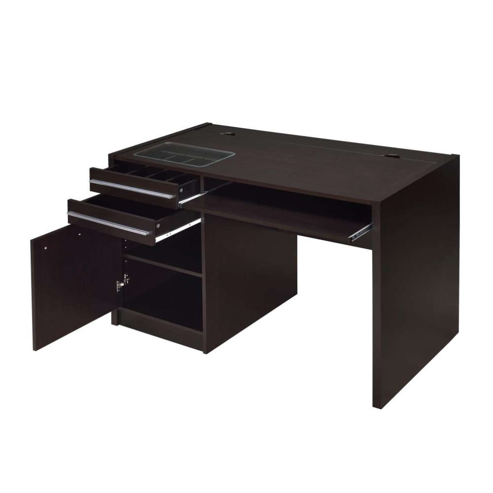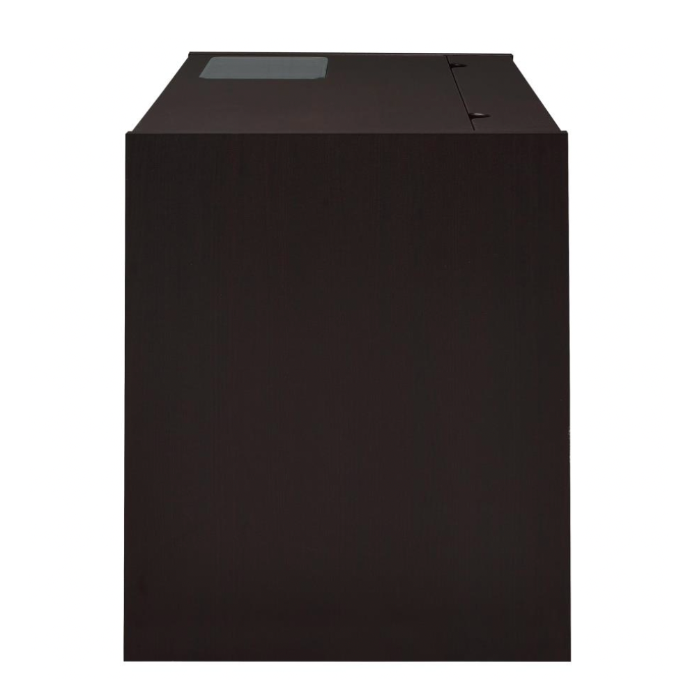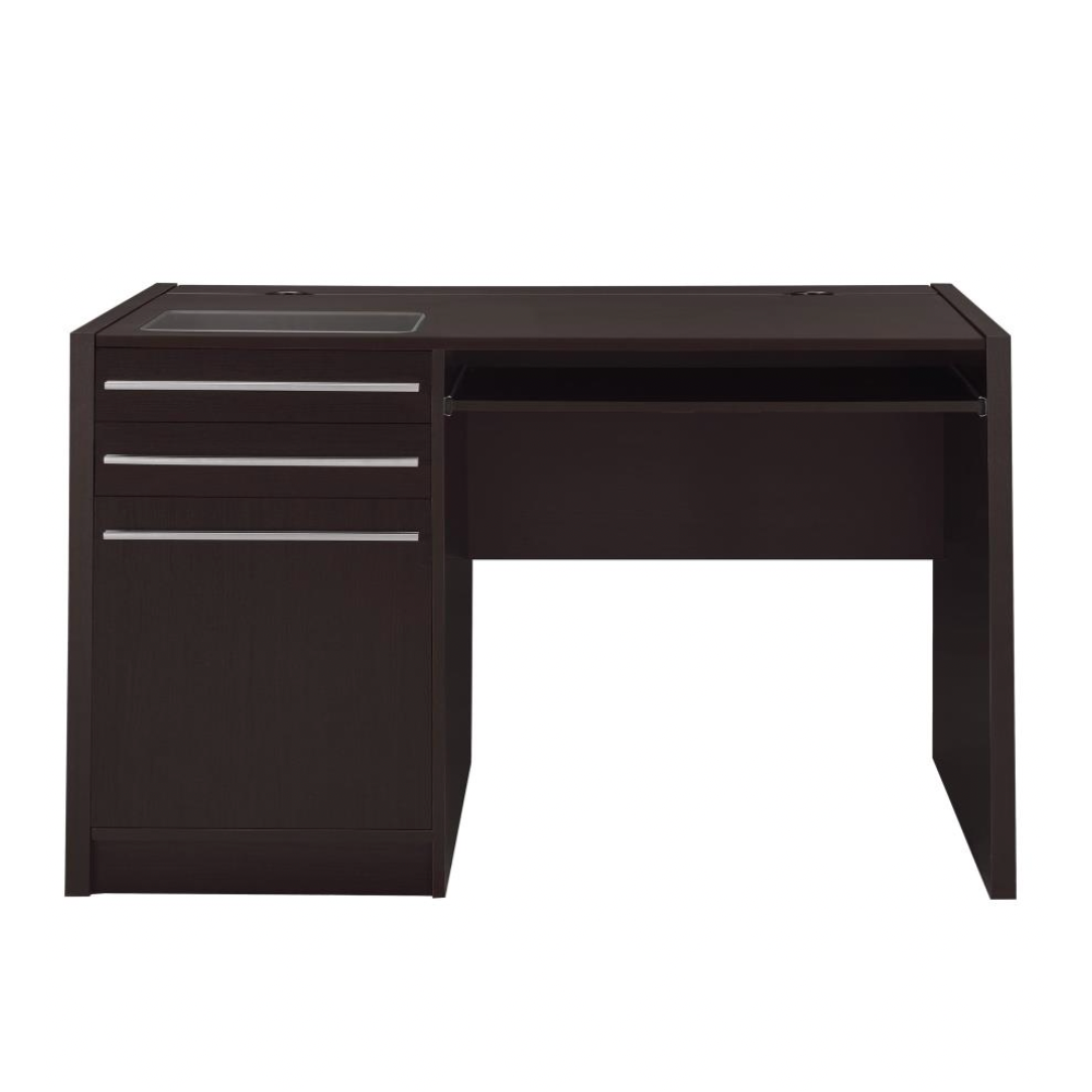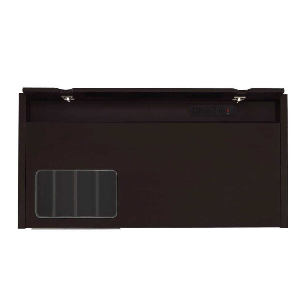 A smartly designed computer desk that keeps up with modern tech needs while offering sleek style. Finished in deep cappuccino, it features ample storage, a clear tempered glass insert for device visibility, and a lift-top compartment with a built-in power outlet. Perfect for maintaining a streamlined, organized workspace.