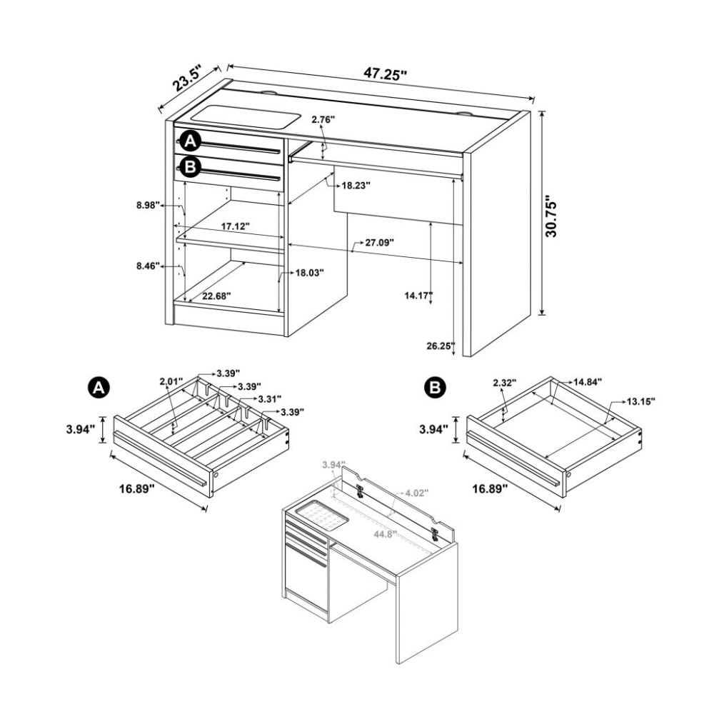 - Smart Storage: Lift-top cord management, keyboard tray, two drawers, and cabinet with adjustable shelf