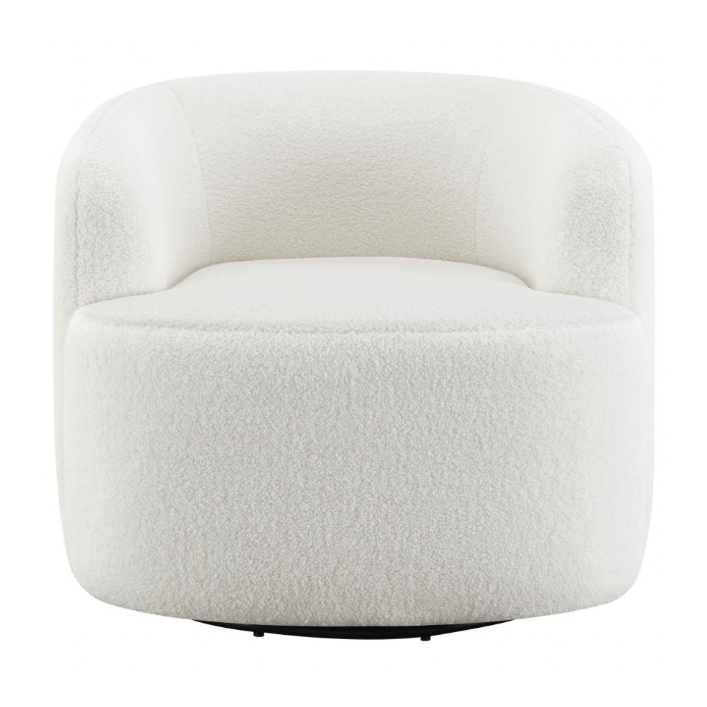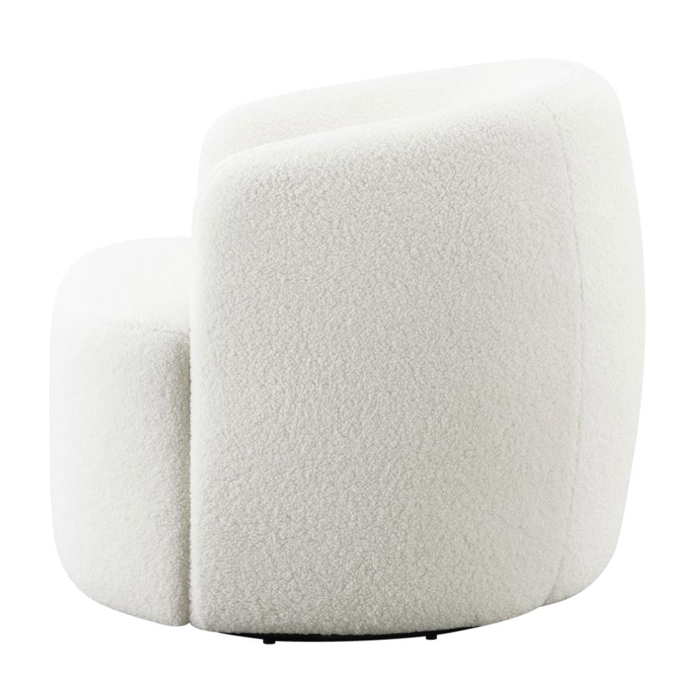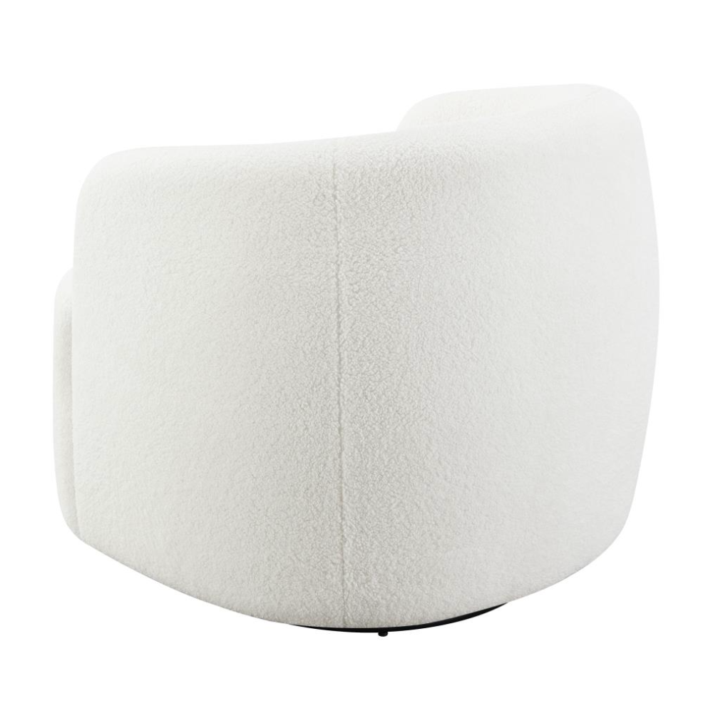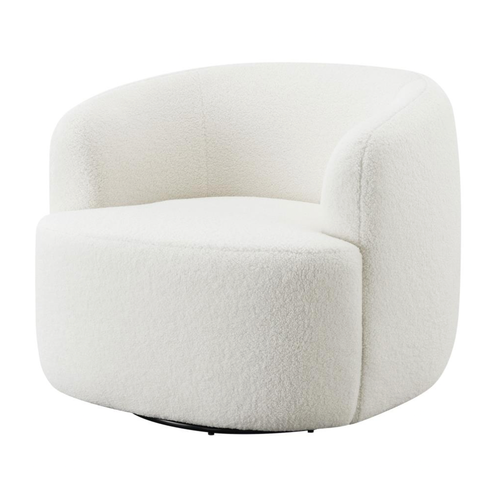Wrapped entirely in plush faux sheepskin, this swivel chair combines comfort and style. Featuring a 360-degree swivel base, it’s perfect for open floor plans and flexible spaces. Its vintage-inspired barrel design offers a supportive, tight seat and a rounded low-profile backrest that gracefully tapers into the arms. The flush base discreetly hides the swivel mechanism, adding a sleek, modern touch to the light-hued upholstery that blends effortlessly into any décor.