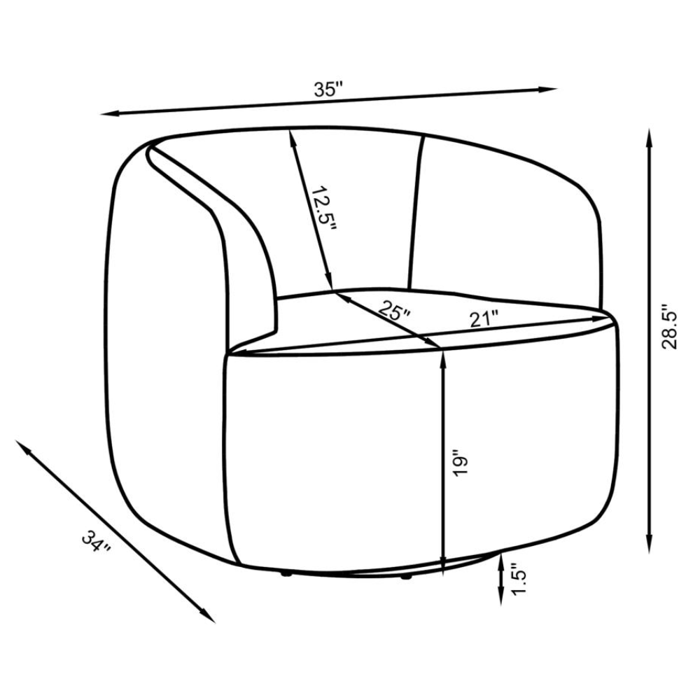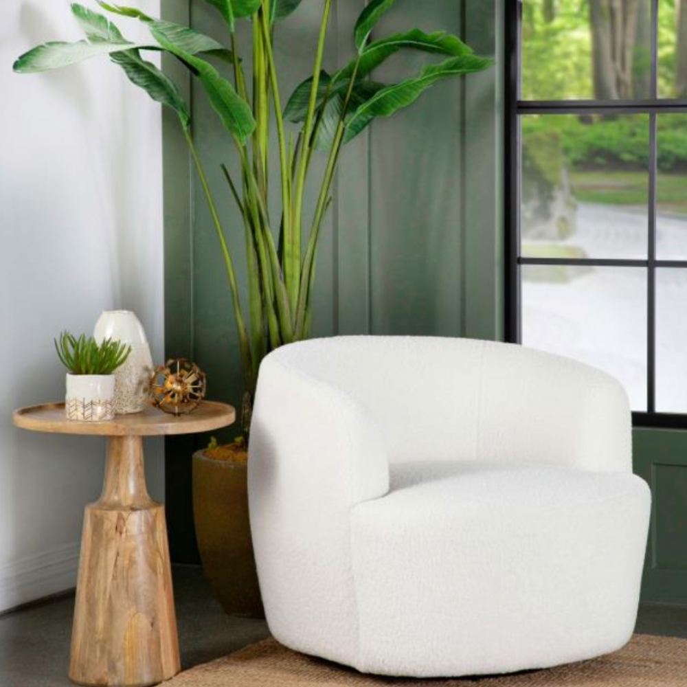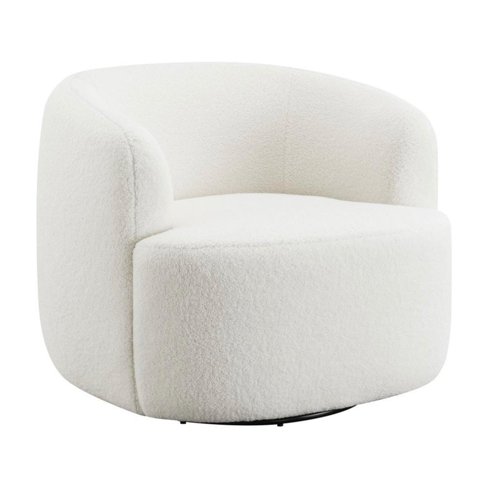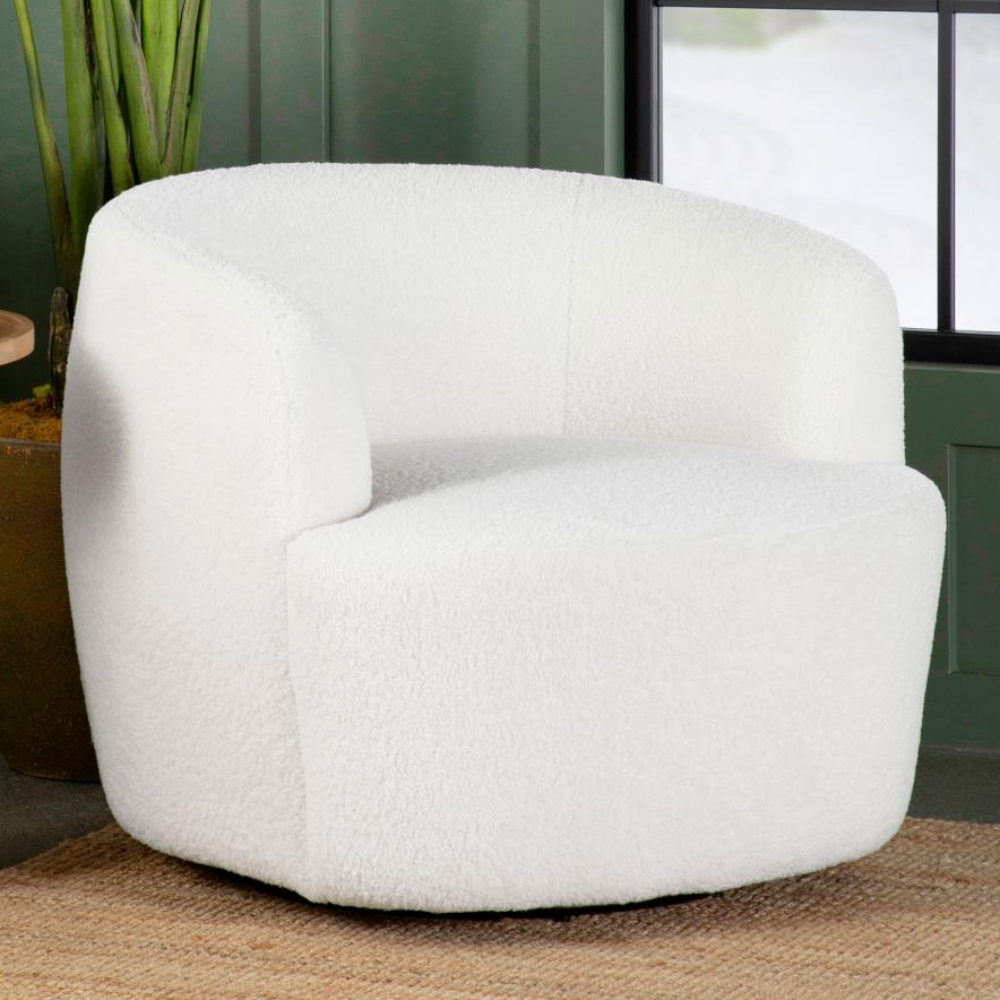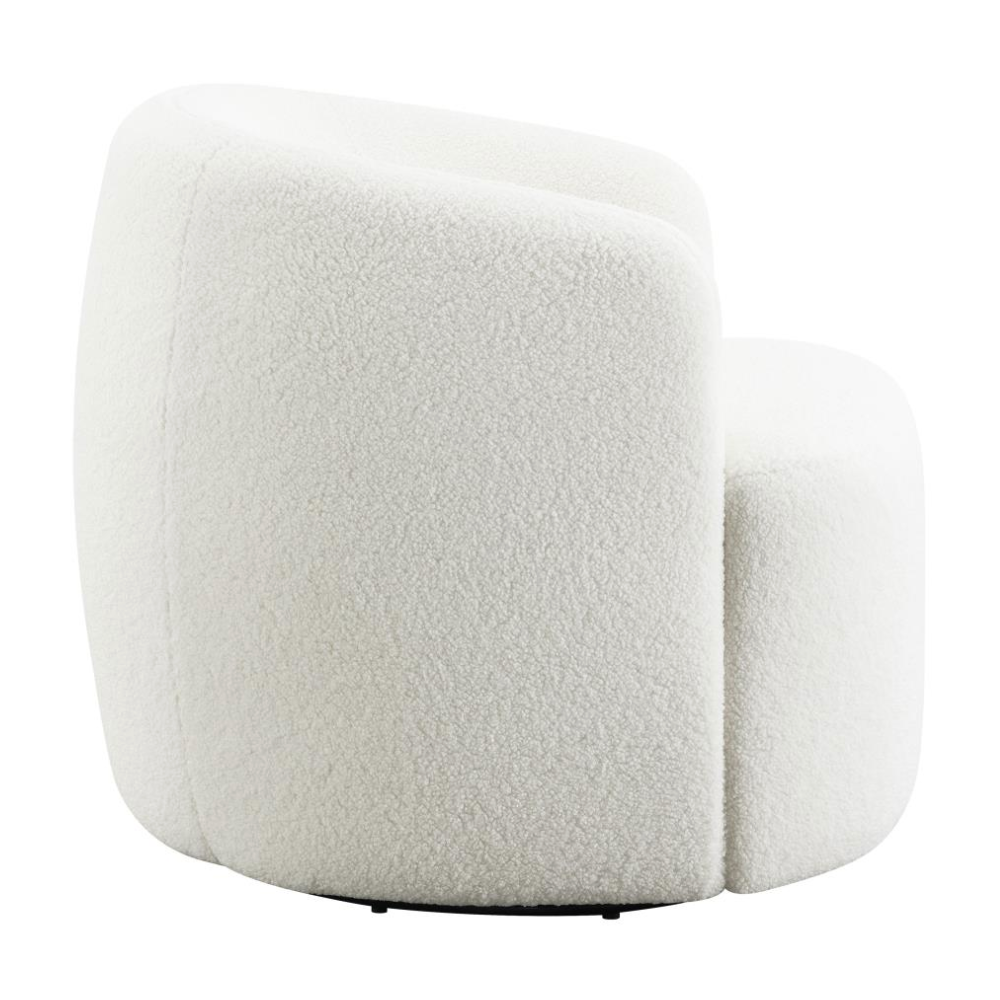 Wrapped entirely in plush faux sheepskin, this swivel chair combines comfort and style. Featuring a 360-degree swivel base, it’s perfect for open floor plans and flexible spaces. Its vintage-inspired barrel design offers a supportive, tight seat and a rounded low-profile backrest that gracefully tapers into the arms. The flush base discreetly hides the swivel mechanism, adding a sleek, modern touch to the light-hued upholstery that blends effortlessly into any décor.