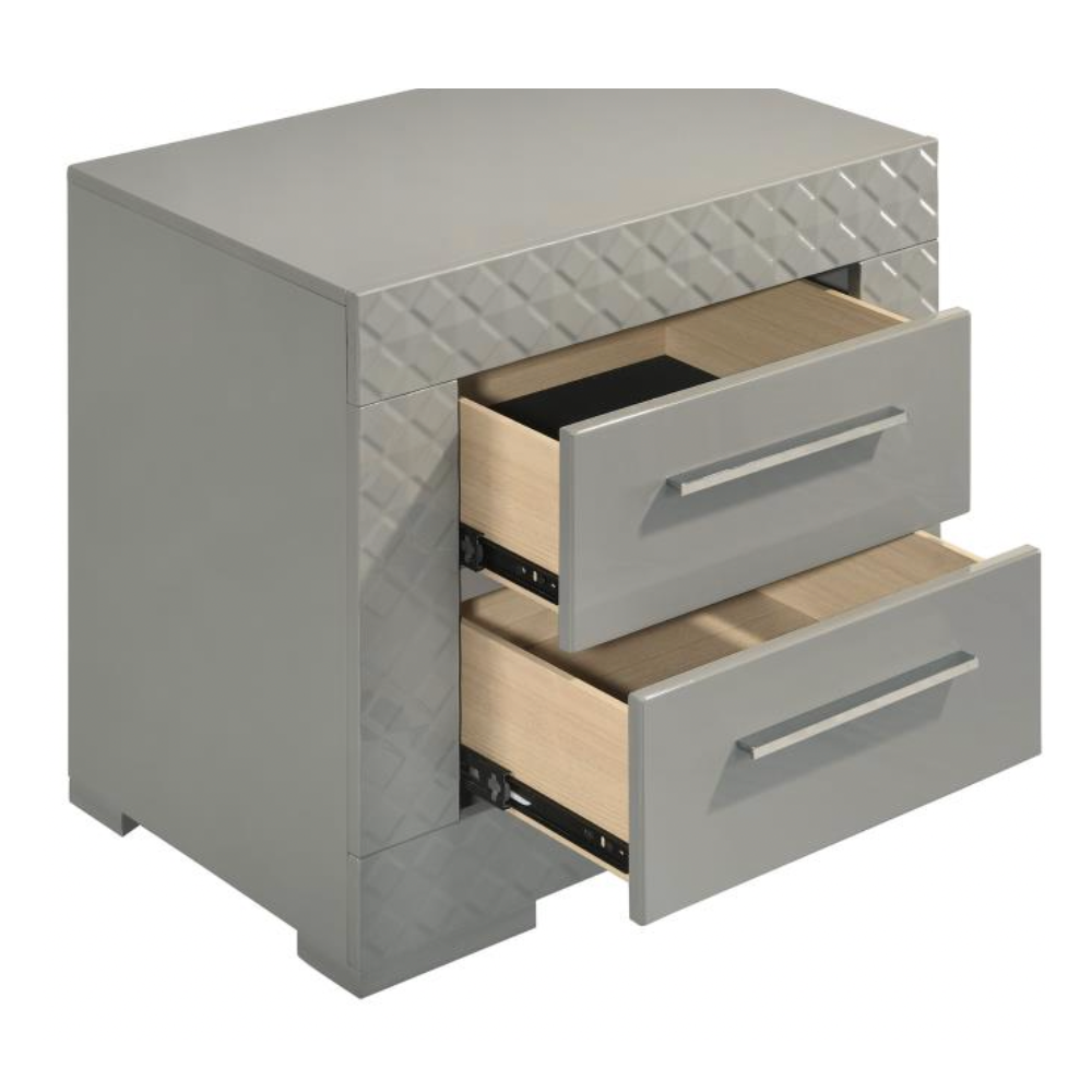 Add a touch of sophistication to your bedroom with this sleek and elegant nightstand. Featuring a smooth high gloss grey finish, this piece channels modern Italian style through clean lines and a minimalist silhouette. Two spacious drawers keep bedside essentials organized, while the felt-lined top drawer offers a gentle surface for delicate items. Crafted from solid hardwood and engineered wood, this nightstand delivers both style and durability.