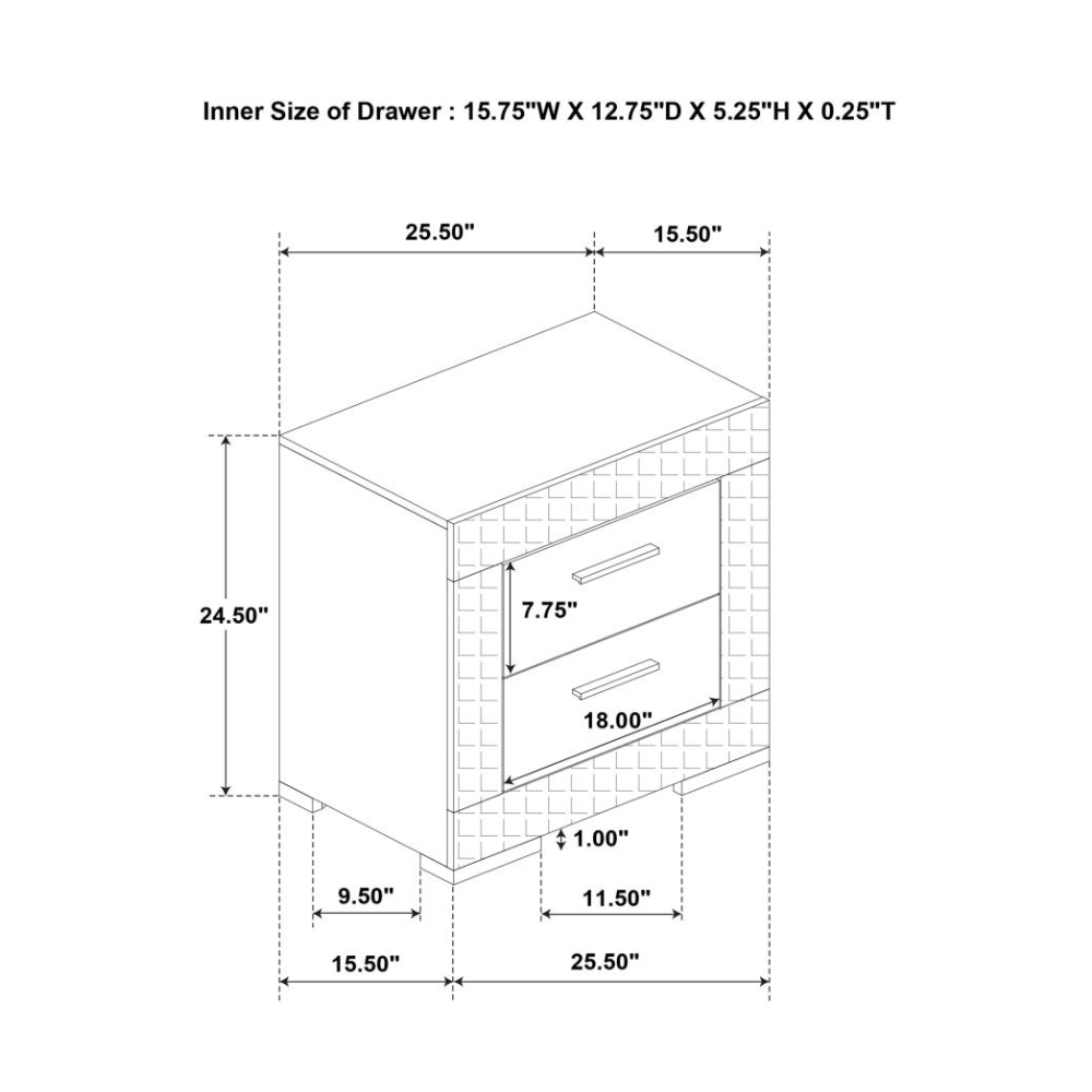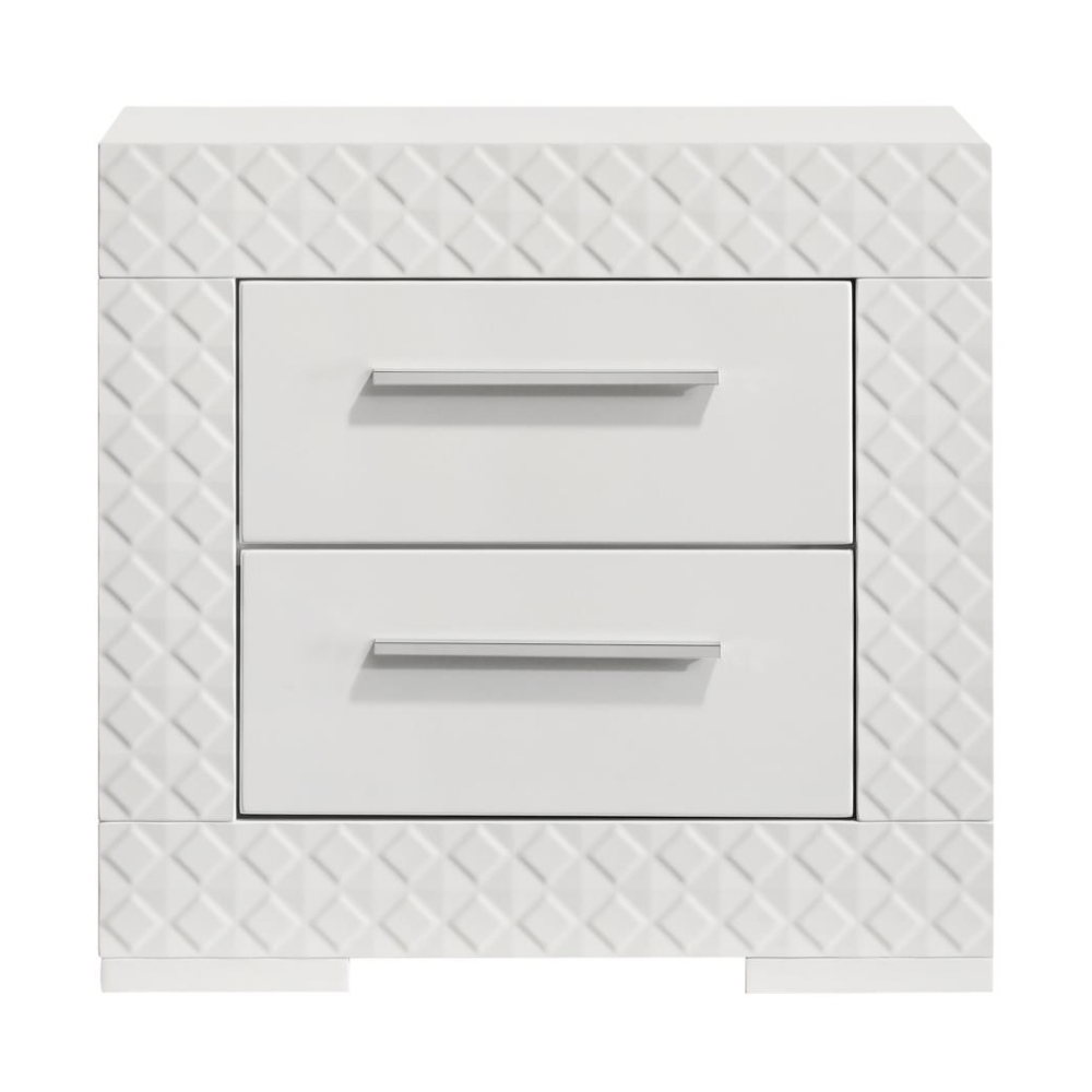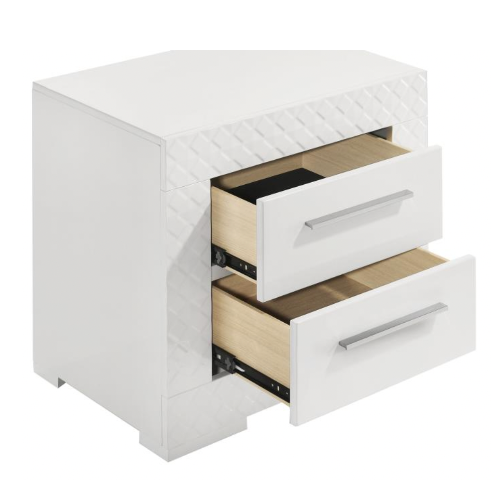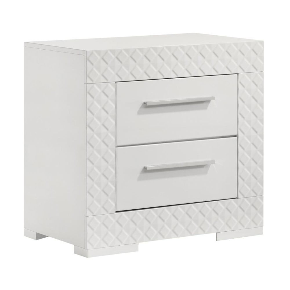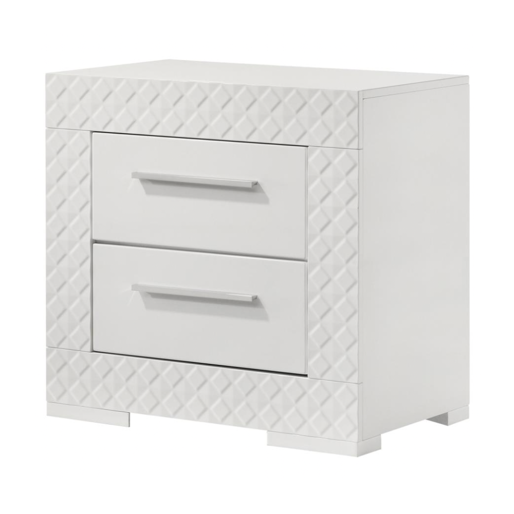 Add a touch of sophistication to your bedroom with this sleek and elegant nightstand. Featuring a smooth high gloss white finish, this piece channels modern Italian style through clean lines and a minimalist silhouette. Two spacious drawers keep bedside essentials organized, while the felt-lined top drawer offers a gentle surface for delicate items. Crafted from solid hardwood and engineered wood, this nightstand delivers both style and durability.