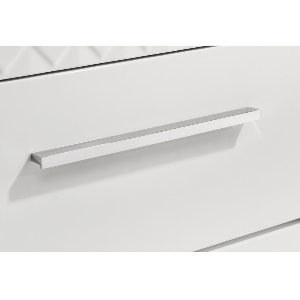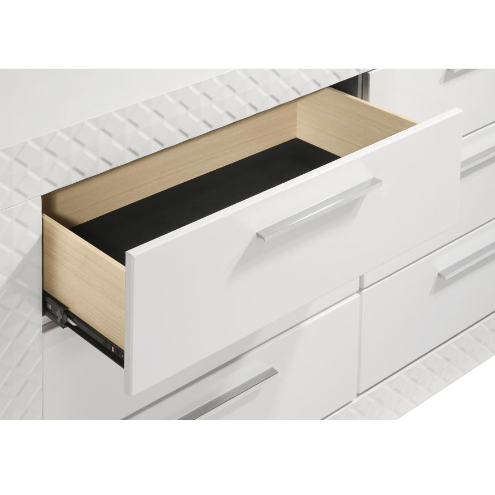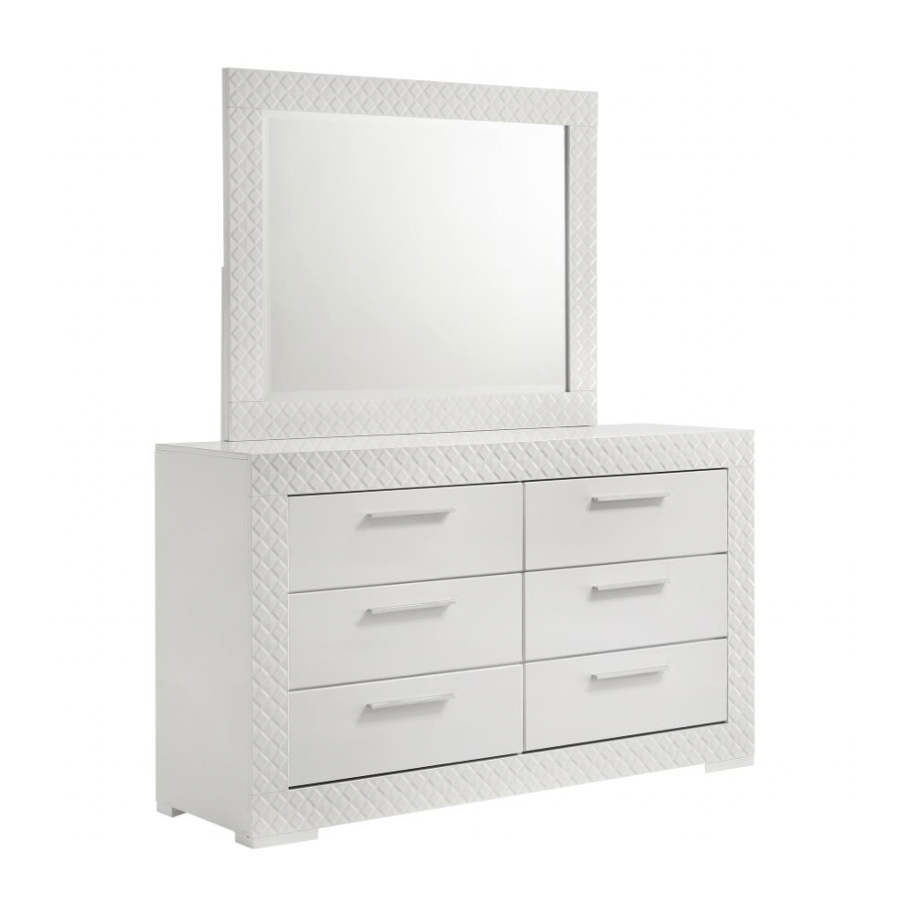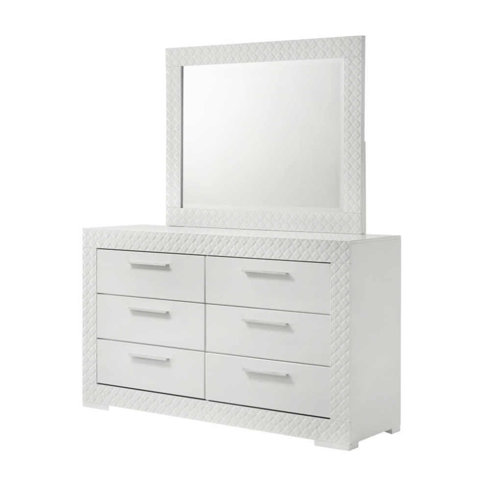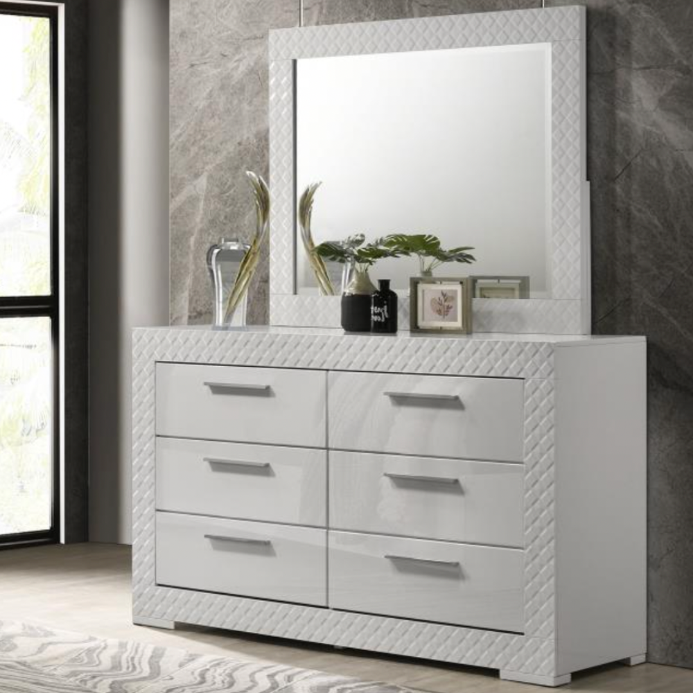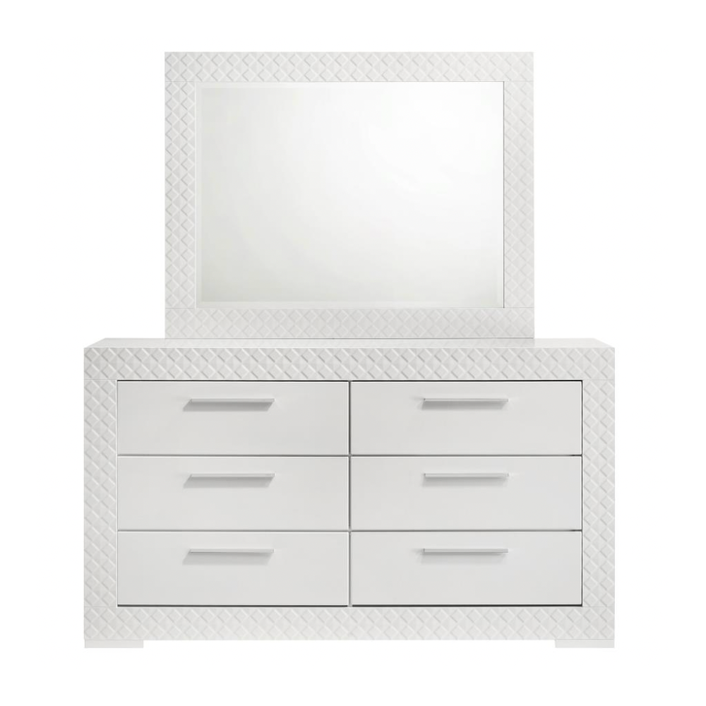 Bring refined sophistication to your bedroom with this modern dresser and mirror set. A high gloss white finish and 3D diamond tile emboss create a sleek, Italian-inspired design. Six drawers with felt-lined tops offer practical storage, while the matching mirror completes the luxurious look.