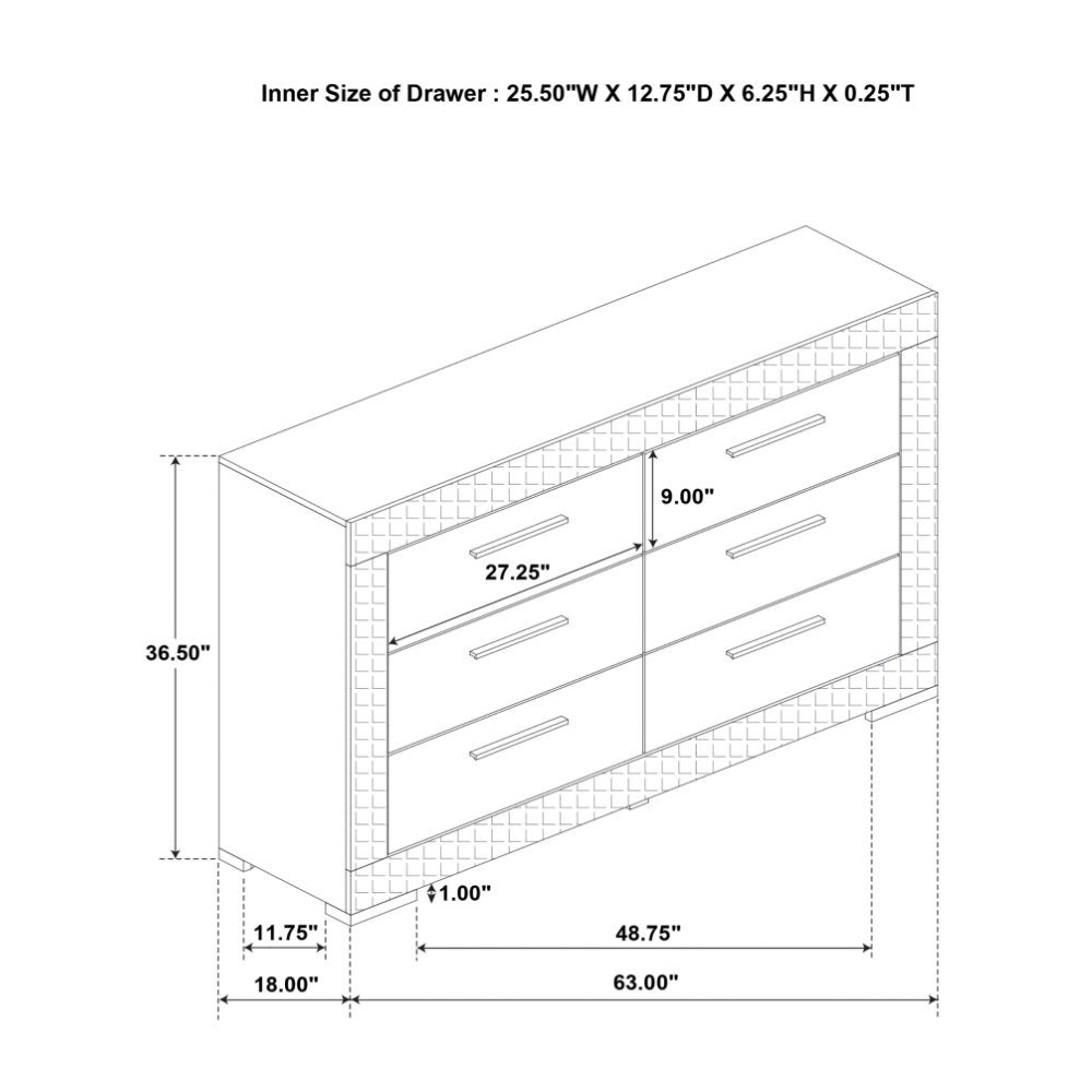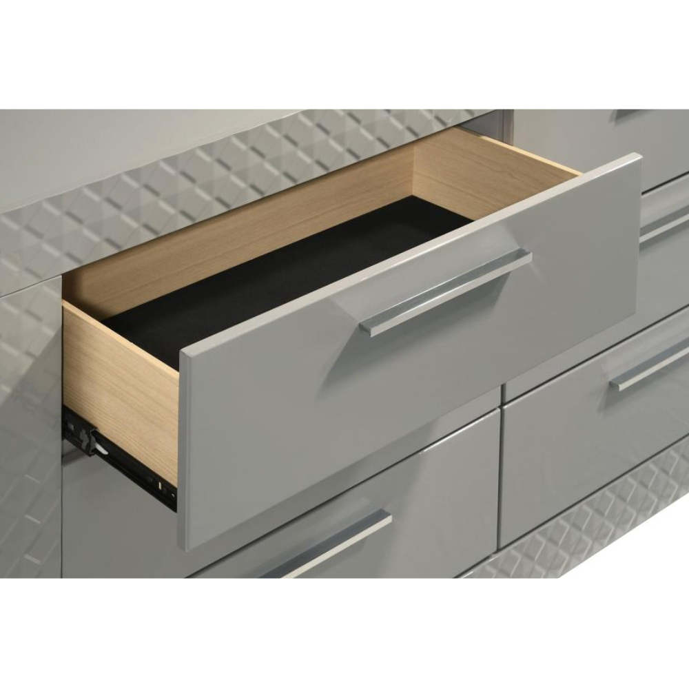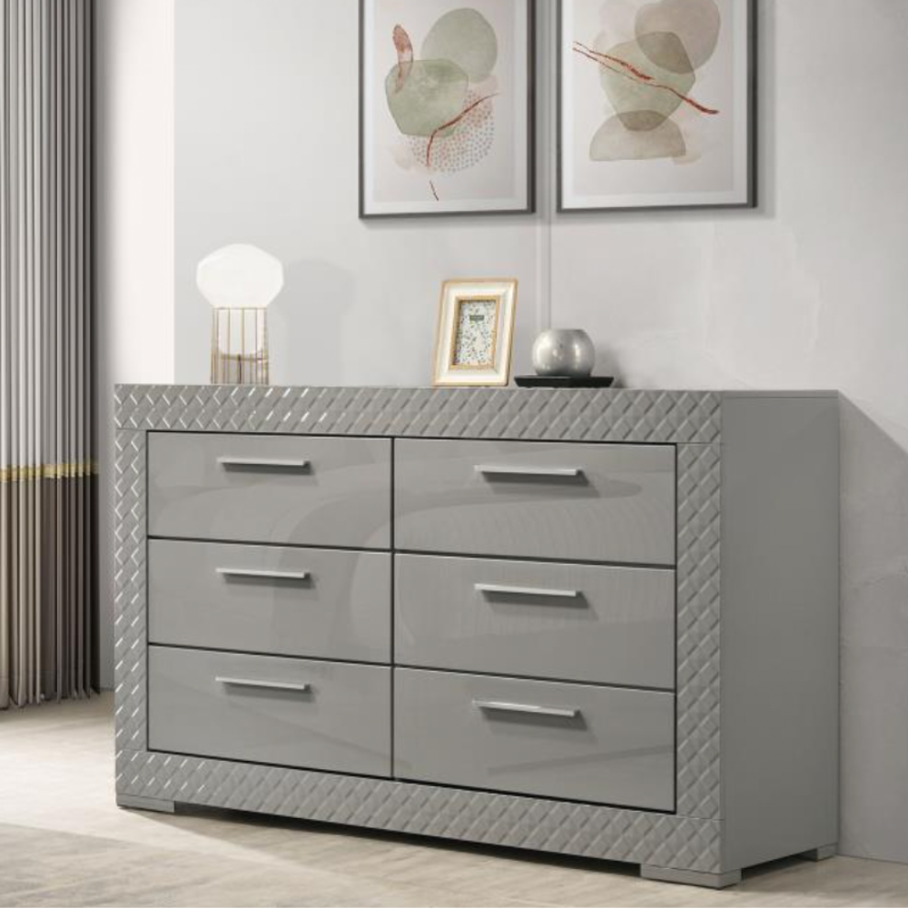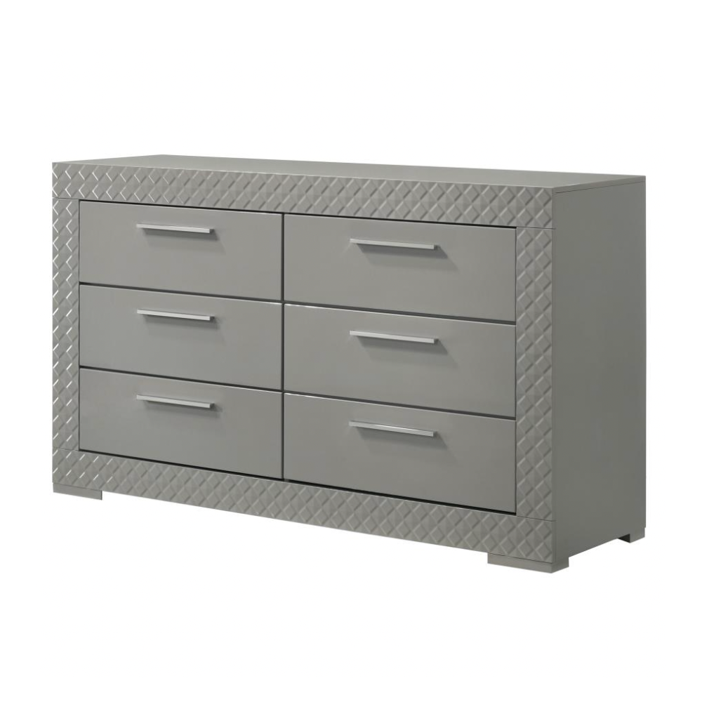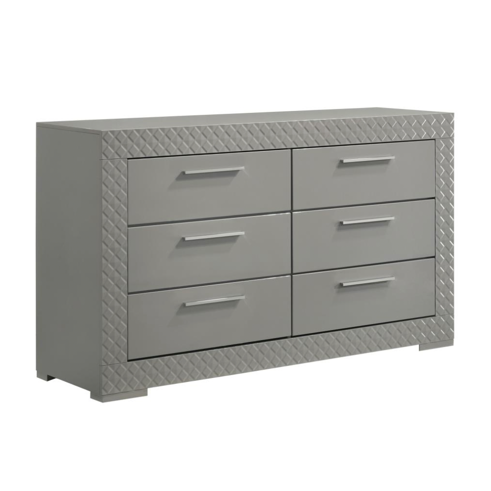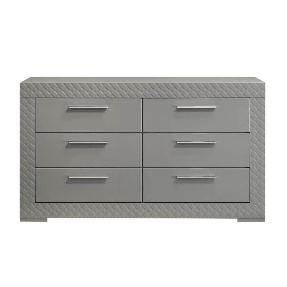 Elevate your bedroom décor with this sophisticated modern dresser, where sleek form meets thoughtful function. A pristine grey high gloss finish reflects contemporary Italian design, while the 3D diamond tile emboss lends texture and visual intrigue. Six spacious drawers provide ample storage, with felt-lined top drawers offering gentle protection for delicate items. Built from solid hardwood and engineered wood, this dresser features durable joinery and smooth metal glides for lasting performance.