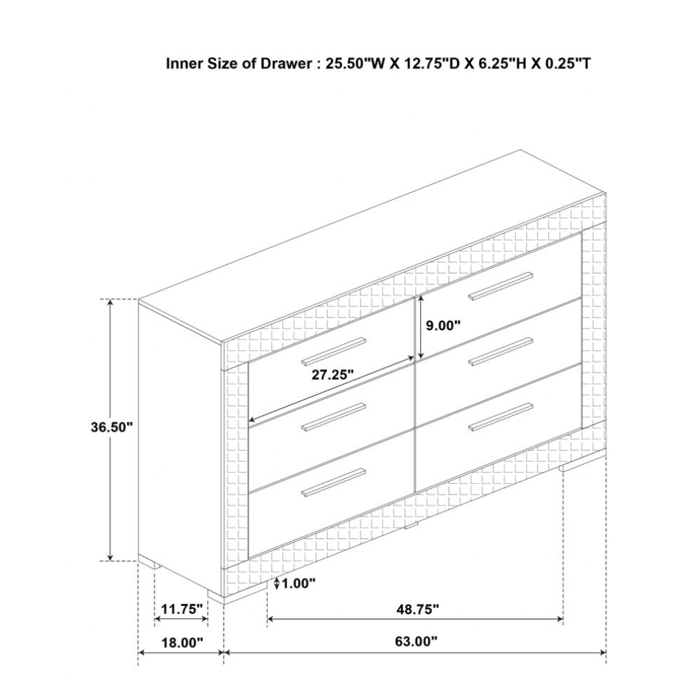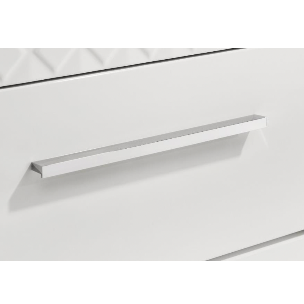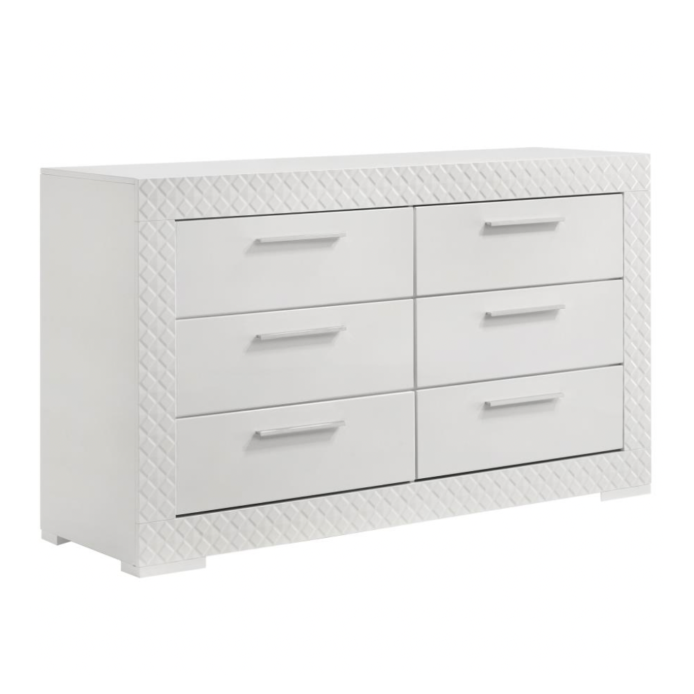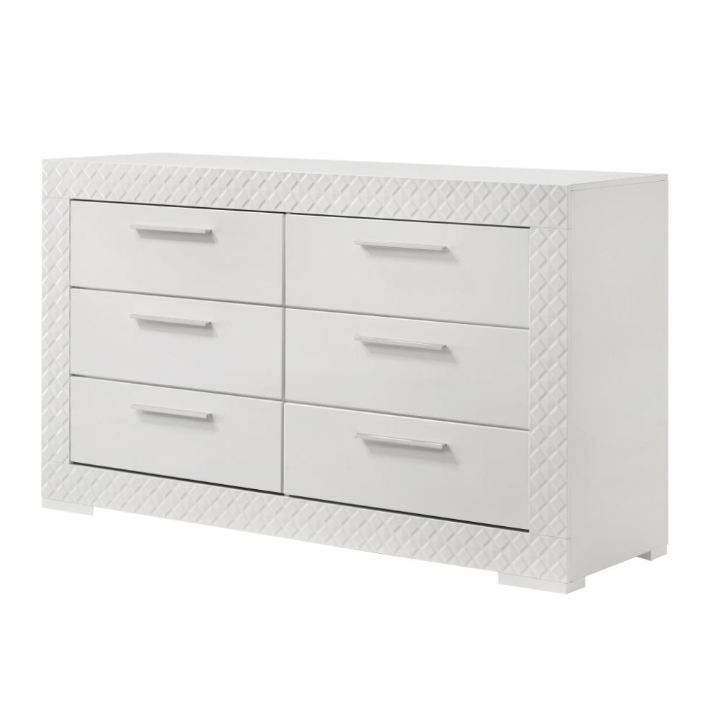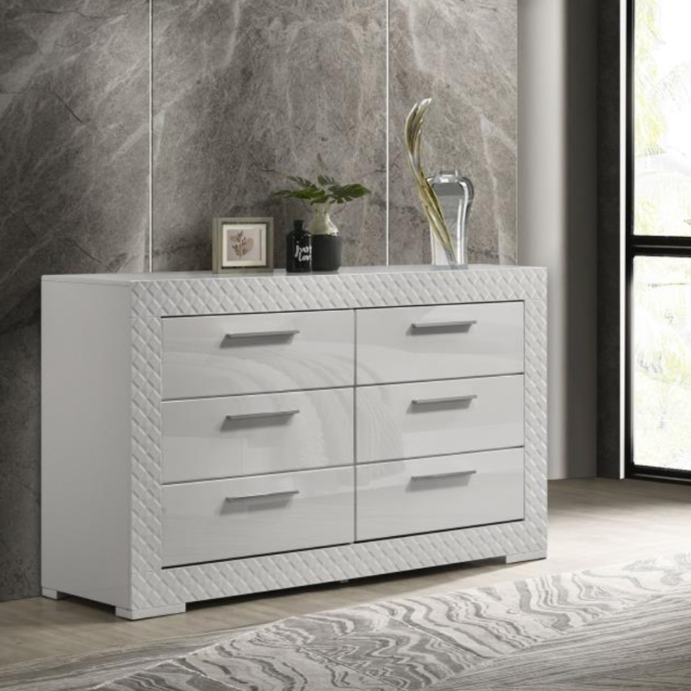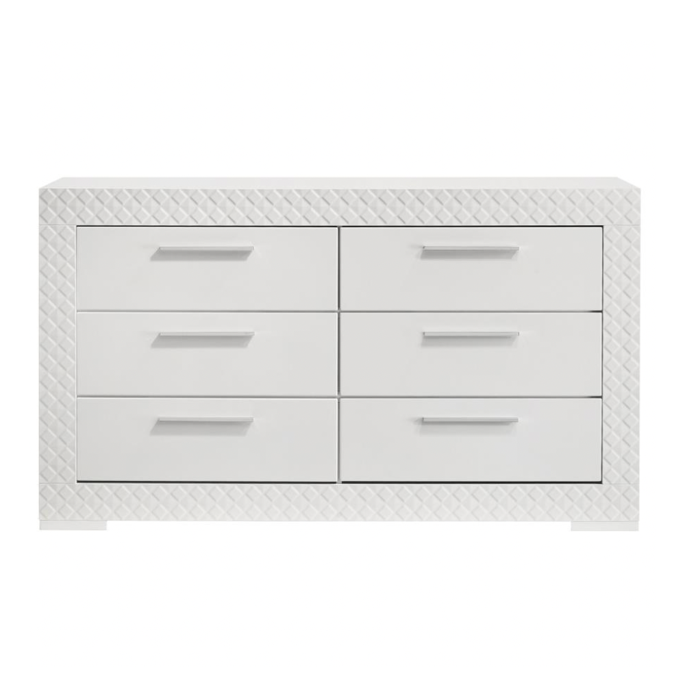 Elevate your bedroom décor with this sophisticated modern dresser, where sleek form meets thoughtful function. A pristine white high gloss finish reflects contemporary Italian design, while the 3D diamond tile emboss lends texture and visual intrigue. Six spacious drawers provide ample storage, with felt-lined top drawers offering gentle protection for delicate items. Built from solid hardwood and engineered wood, this dresser features durable joinery and smooth metal glides for lasting performance.