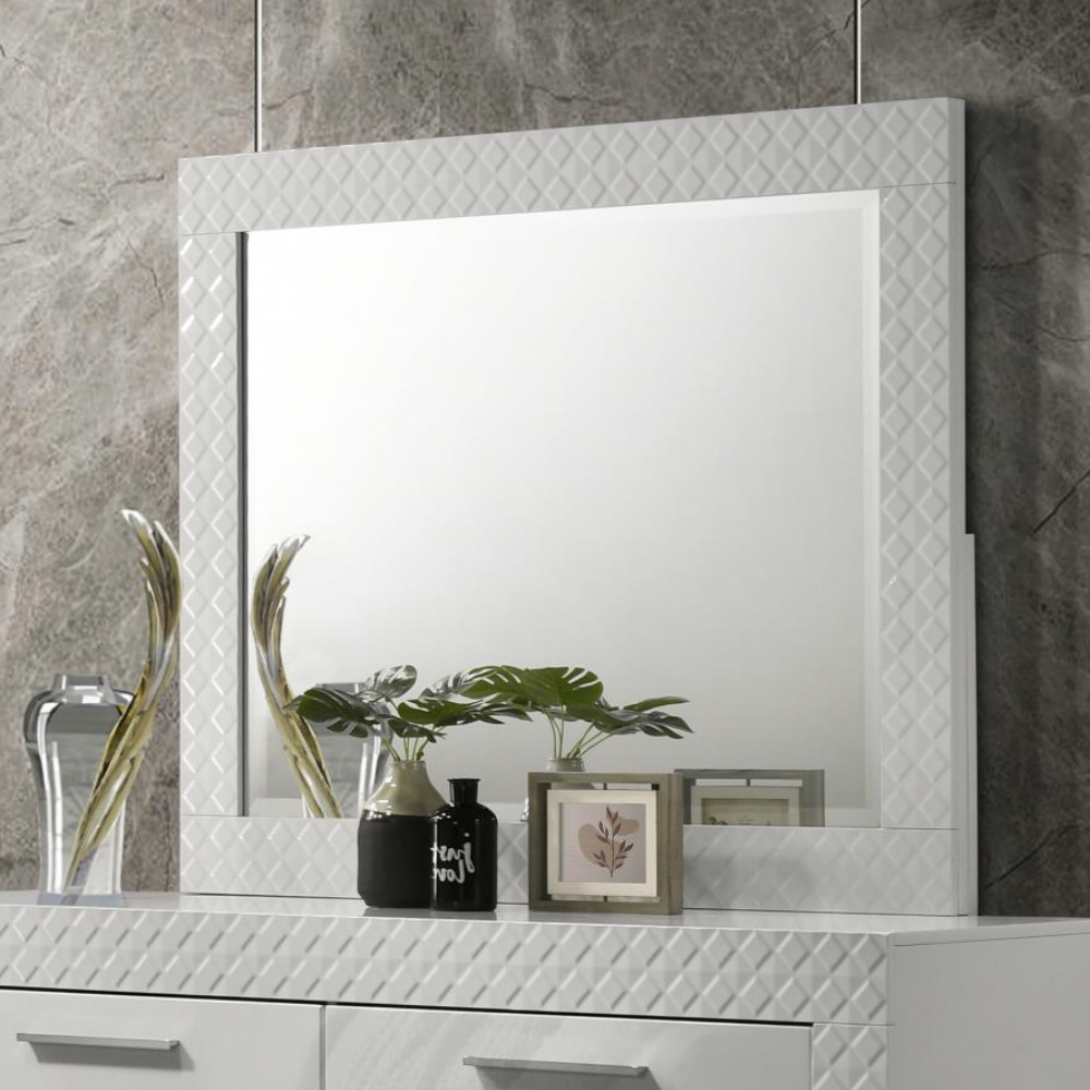 Complete your dresser setup with this modern mirror, crafted to complement contemporary spaces. A high gloss finish and 3D diamond tile emboss deliver texture and shine, while a sturdy frame ensures lasting durability. Its generous size brightens the room and enhances the sense of space.