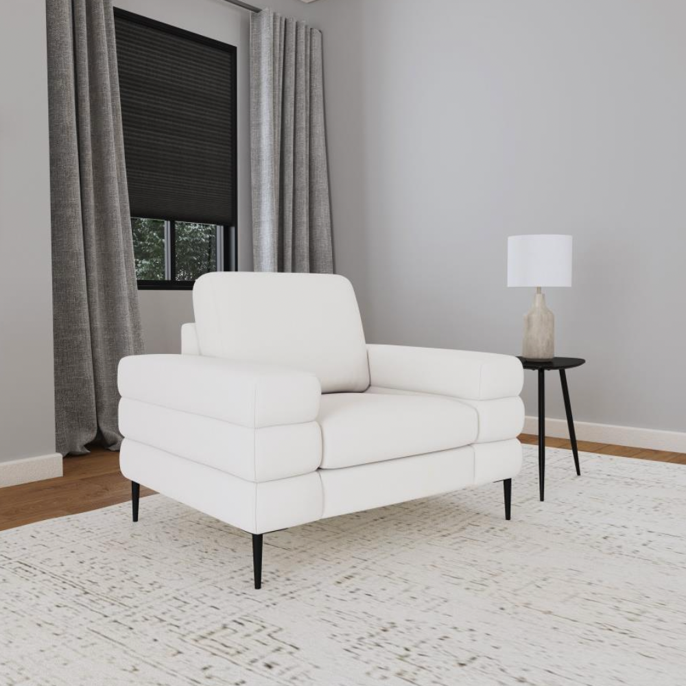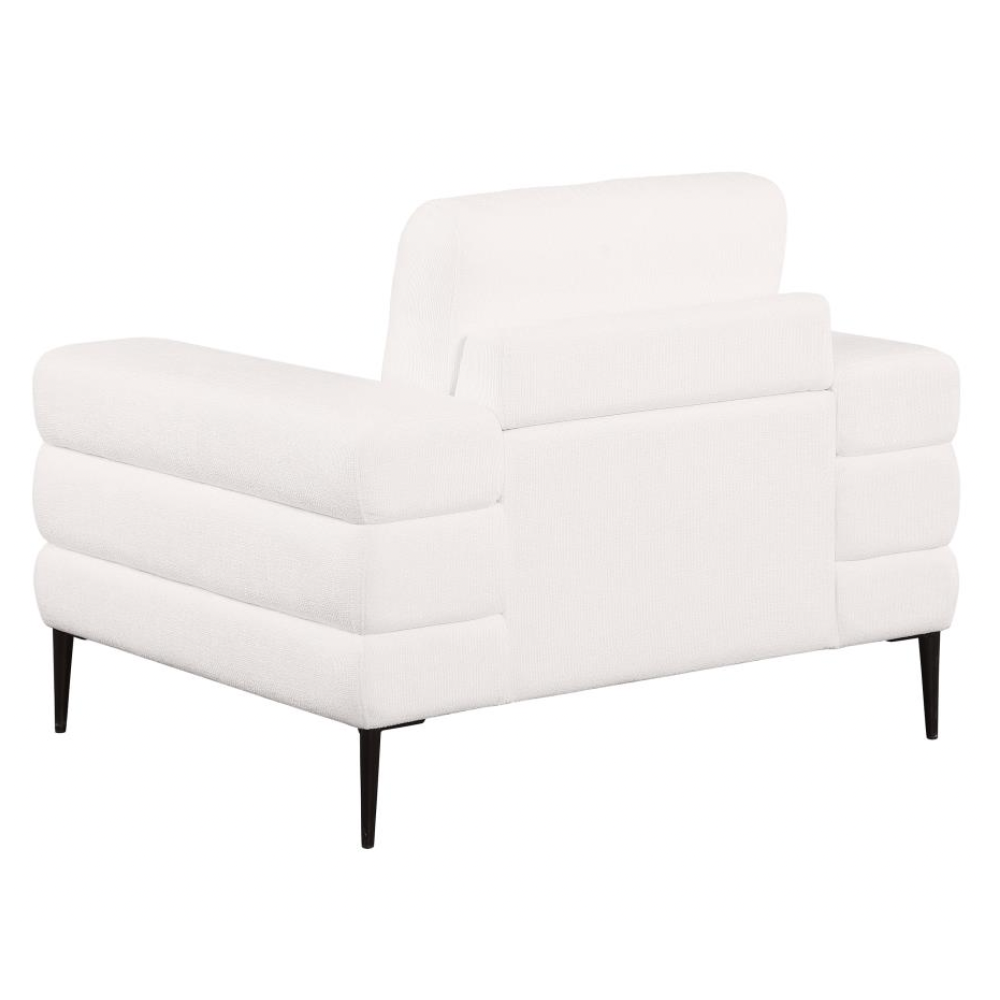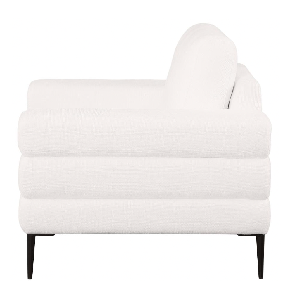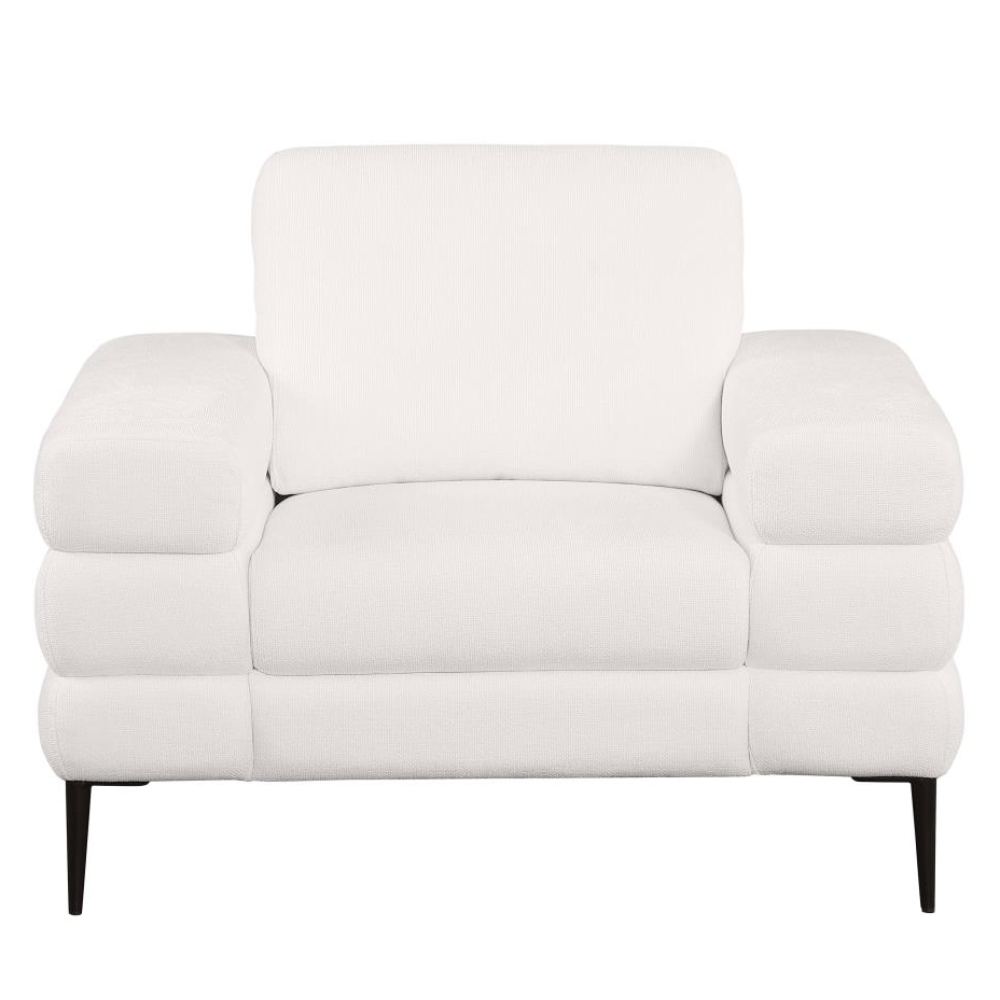 Bring a touch of modern sophistication into your home with this stunning ivory chair. Featuring tube-like geometric sculptured track arms, this chair stands out as a unique design element in any room. The ivory chenille basket weave fabric enhances the luxurious and comfortable seating experience. Reversible back cushions provide lasting support and even wear, while thin metal legs add a sleek, airy appearance and sturdy foundation.