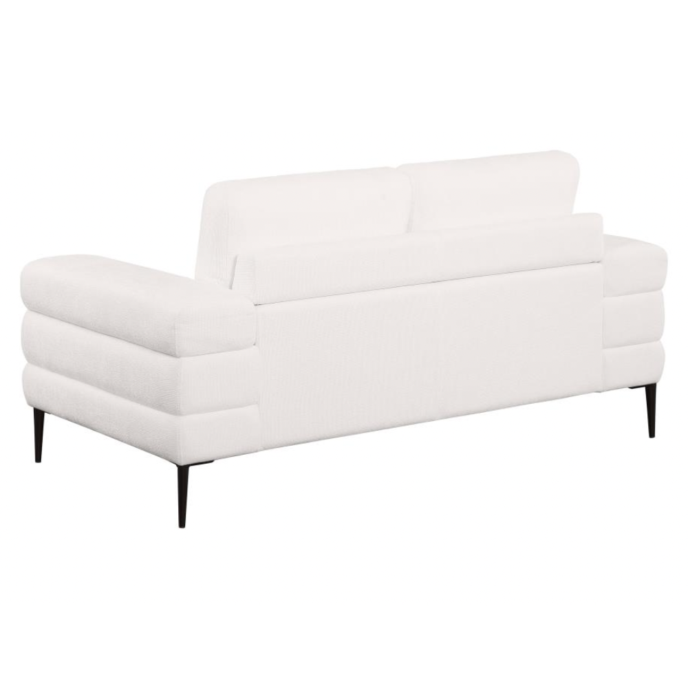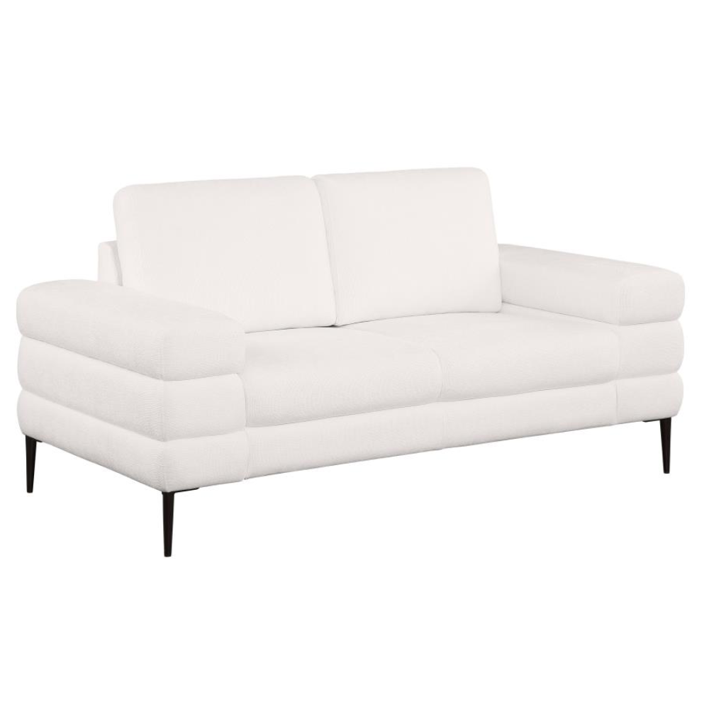 Infuse your living space with a touch of modern sophistication with this elegant ivory loveseat. Its tube-like geometric sculptured track arms create a unique design, making it a standout piece in any room. The ivory chenille basket weave fabric delivers a soft and luxurious seating experience, while reversible back cushions offer lasting comfort and support. Sleek thin metal legs complete the design, adding a light, airy feel and ensuring sturdy support.