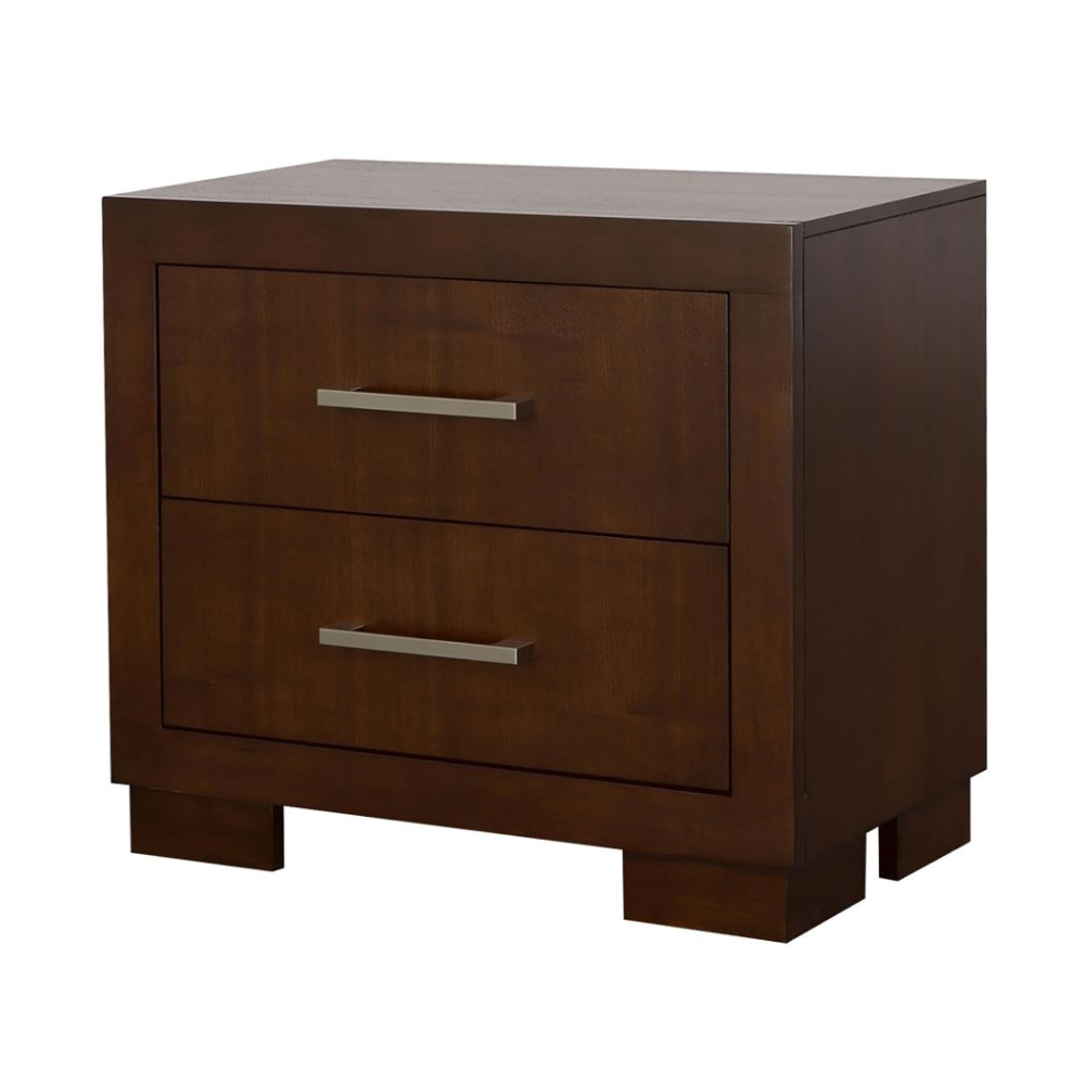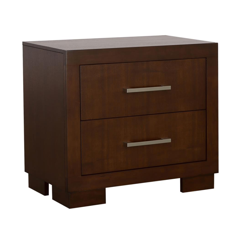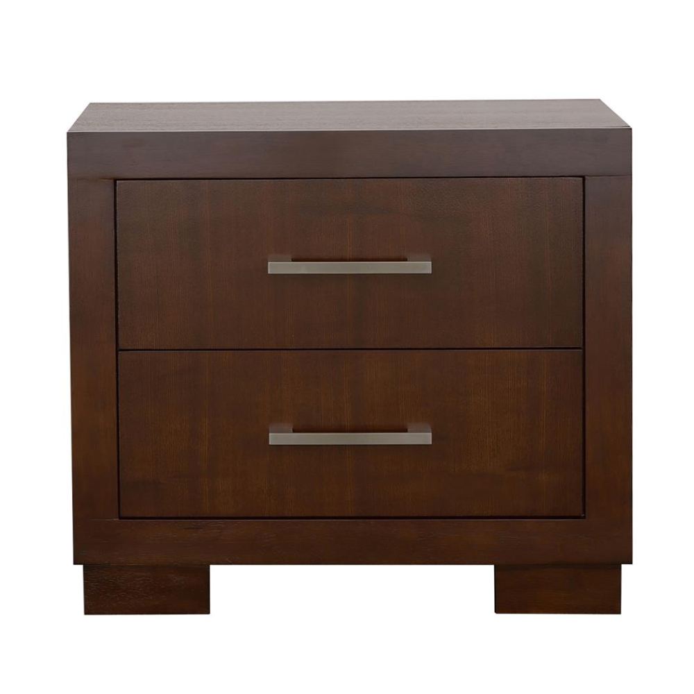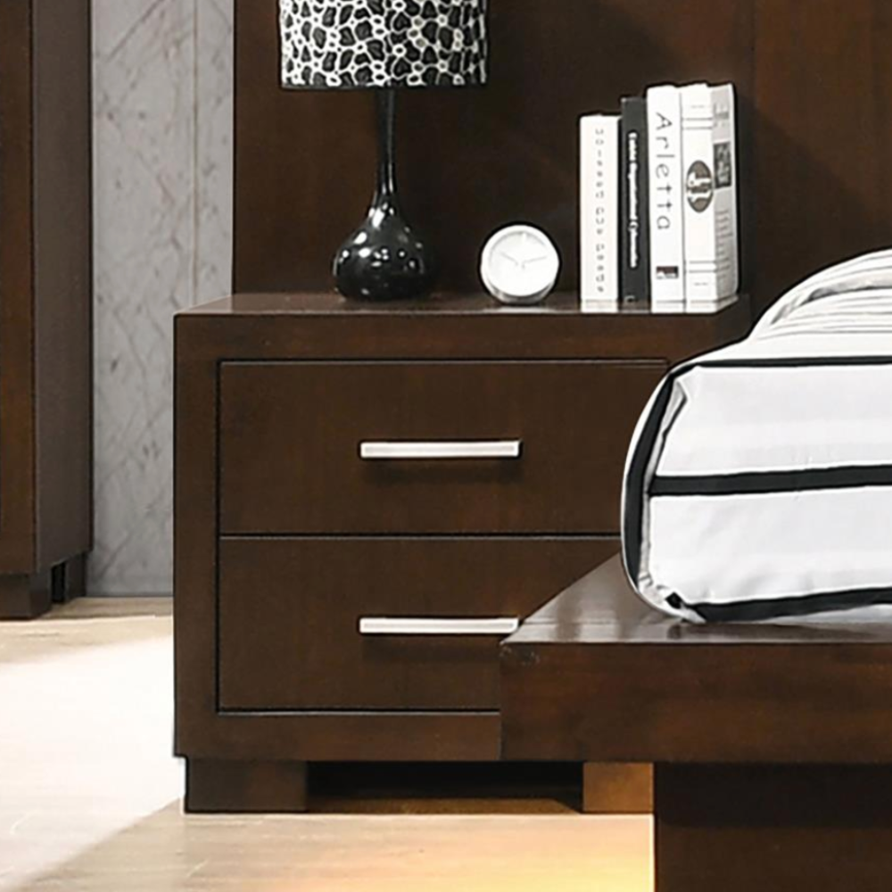 Enhance your bedroom's natural style with this lovely wooden nightstand. Its two roomy drawers include soft, felt lining, protecting precious pieces while adding a touch of glamour. Its deep, rich cappuccino finish is accentuated by gleaming silver-tone bar handles. Place a reading lamp on top to illuminate your surroundings as you settle in for the evening. This nightstand is an excellent choice to finish off the decor of a guest or master bedroom.