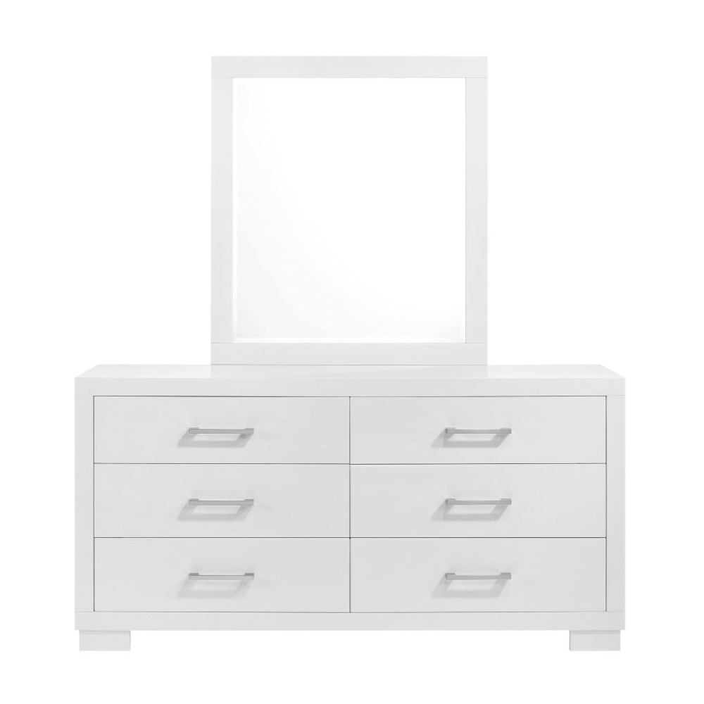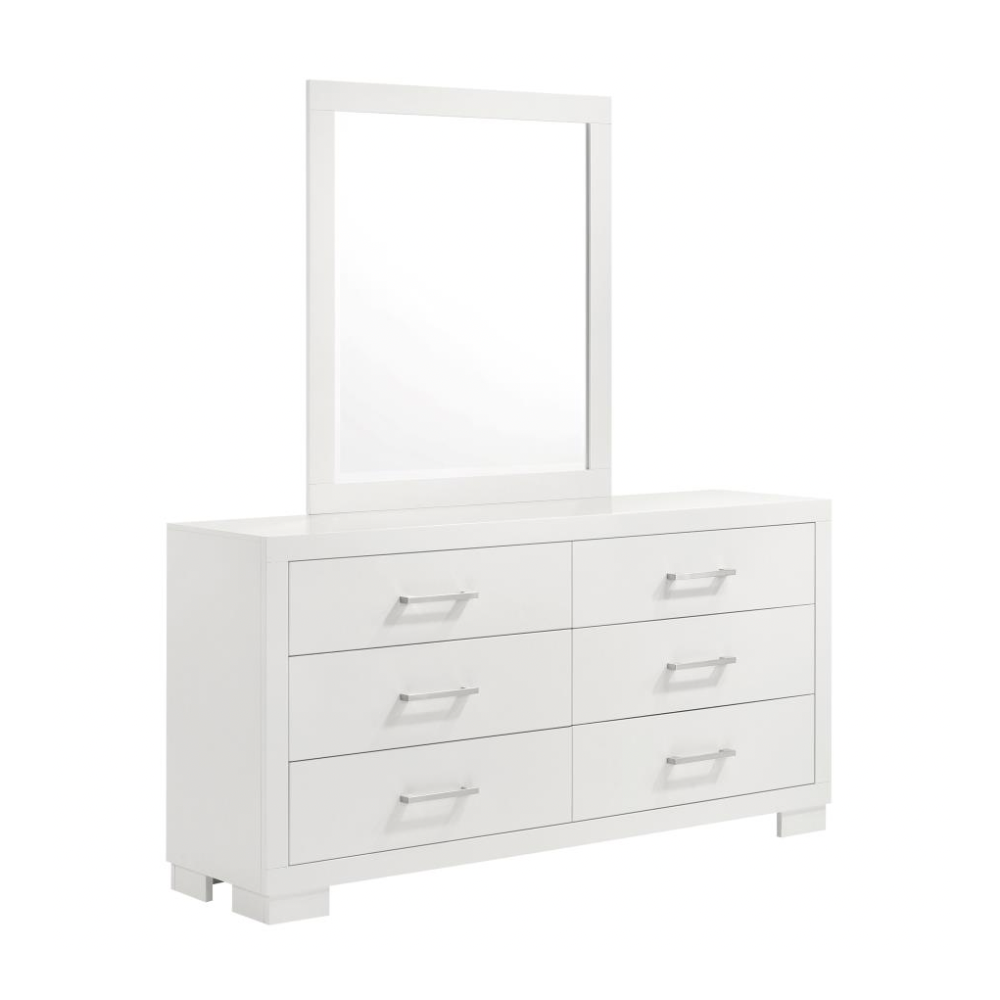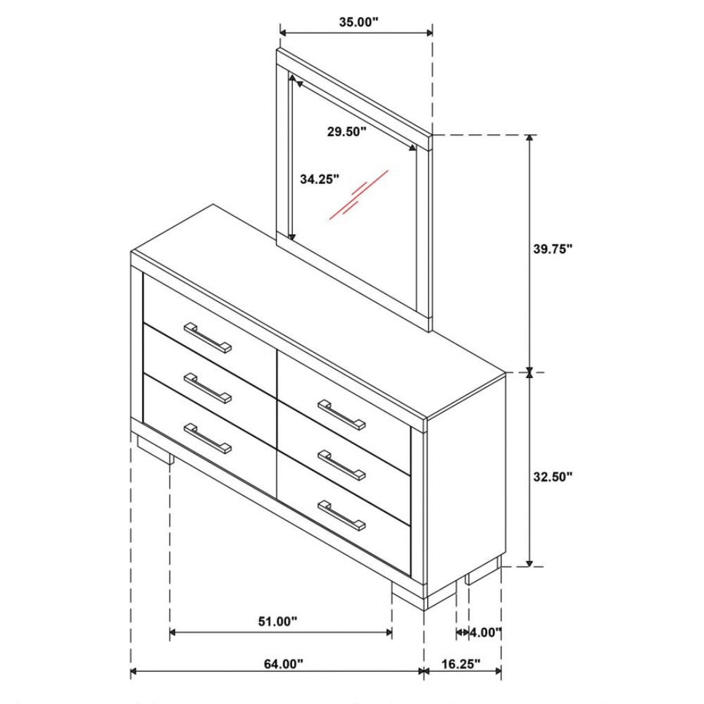 Infuse your bedroom with the sophisticated charm of this fashionable and functional six-drawer dresser. Offering ample storage with felt-lined drawers for delicate items, its rich cappuccino finish and silver bar handles exude elegance. Designed for versatility, it can grace a guest room or a master en suite with equal flair. Complete your contemporary set with the matching mirror, framed in cappuccino and featuring beveled glass, to ensure you always leave your home looking impeccable.