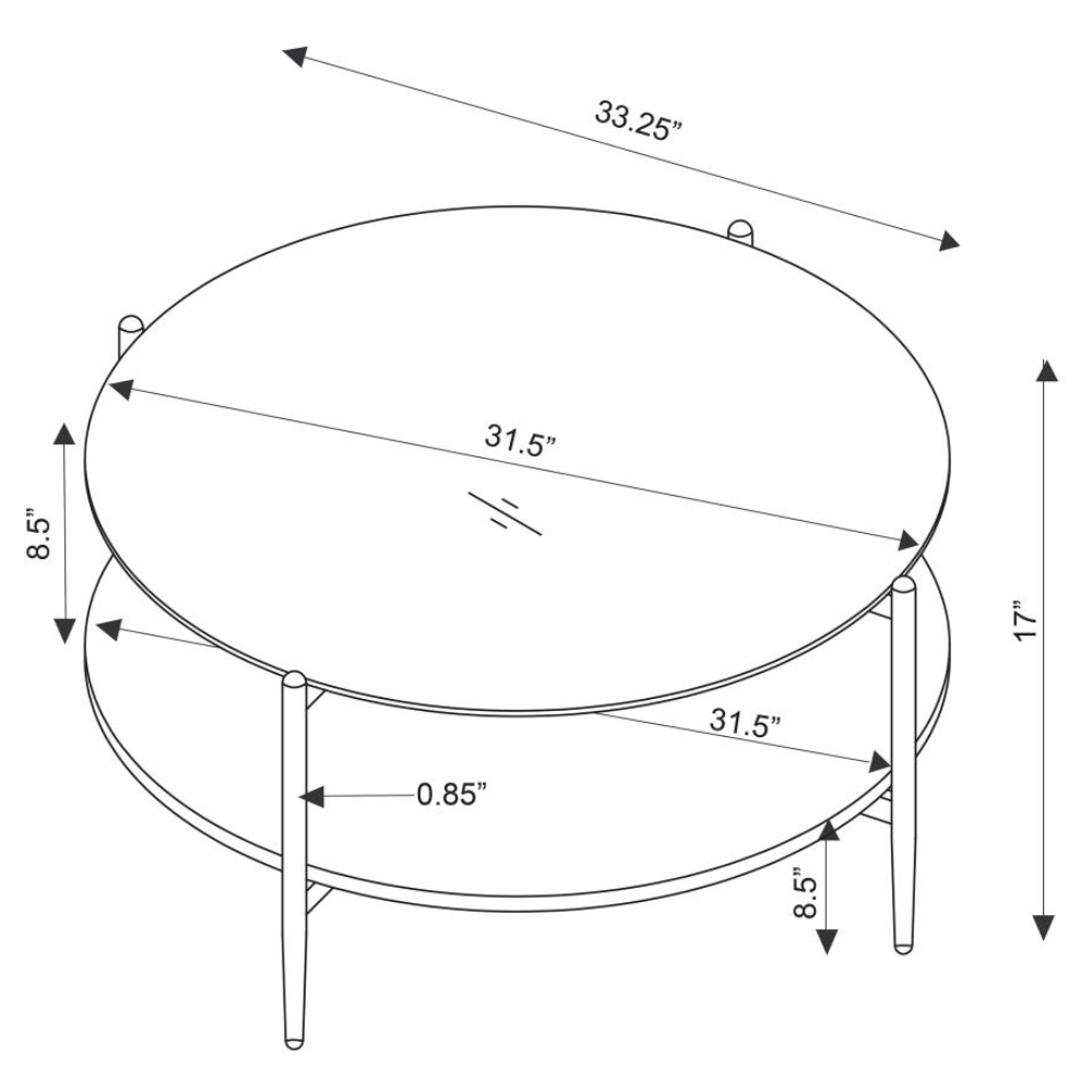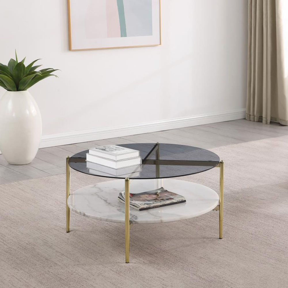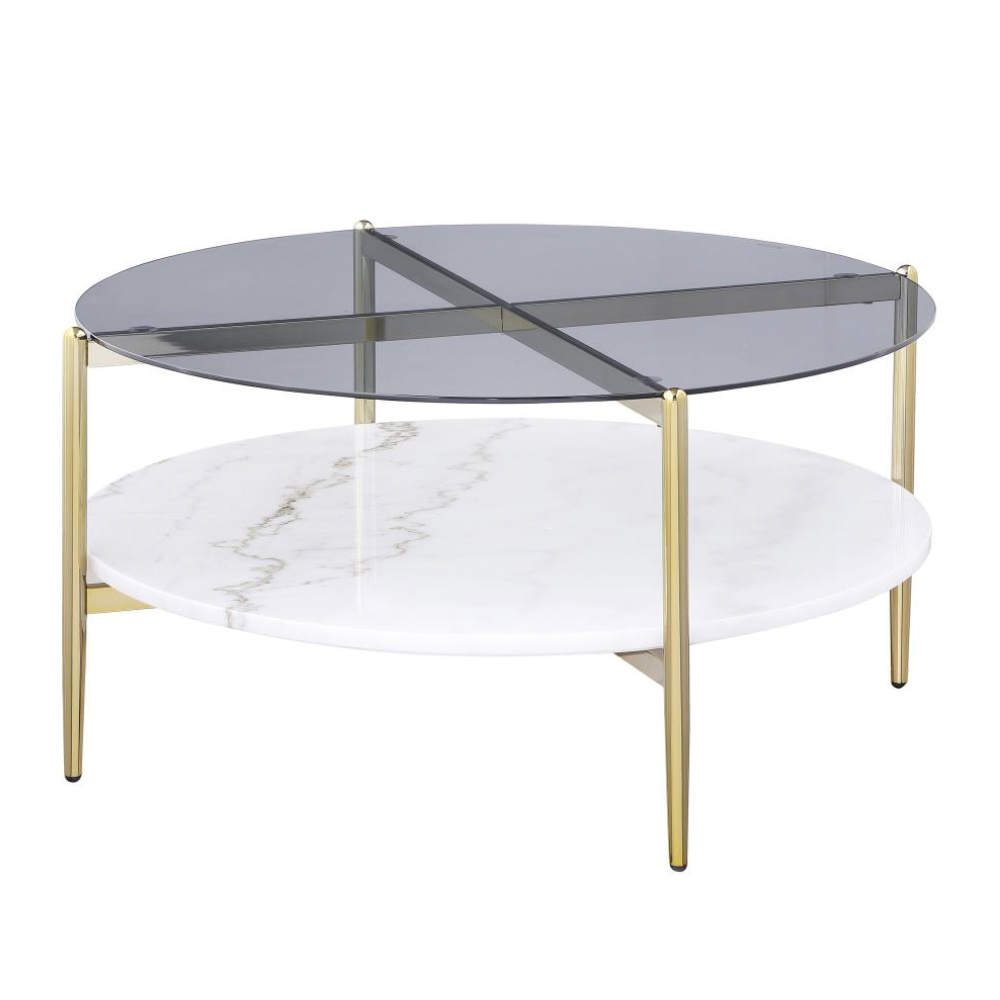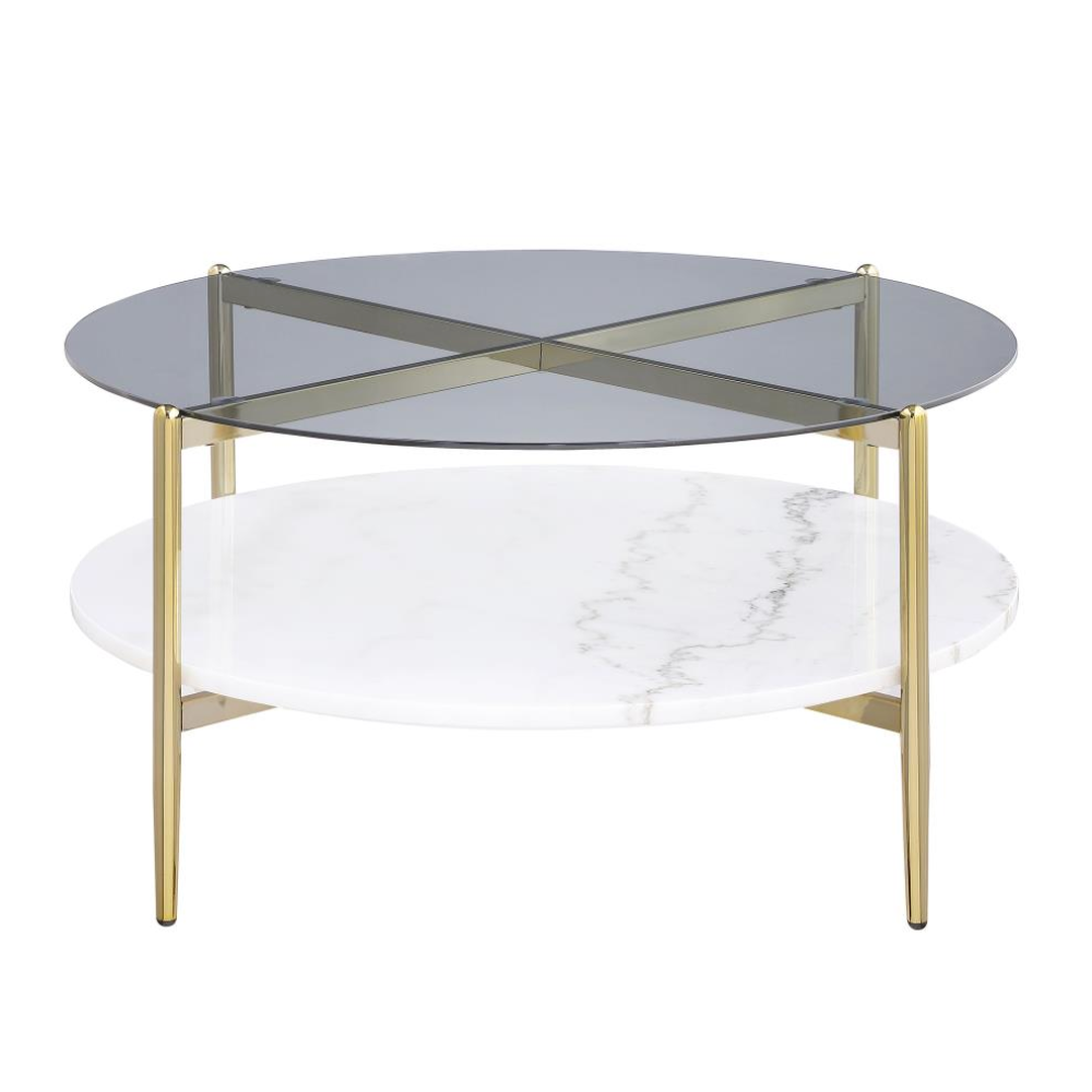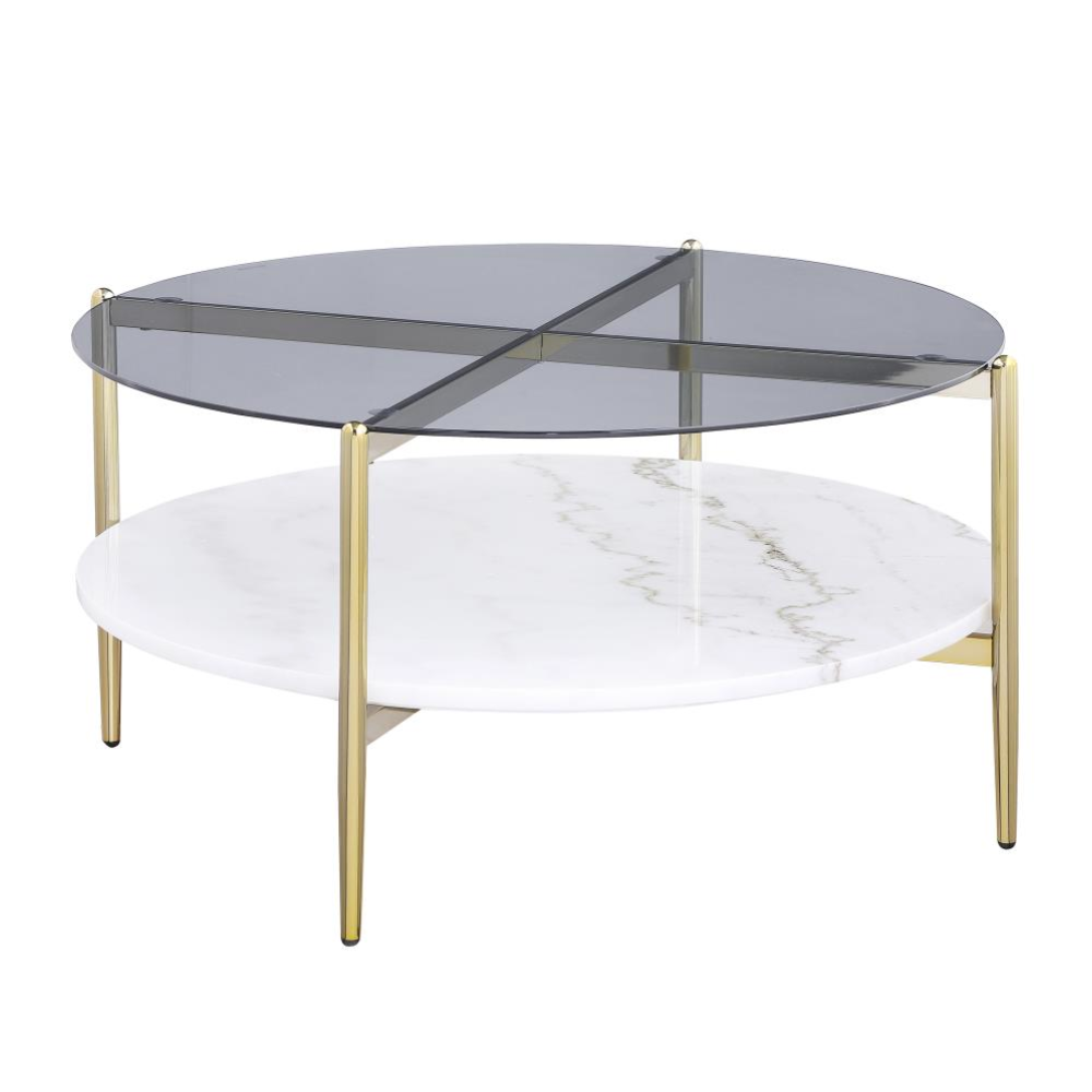 The modern coffee table creates a glamorous focal point with its blend of glass and white marble. A warm, rich gold finish adds elegance to its slim, straight legs. The round table features a smoke gray glass top that highlights crossing stretchers underneath, while a luminous white marble lower shelf adds rich sophistication. Perfect for adding a tailored centerpiece or standing alone, this table brings a luxurious ambiance to any living room.