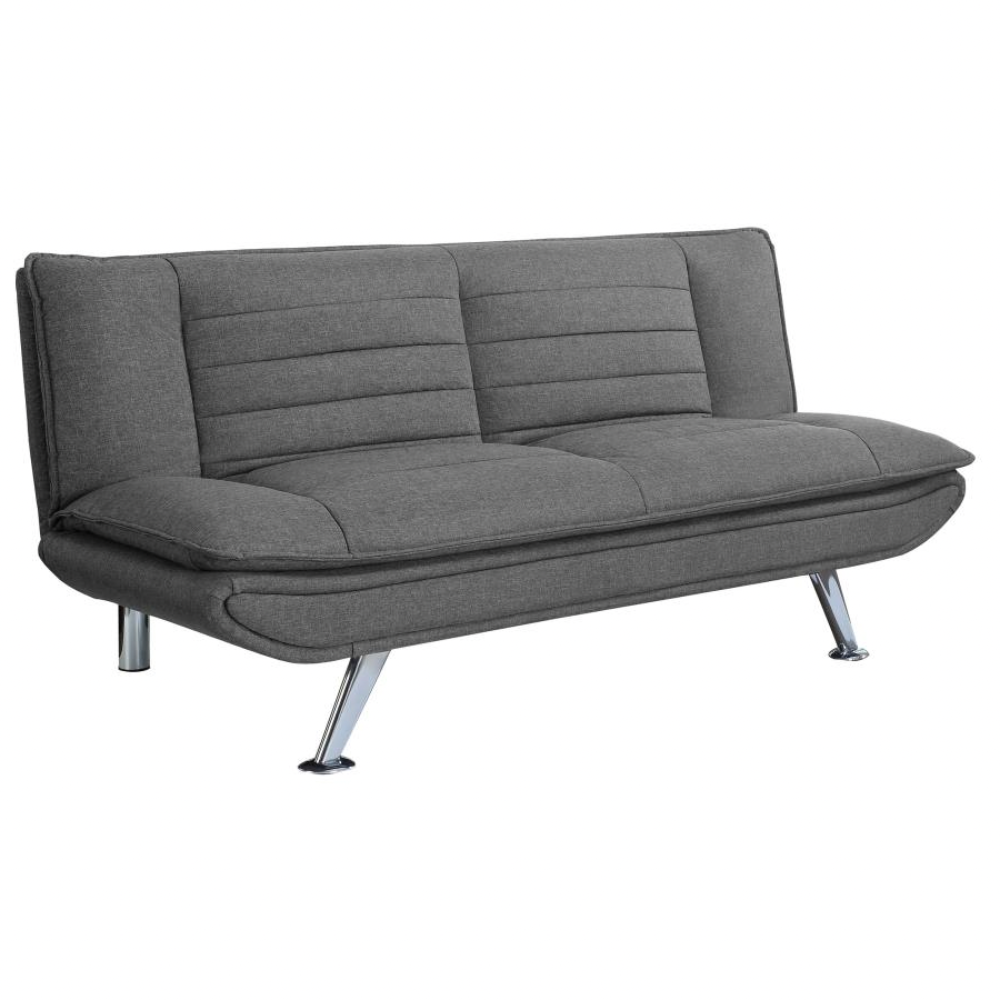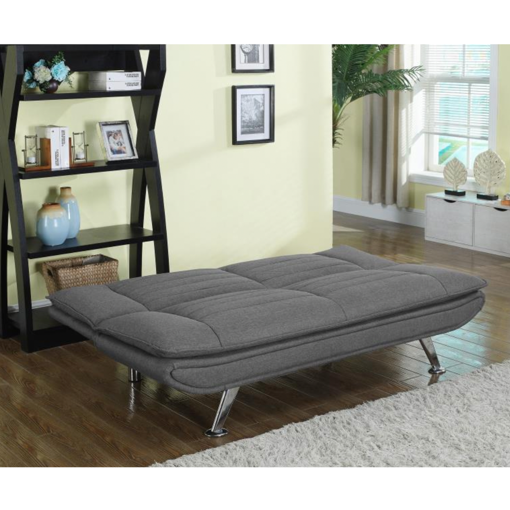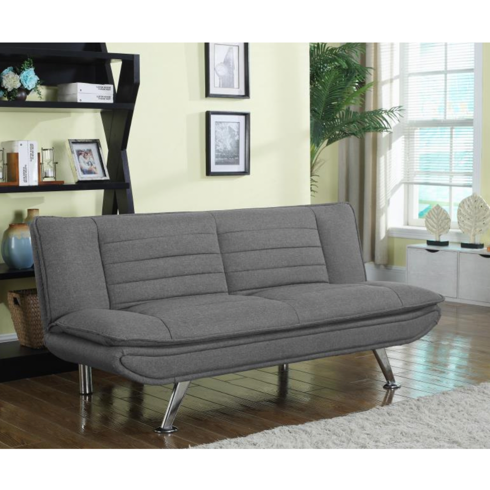 With a sleek, modern silhouette, this sofa bed adds a touch of contemporary glamour to any living space. Designed for both style and comfort, it features pillow-top seating over sinuous spring decking with high-density foam, providing a relaxing spot for lounging. Tufted stitching and high-shine chrome-finished metal legs enhance its attractive look, while soft grey woven fabric upholstery ties it all together with elegance. Easily converting from a sofa to a bed, this versatile piece is perfect for a variety of cozy, convenient uses.