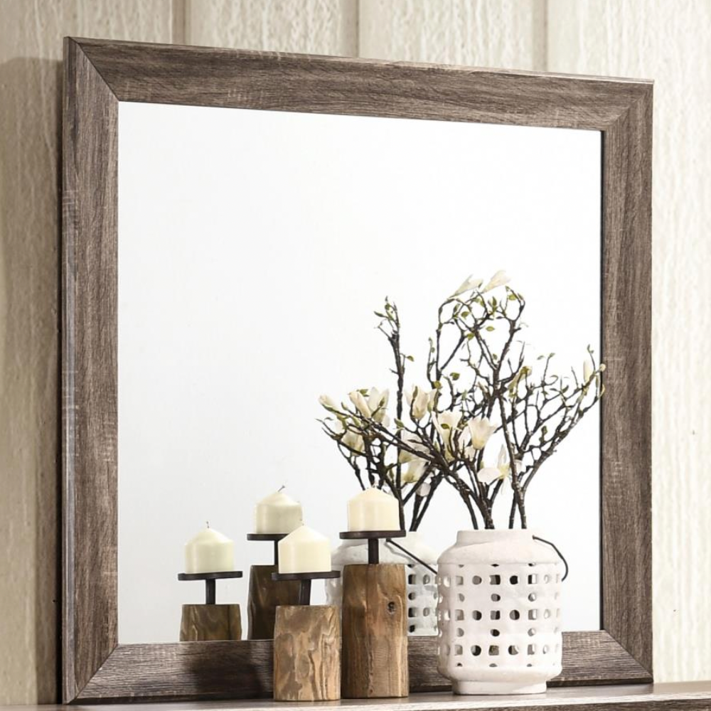 - Modern Aesthetic: Wood dresser mirror with a soft washed taupe finish