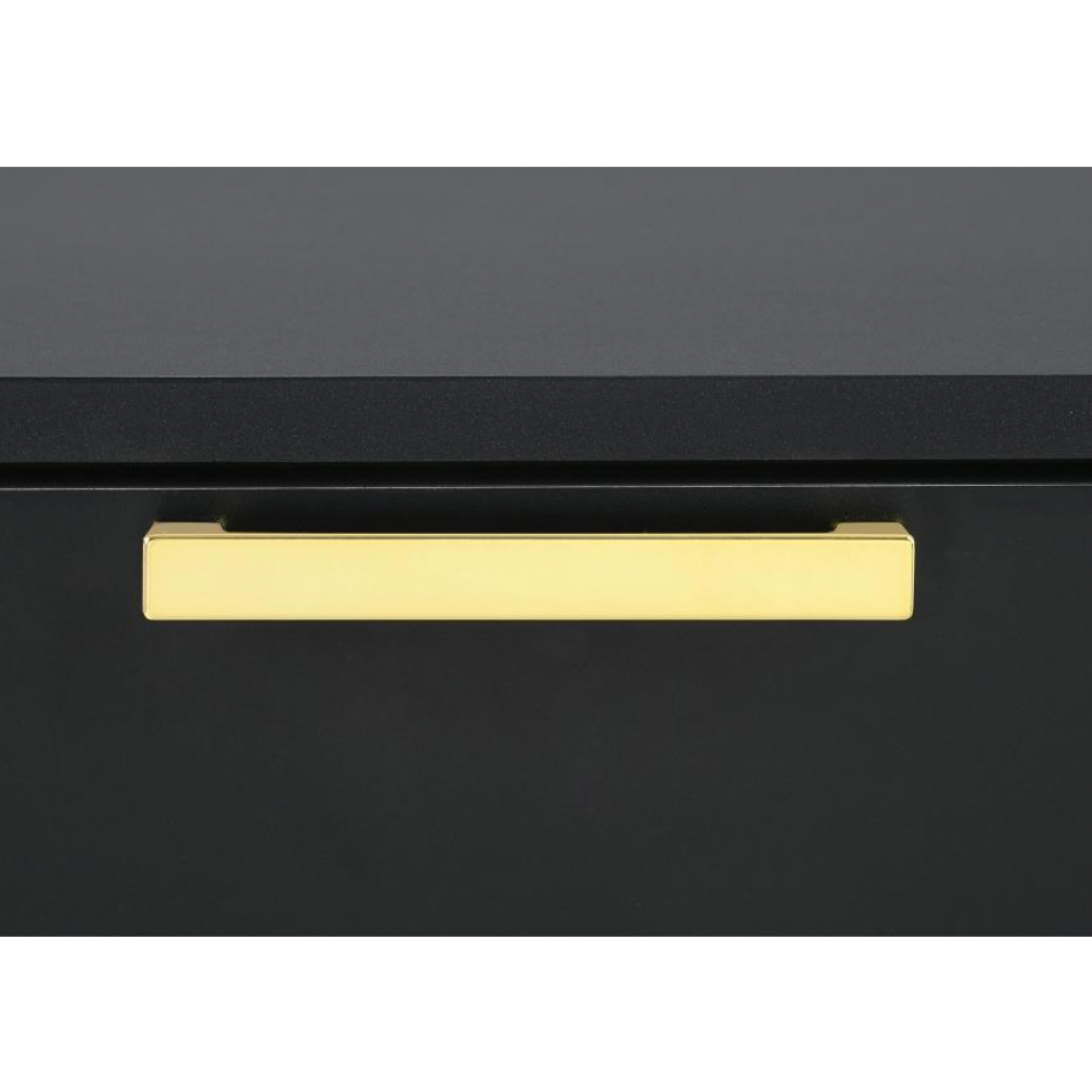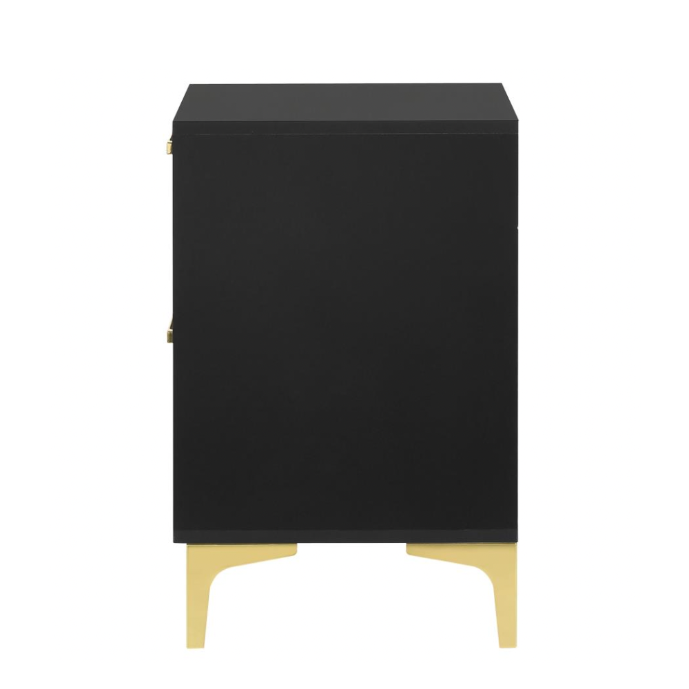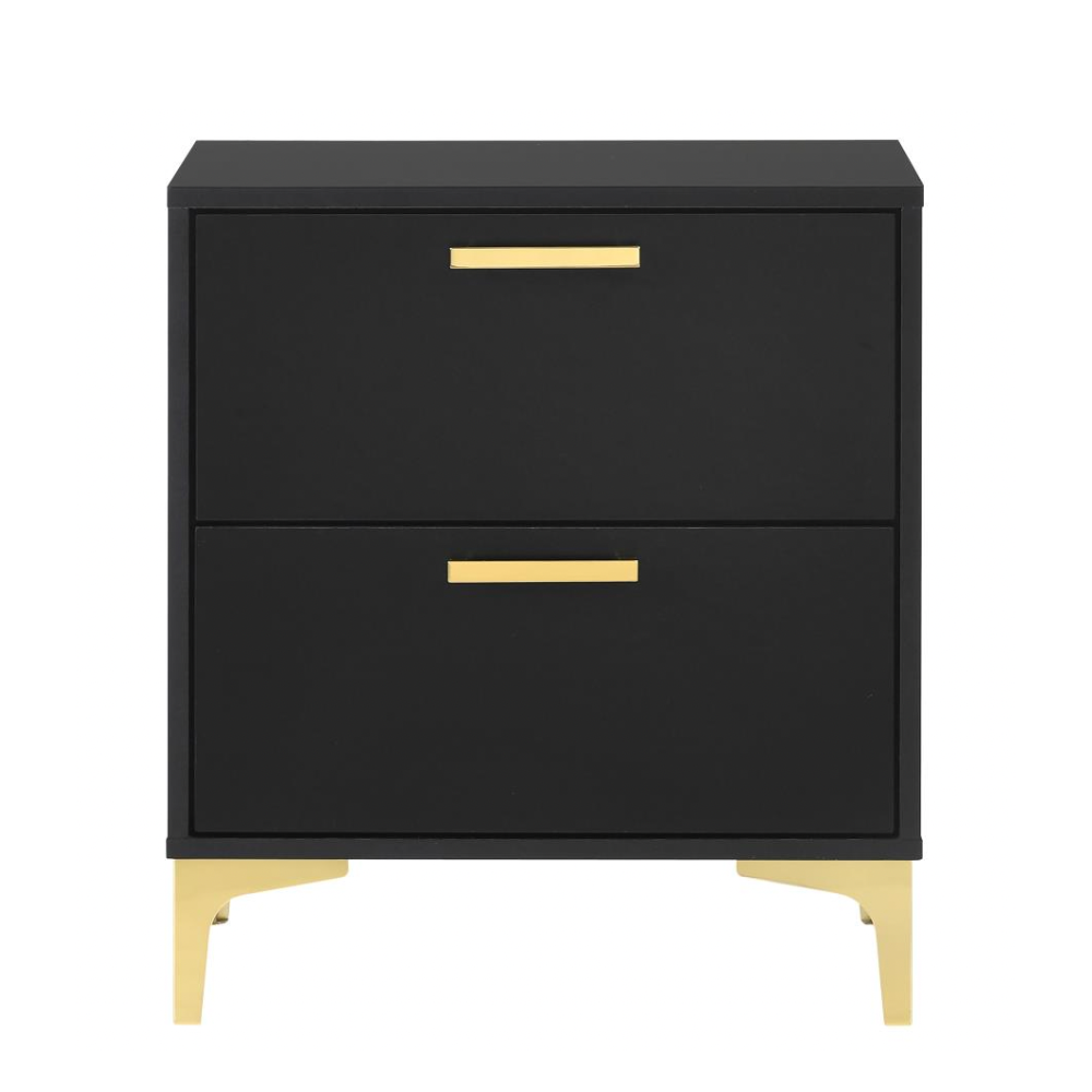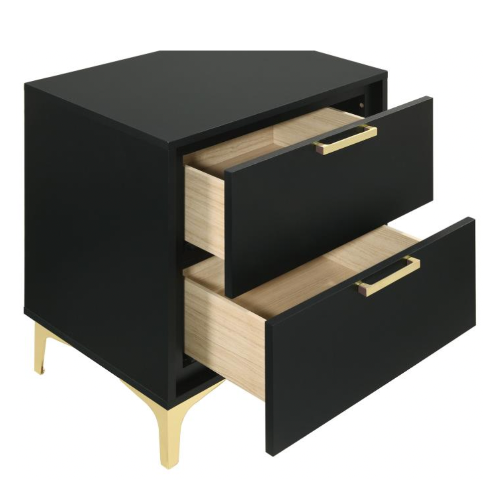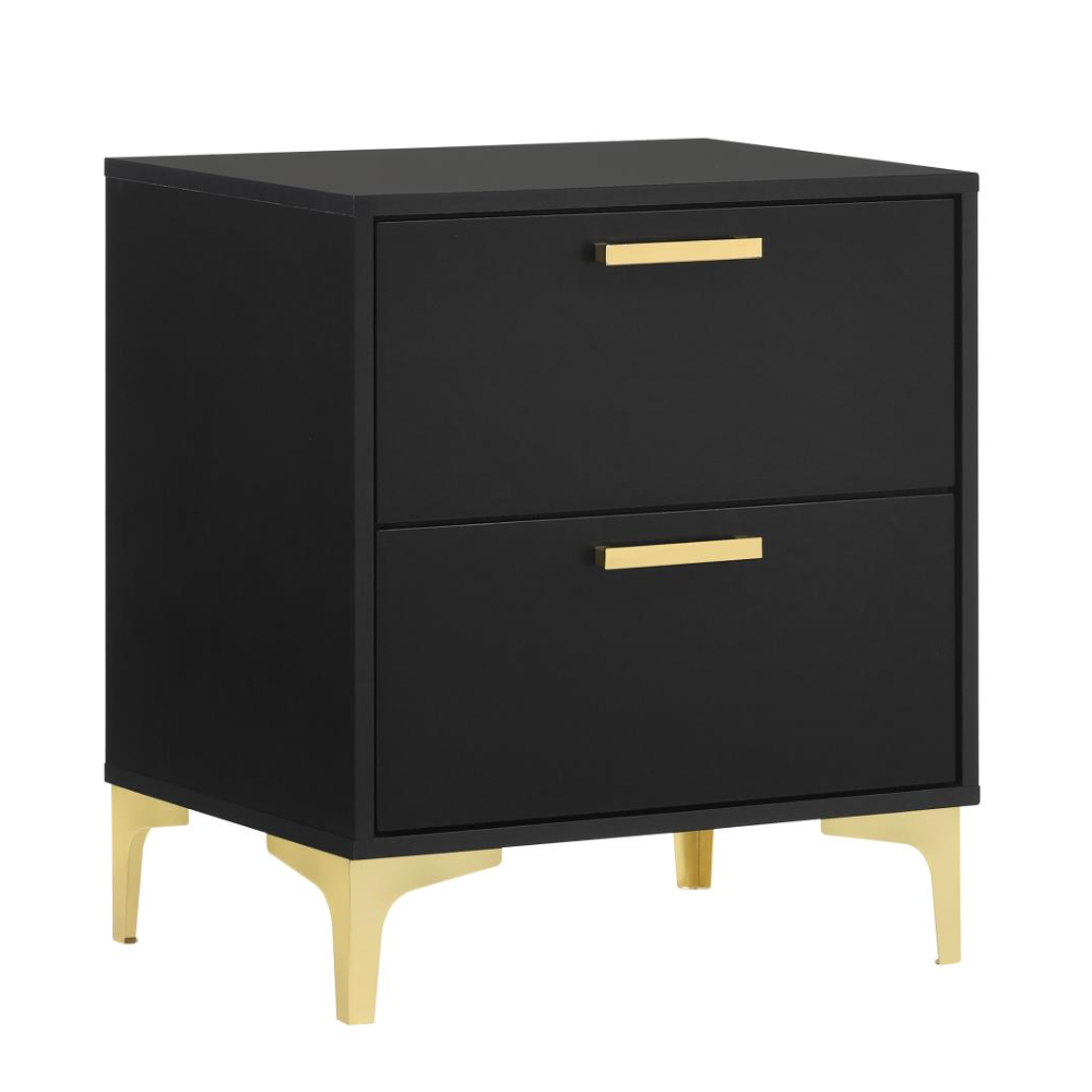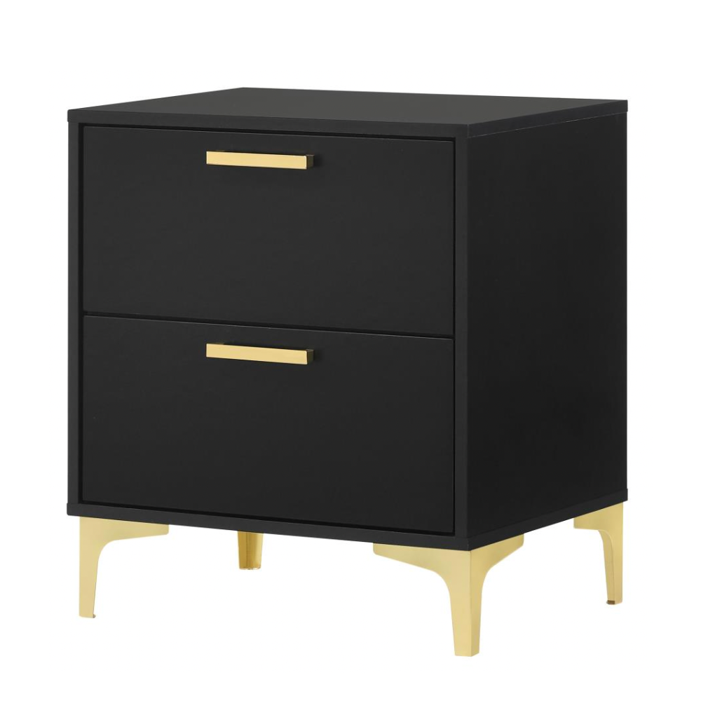 Flank your bed with this modern glam nightstand, featuring a bold black finish and a clean, boxy silhouette. Two deep drawers keep essentials within reach, accented by slender gold pulls for a chic metallic touch. Gold bracket legs complete the look, adding an industrial edge to this stylish bedside piece.