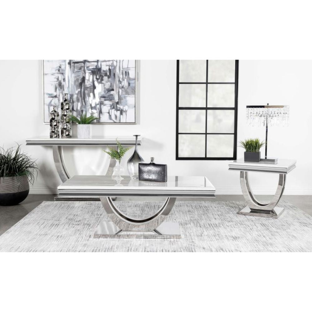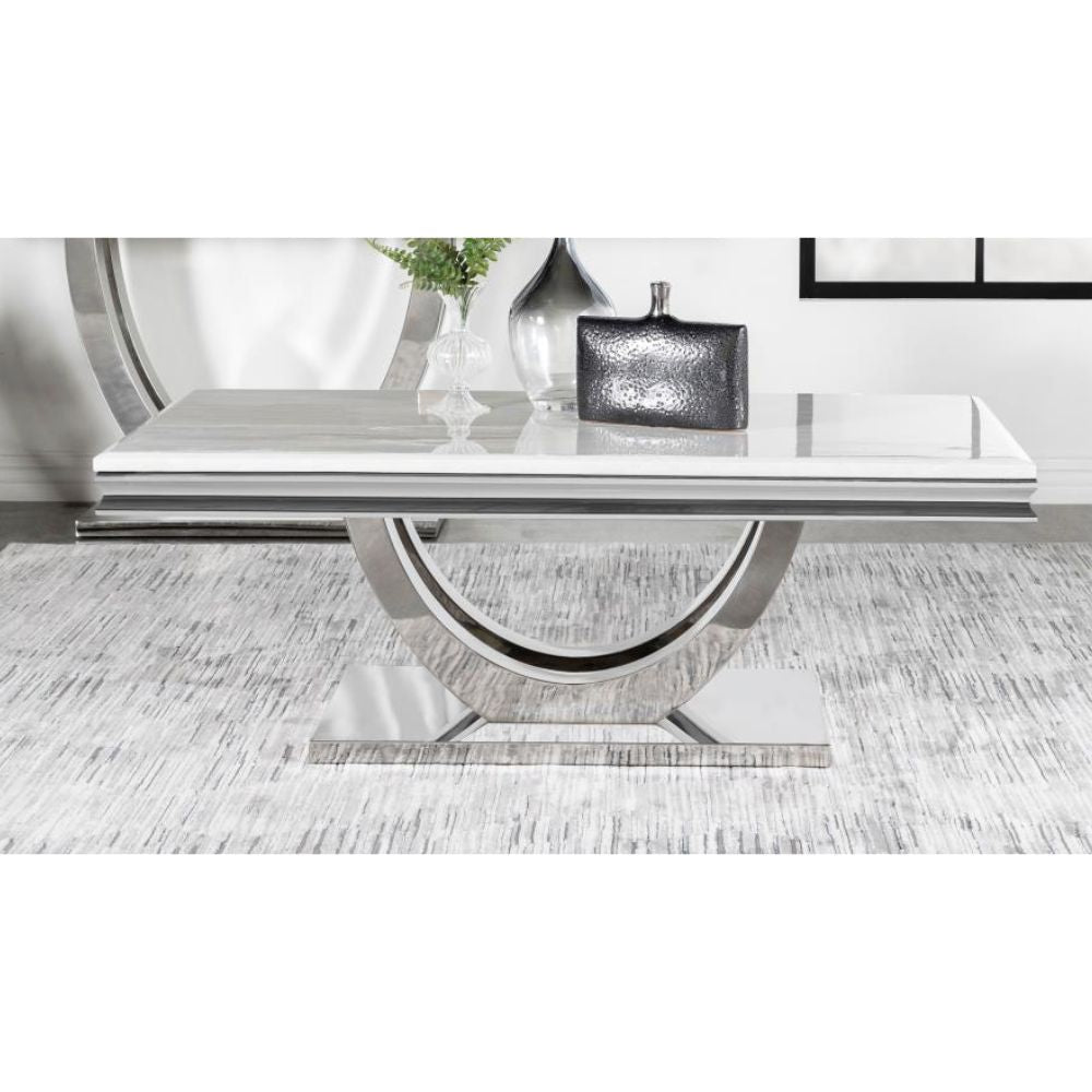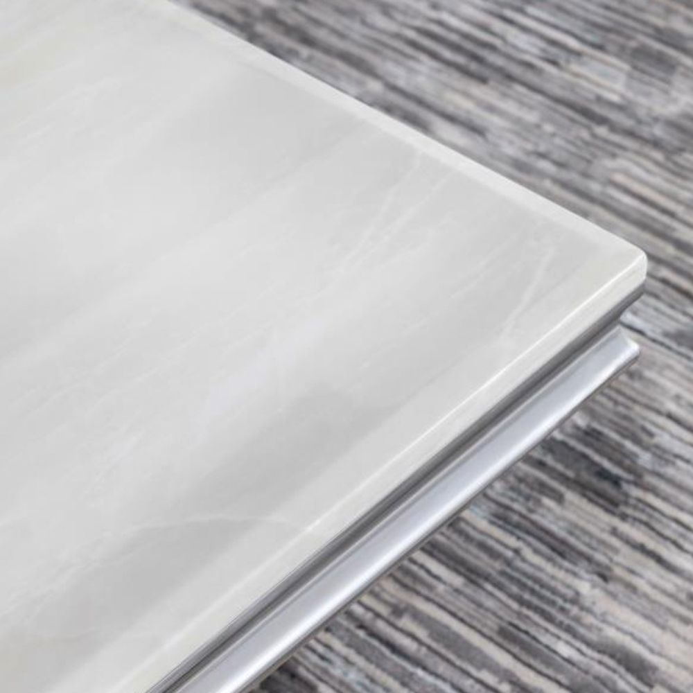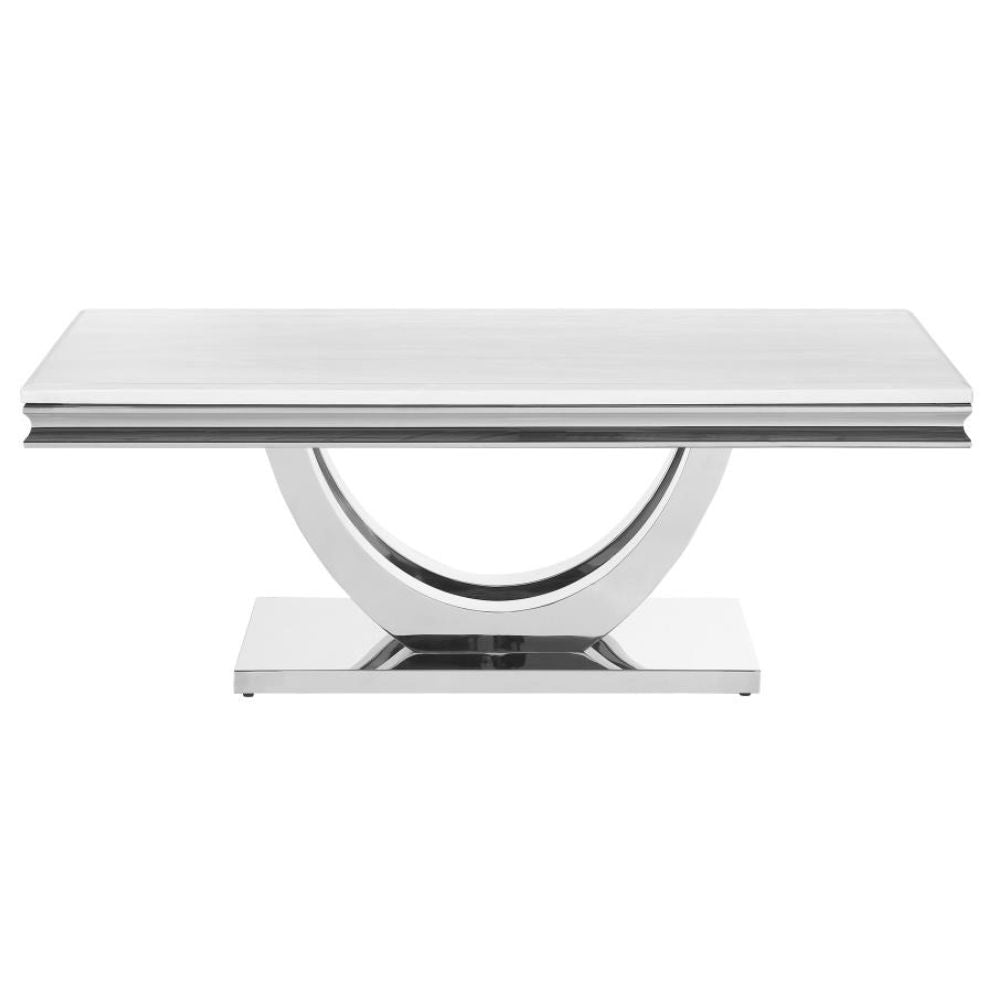 Transform your contemporary living room seating area with this modern glam coffee table. A large rectangle shaped top made of white engineered stone lends a timeless aesthetic with its marble-like resemblance. Two slender curved bars create a demilune shaped pedestal base that grounds the table and offers a sleek ultra-modern look and feel. Across the base is a gleaming polished chrome finish, reflecting everything around it. Around the edge of the tabletop is a softly beveled edge and contoured apron that creates a wonderful bit of texture and visual interest.