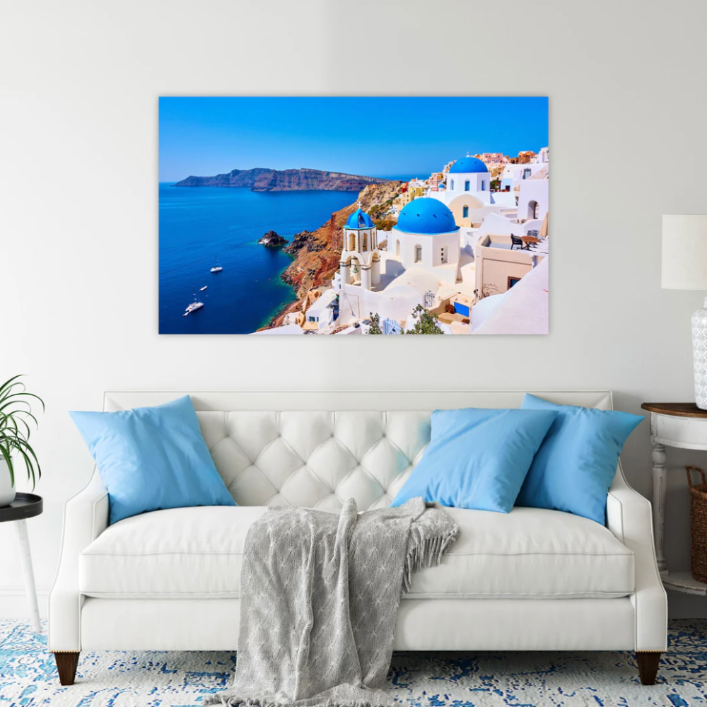 We all crave a breathtaking view, so why not bring it into your home? Featuring the iconic Blue Domed Churches in the Village of Oia, Santorini, this captivating art piece transports the serene beauty of Greece right into your living room or office. With its stunning Mediterranean charm and vibrant hues, this artwork is an essential focal point, adding elegance and tranquility to any space.